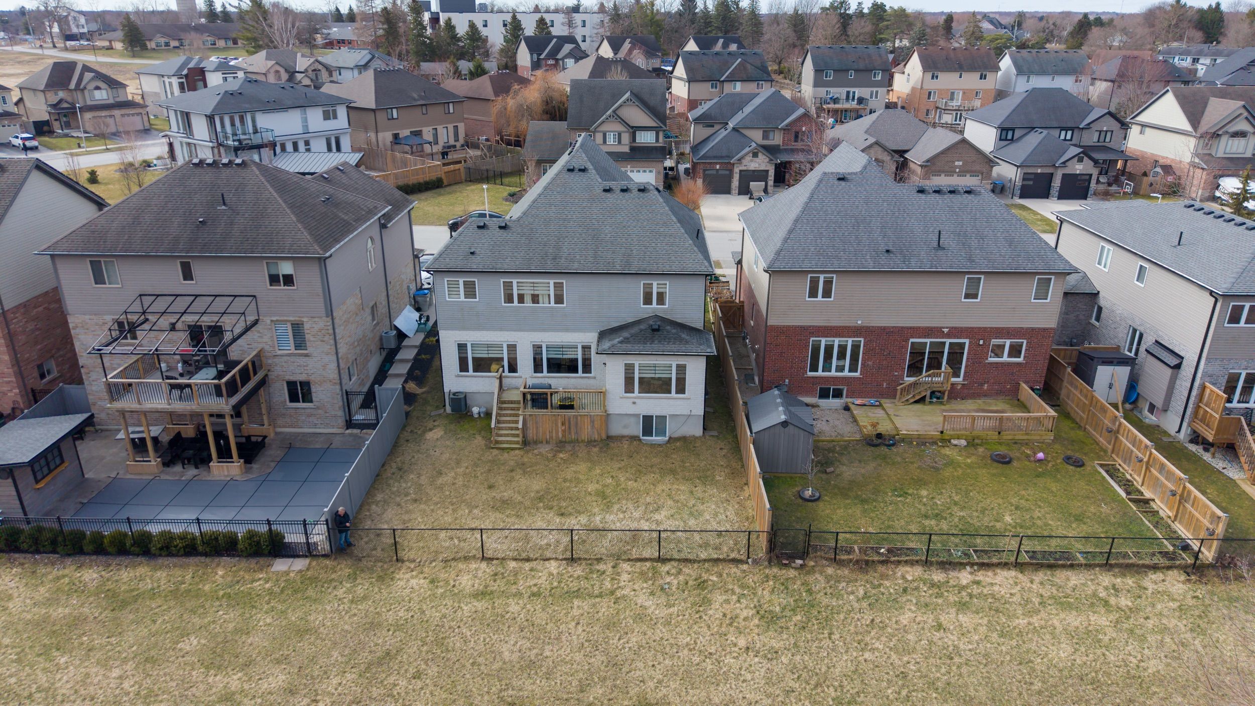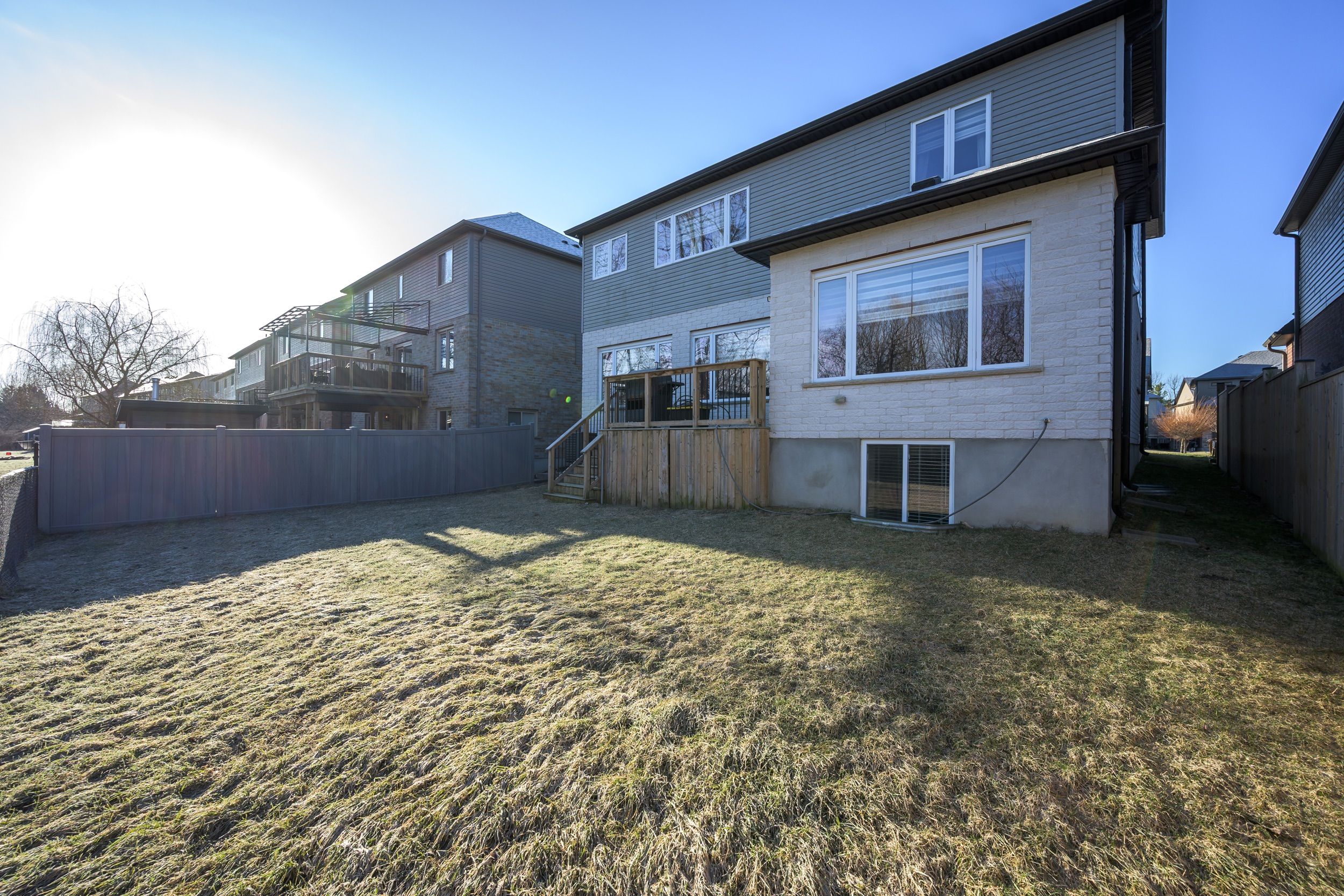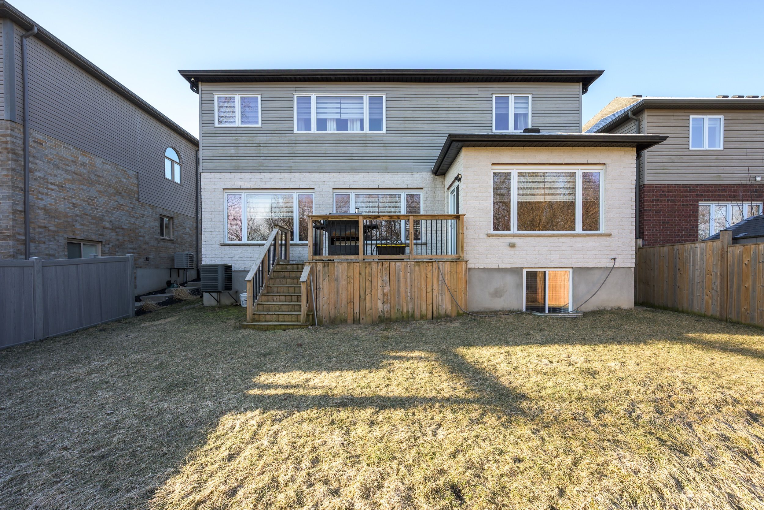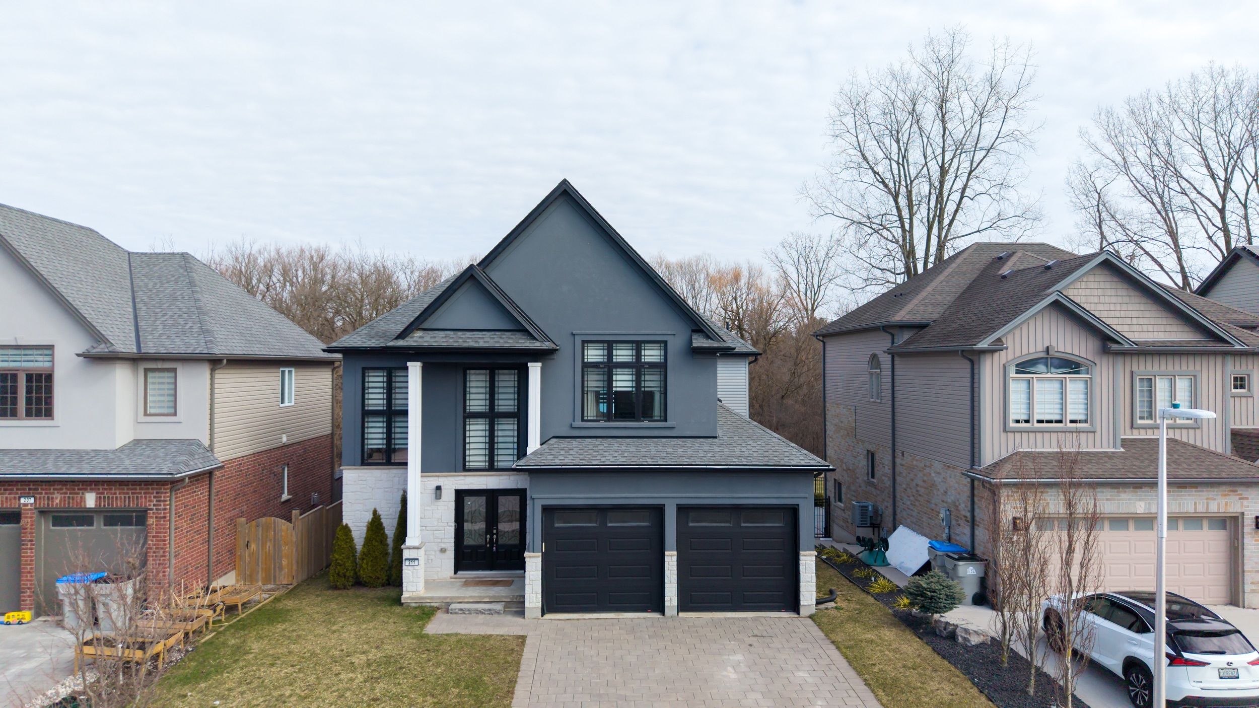 Welcome home at the impressive 211 union avenue in quiet komoka backing onto a green space. Modern and striking curb appeal stands apart with its deep hues, interlock brick drive, stone & stucco facade, and double-door front entry. Step into the soaring two-storey foyer beautifully illuminated by cascading chandeliers. The main floor offers a designated office space, a living room with a central gas fireplace - framed by a feature wall w/ linear stone wall niches with down lighting - and a sunshine-filled chef's kitchen + dining space featuring premium stainless steel appliances, a contrast centre island, quartz and granite surfaces, upscale pendant lighting and gleaming cabinetry, all overlooking the maturity of the green space, step-down deck, & fully fenced yard. 9' ceiling heights and gleaming hardwood throughout the main floor principal living areas as well. Four spacious bedrooms upstairs including the primary, which offers 2 walk-in closets and a spa inspired 5pc ensuite. 4pc common bath. The bright lower level offers an additional bedroom, recreation room, full bath, a wet-bar rough in, and plenty of storage. Painted in contemporary, neutral tones throughout. Design and stunning attention to detail throughout. Bright open spaces and elevated finishes.