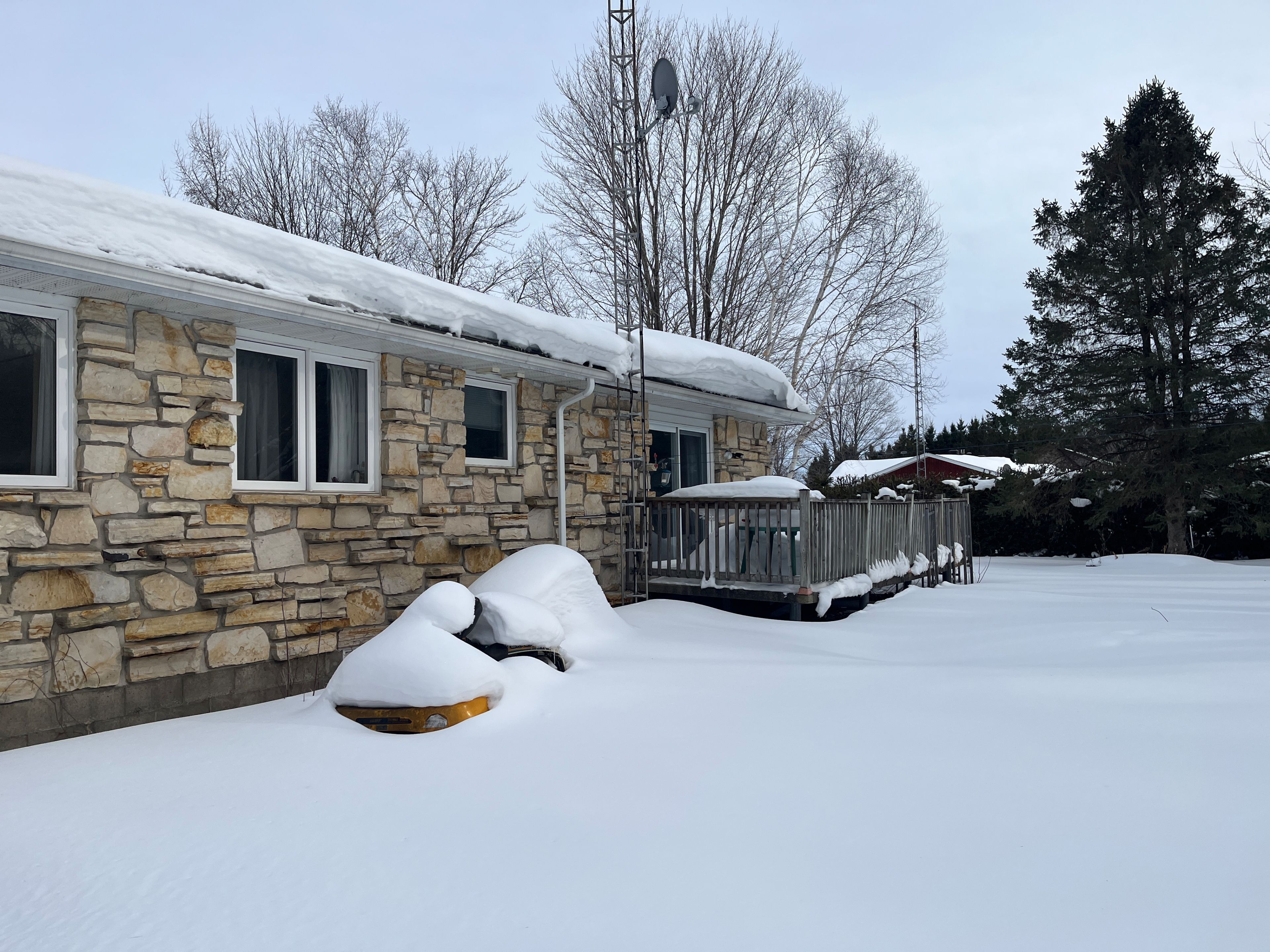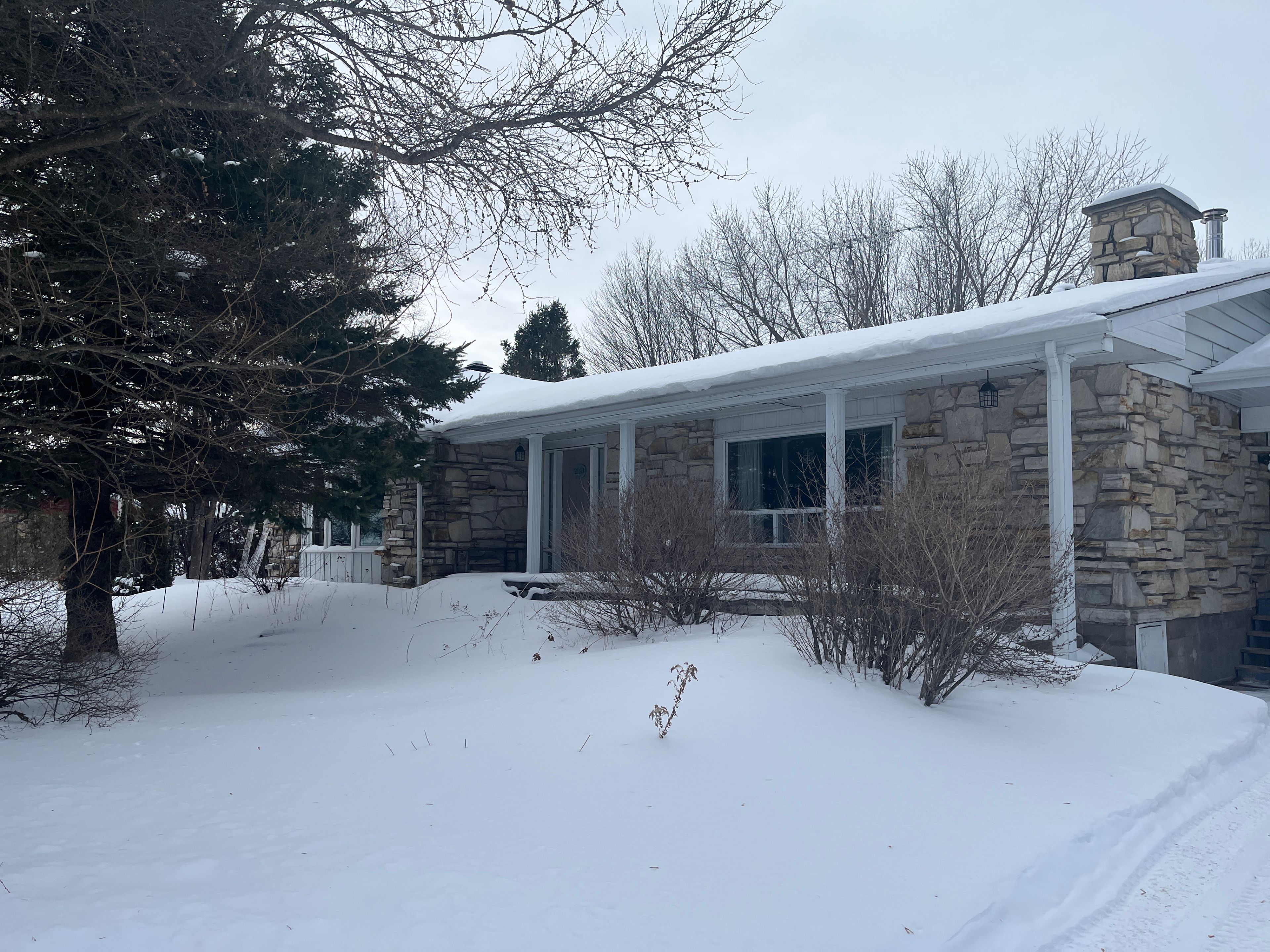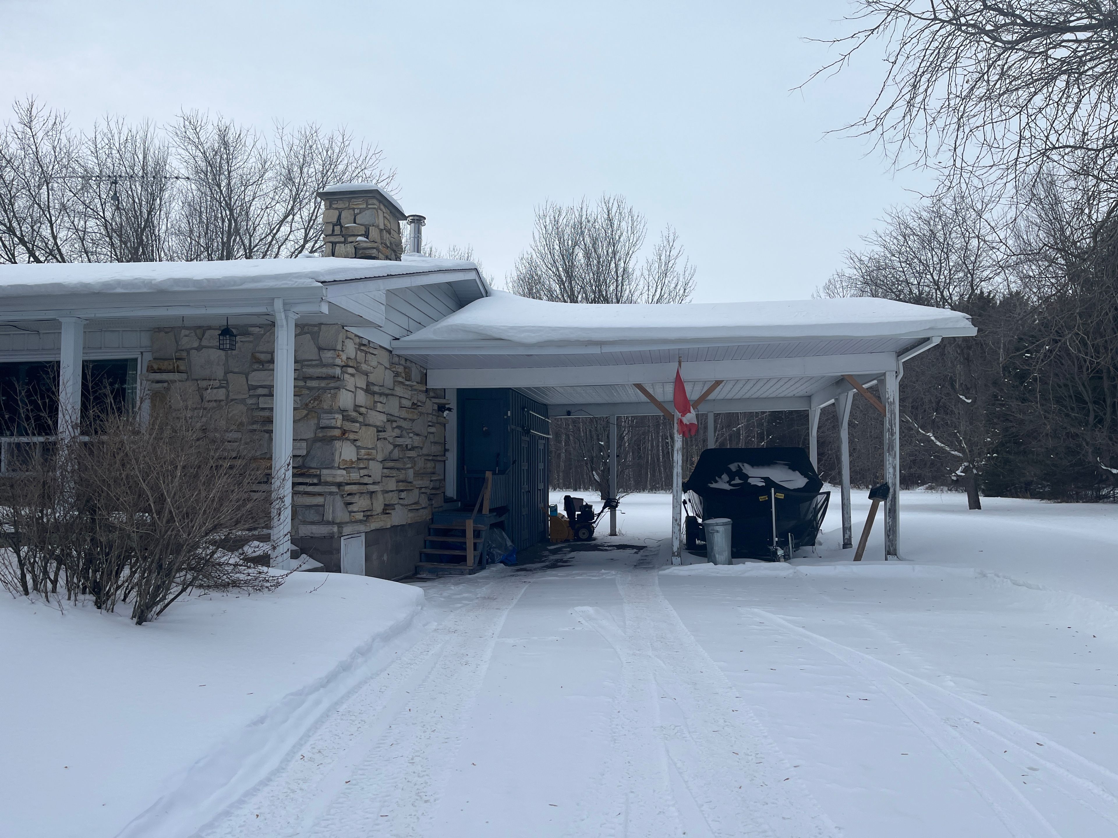 Charming 3-bedroom stone bungalow with 2 covered carport spaces nestled on a spacious lot of 200' x 400' in a peaceful country setting with mature trees and no rear neighbors. As you walk through the front door you will find a lovely foyer with closet space. Off to the left is an oversize open kitchen which is combine with the dining area that displays plenty of cabinets with some appliances which are included and a beautiful bow window projecting sunshine within the room. The cozy living room also has a very large window and a wood burning fireplace. The primary bedroom has its own 5 pcs ensuite and patio door leading to a very spacious concrete deck. A 3 pcs bathroom is practically located in the hallway. Laundry area is also conveniently located on the main level and has plenty of cupboard space, double laundry tubs and includes the washer & dryer. Hardwood and ceramic flooring throughout main level except for the 3 bedrooms (carpet). The lower level offers a full unfinished basement with so much potential, opportunities and endless possibilities to add more living space to your home. Force air heat pump with electric backup (2023). There is also a forced air wood furnace as a backup. Electric 40-gallon hot water heater owned (2023). Electrical panel 200 amps replaced in 2024. Roof shingles replace in 2023. Private gravel driveway, plenty of parking, even a perfect fit for your rv. 24 hours irrevocable on all offers. Enjoy the tranquility of country living with easy access to nearby amenities and major highways! Don't just drive by, call for a visit!!