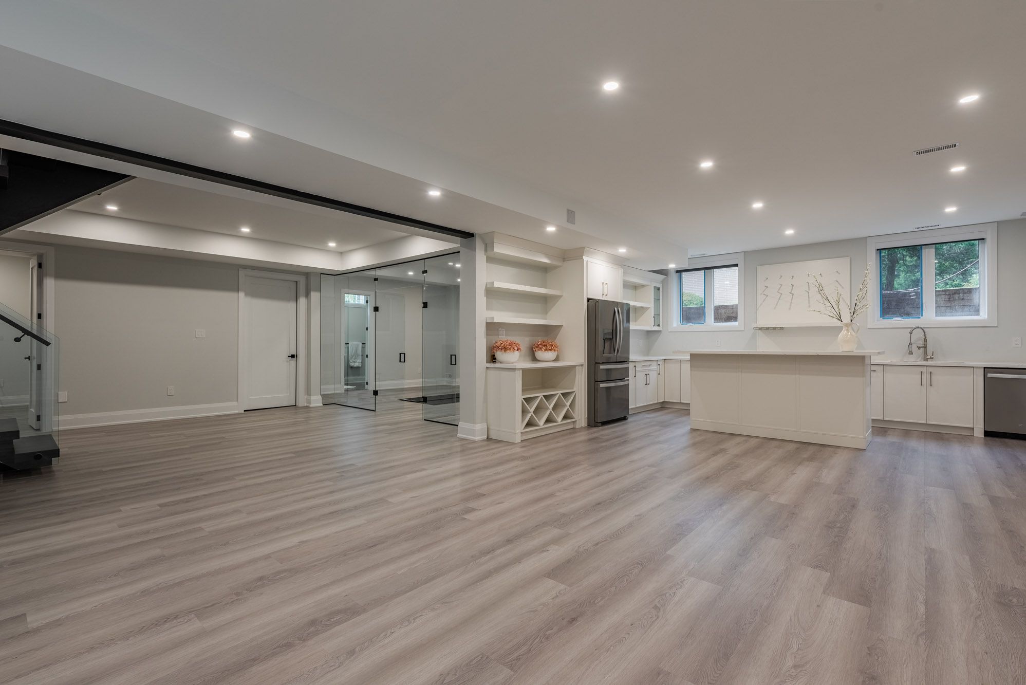 • Finished lower level with home gym, sauna, wet bar, and theatre.