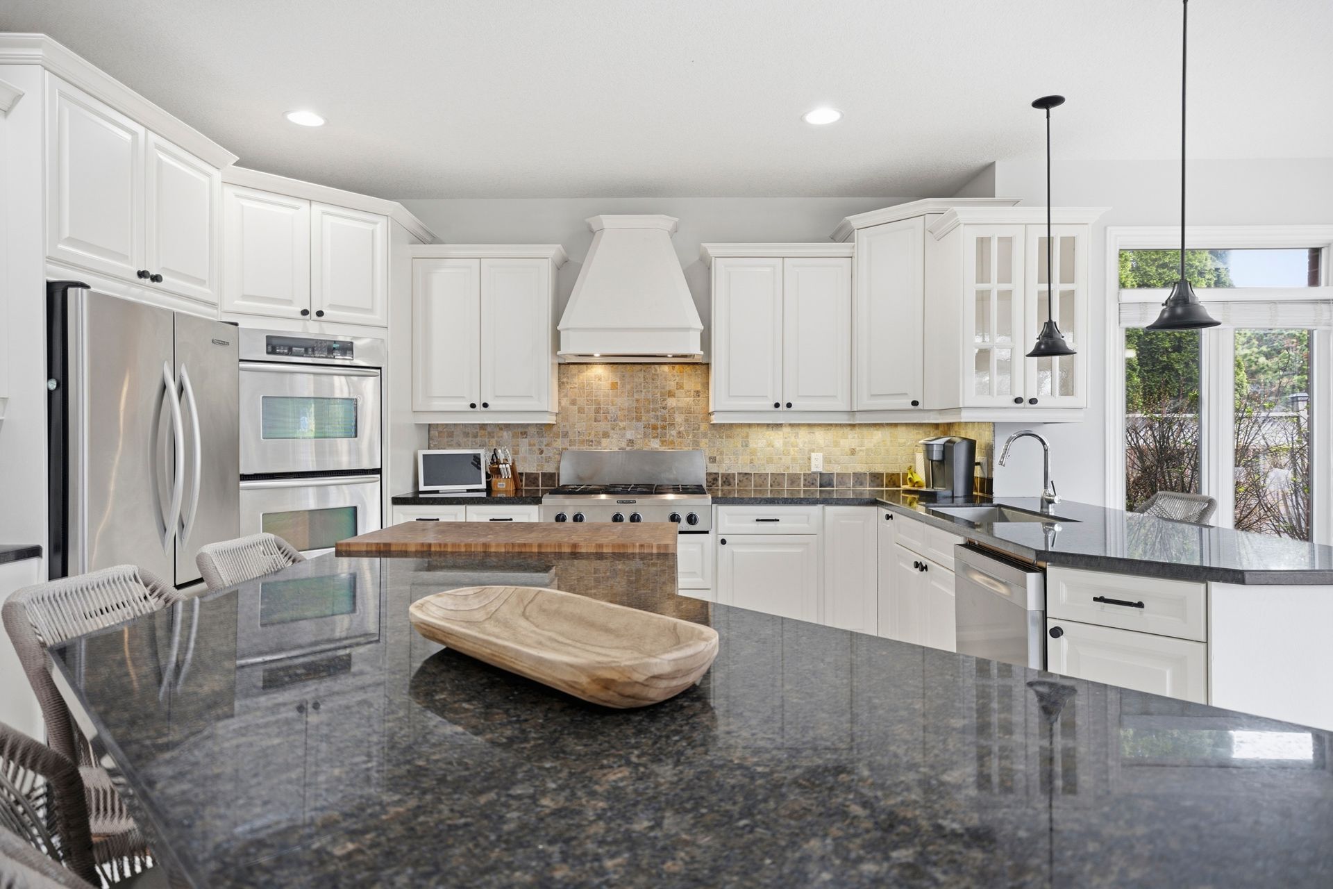 • Private backyard features a heated pool, deck, and outdoor kitchen.