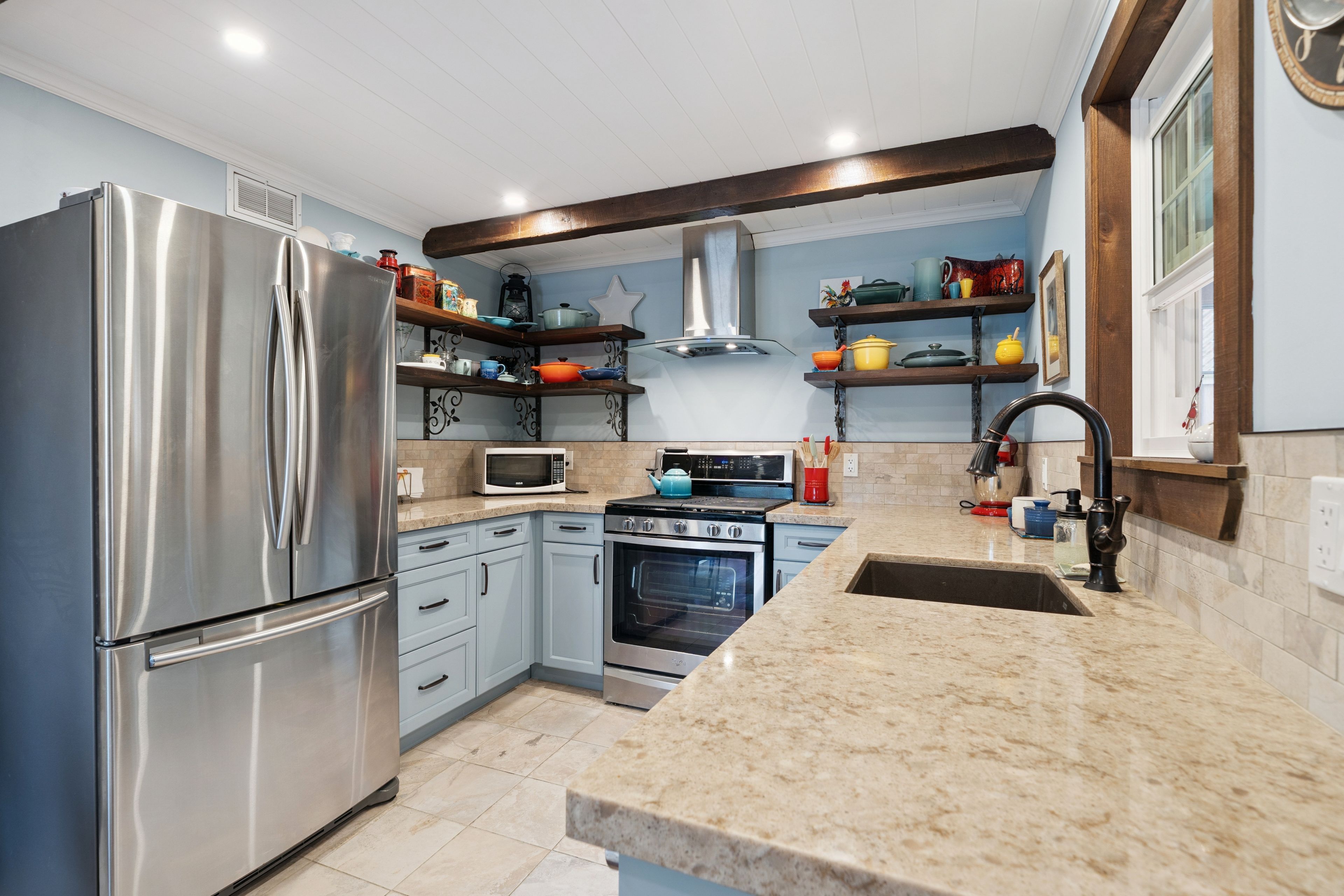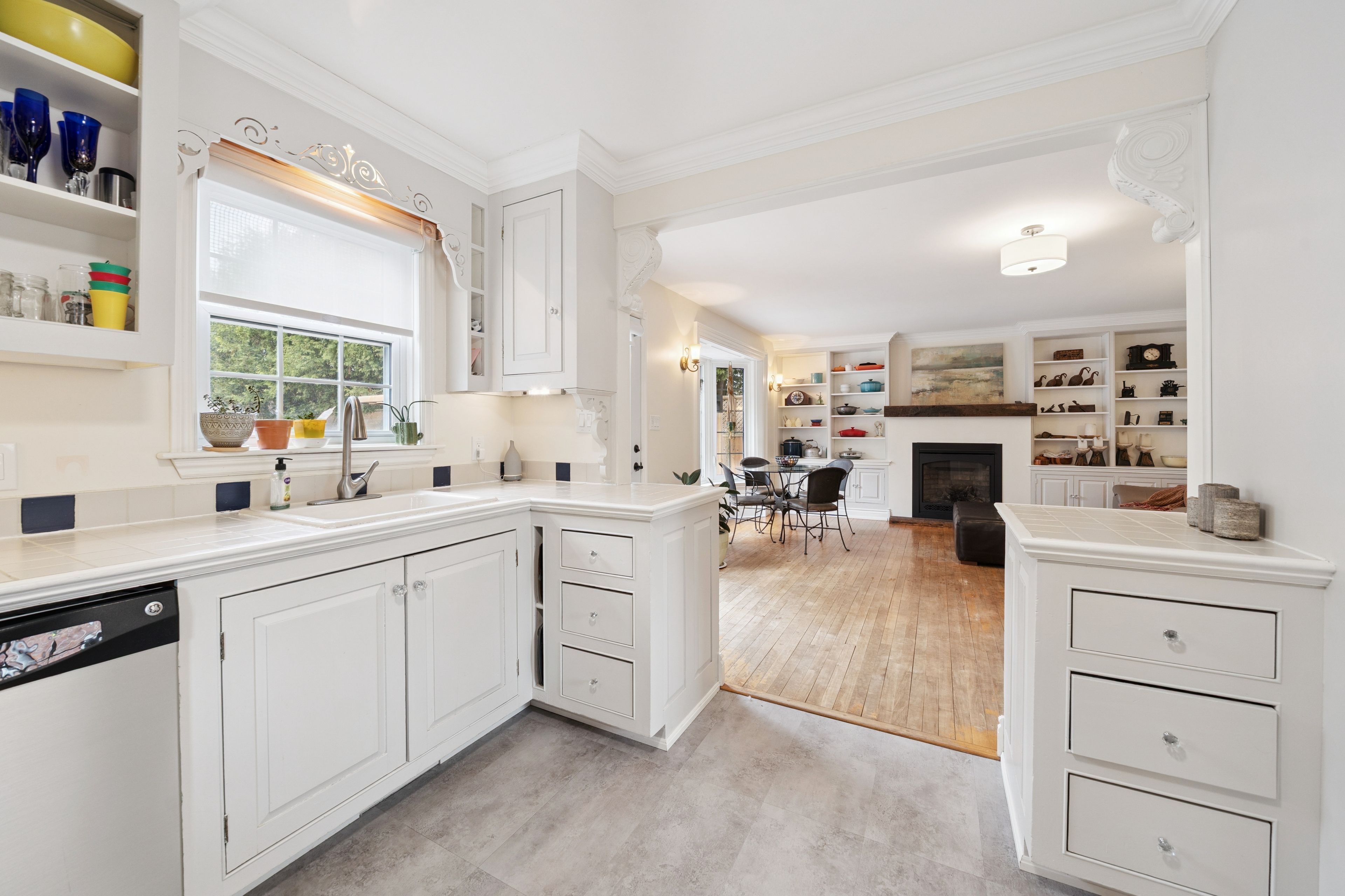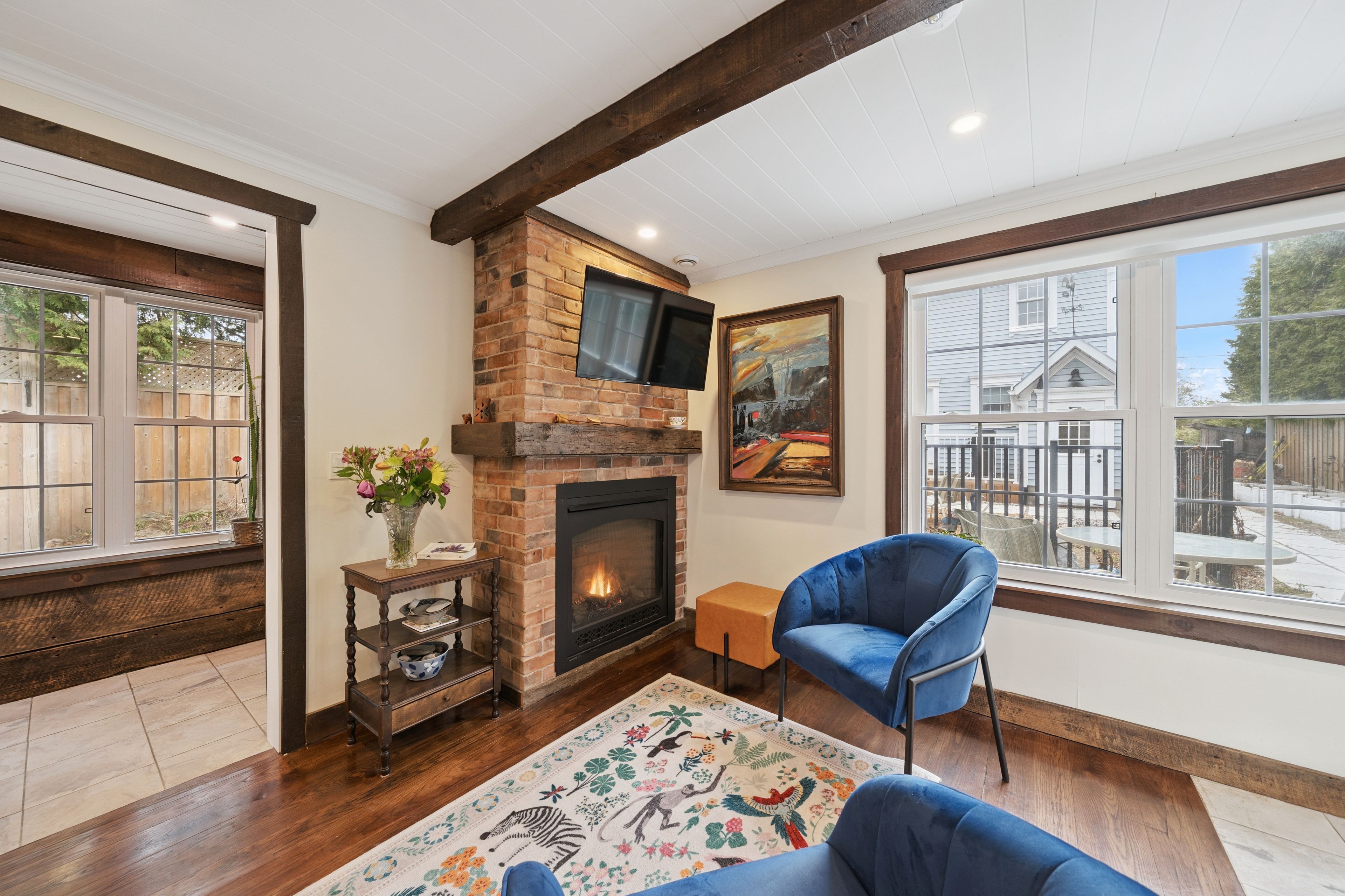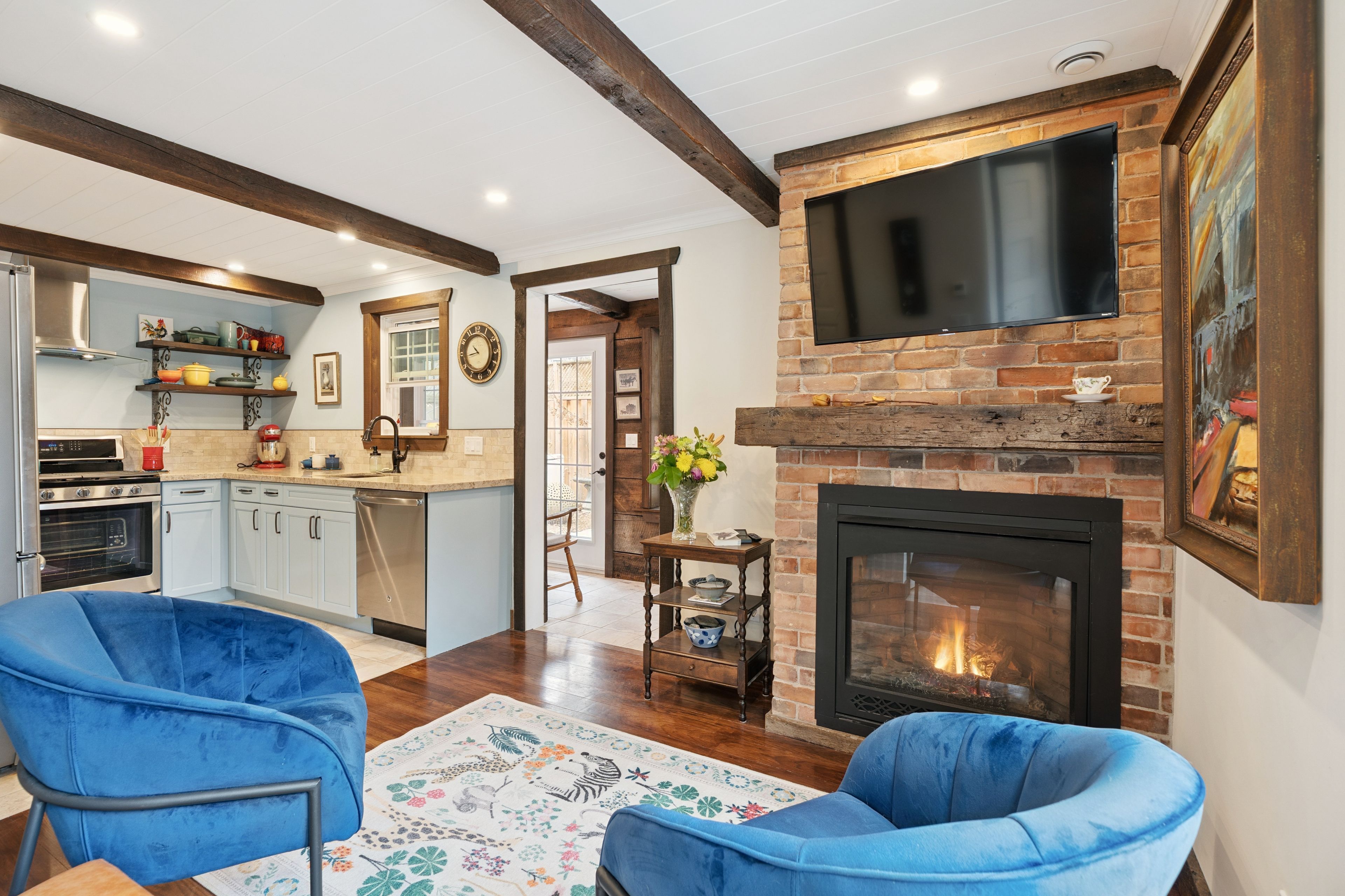 • Spacious main house with open-plan kitchen and cozy gas fireplace.