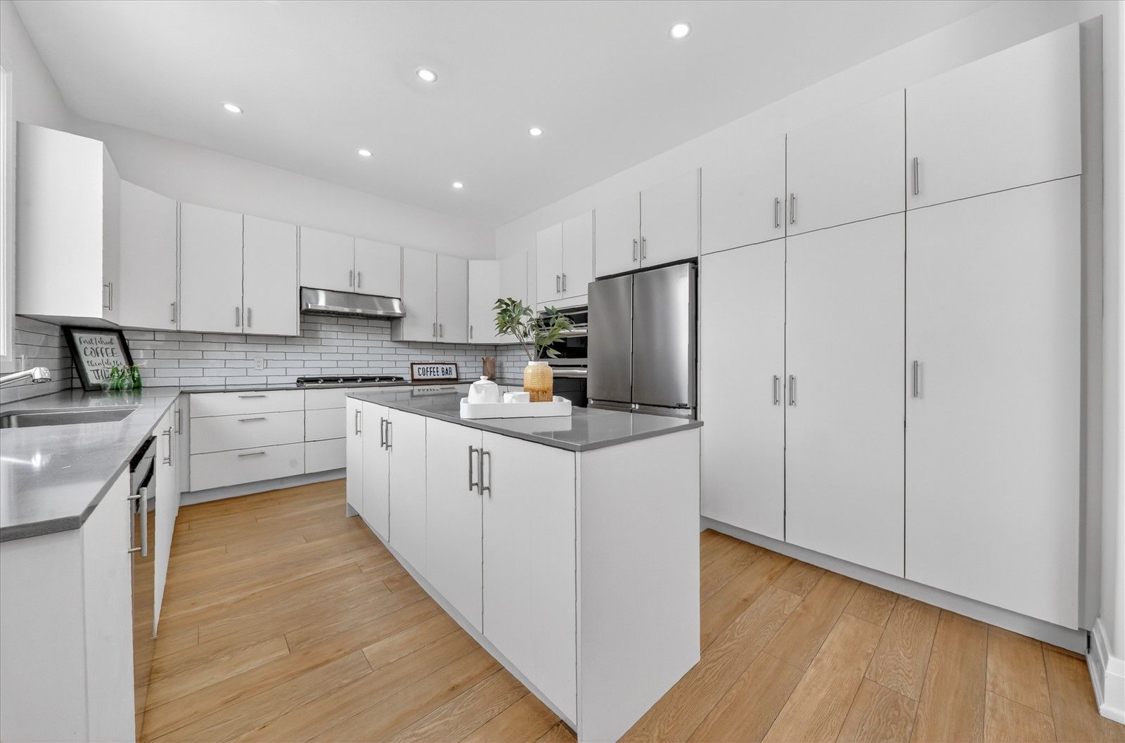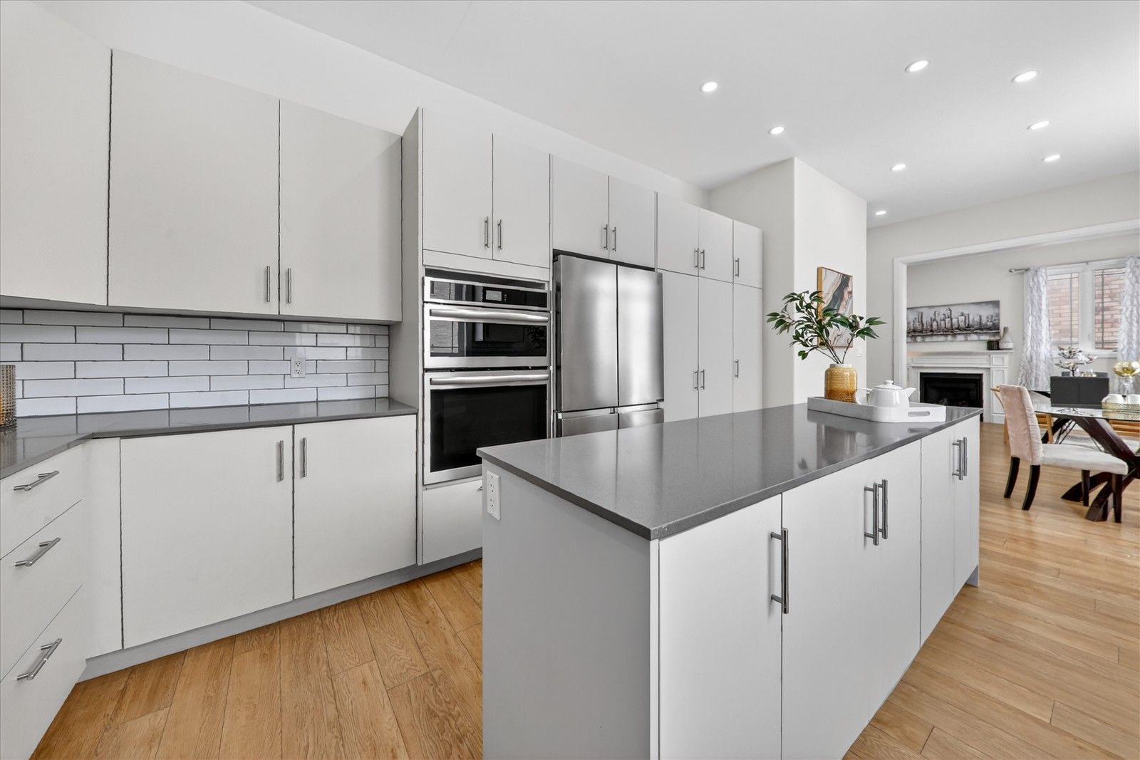 • Open concept kitchen with modern cabinetry and stainless-steel appliances.