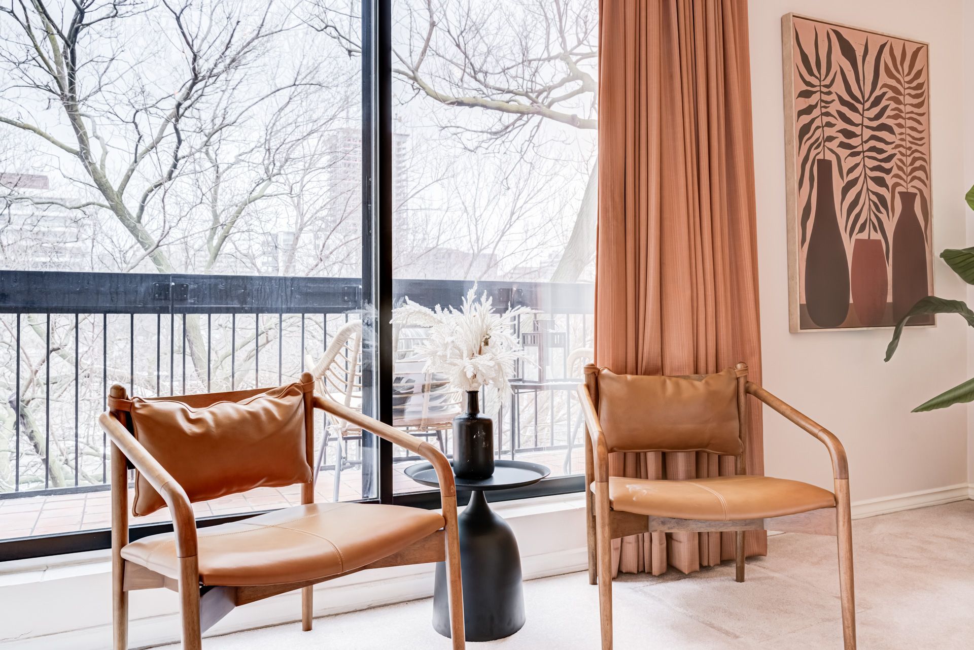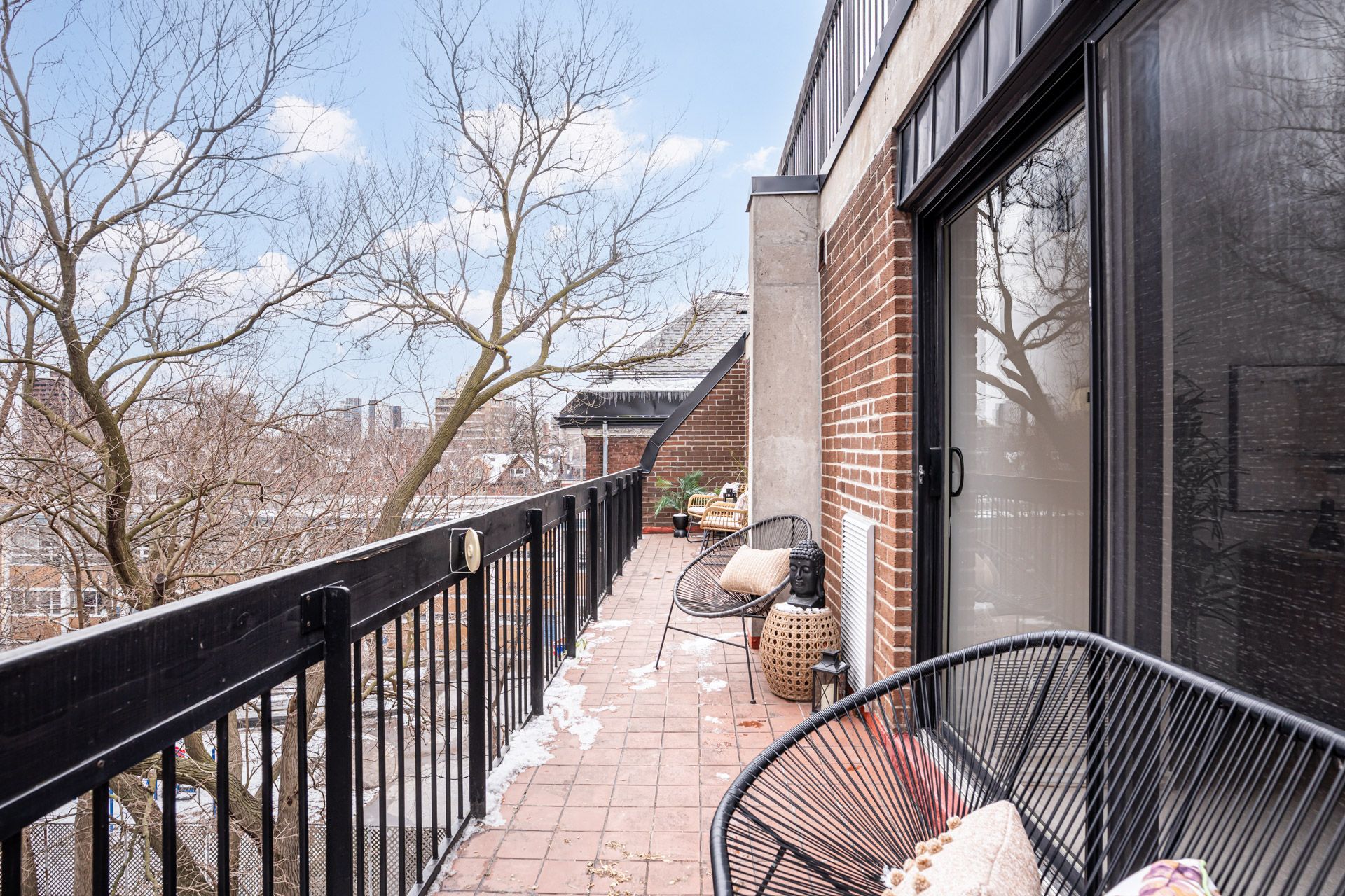 Set within the heritage powell house, this intimate 41-unit building is rooted in toronto history. Originally built in 1907 and converted in the 1980s, this edwardian landmark carries a quiet sense of history and grace. Suite 503 is a 2-bedroom, 2-bath corner penthouse with high ceilings and a bright, open-concept layout, including a 37 ft south-facing corner balcony that spans the full length of the unit. With ease, the kitchen flows into the living and dining area, creating a space that feels both thoughtful and functional. Floor-to-ceiling windows fill the suite with soft natural light, while two walkouts from the living room and primary bedroom enhance its openness. The primary bedroom is generously sized, with a 4-piece ensuite and double closets. The second bedroom is equally inviting, complete with a large window and closet. The building is well-maintained and offers a heated driveway to underground parking, along with a gym, sauna, coin laundry, and a rooftop terrace with city views. Welcome to a home with presence, history, and quiet refinement.
