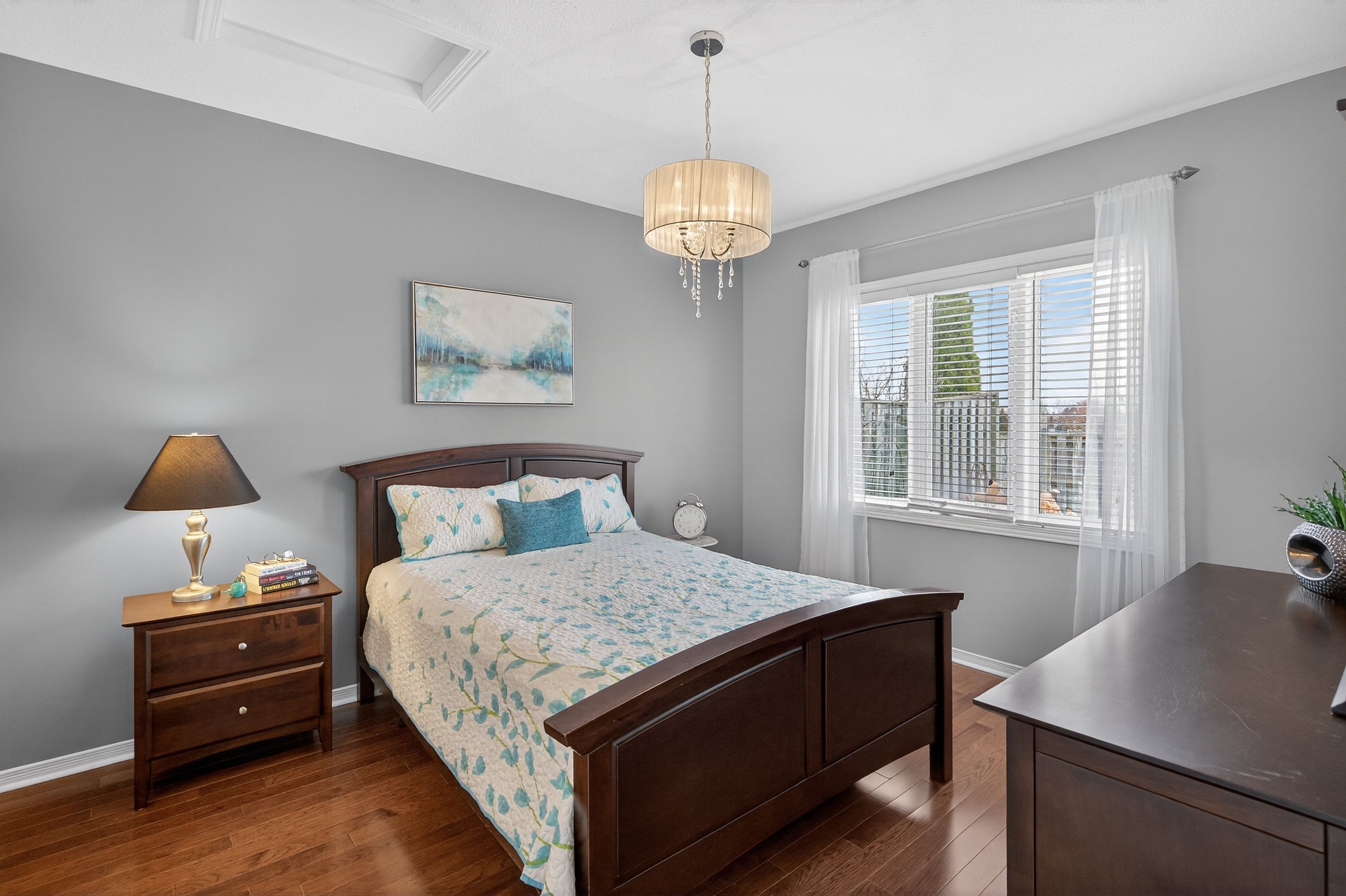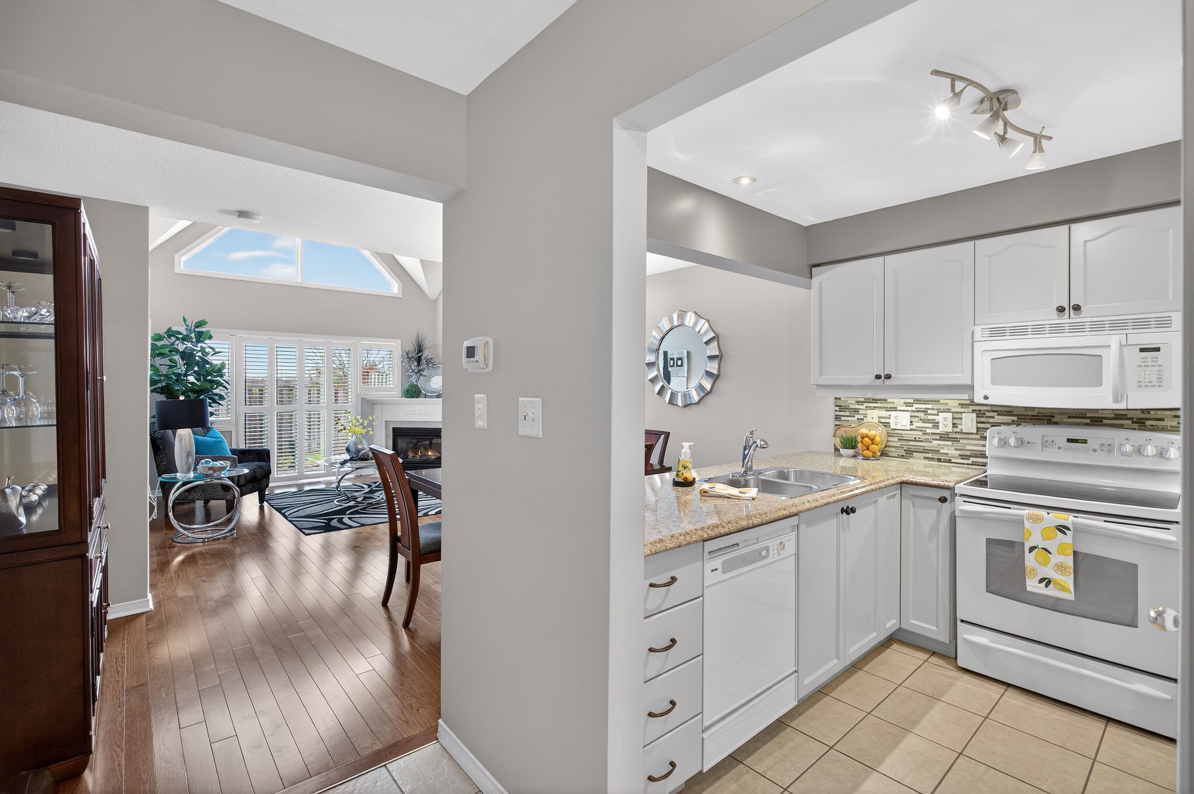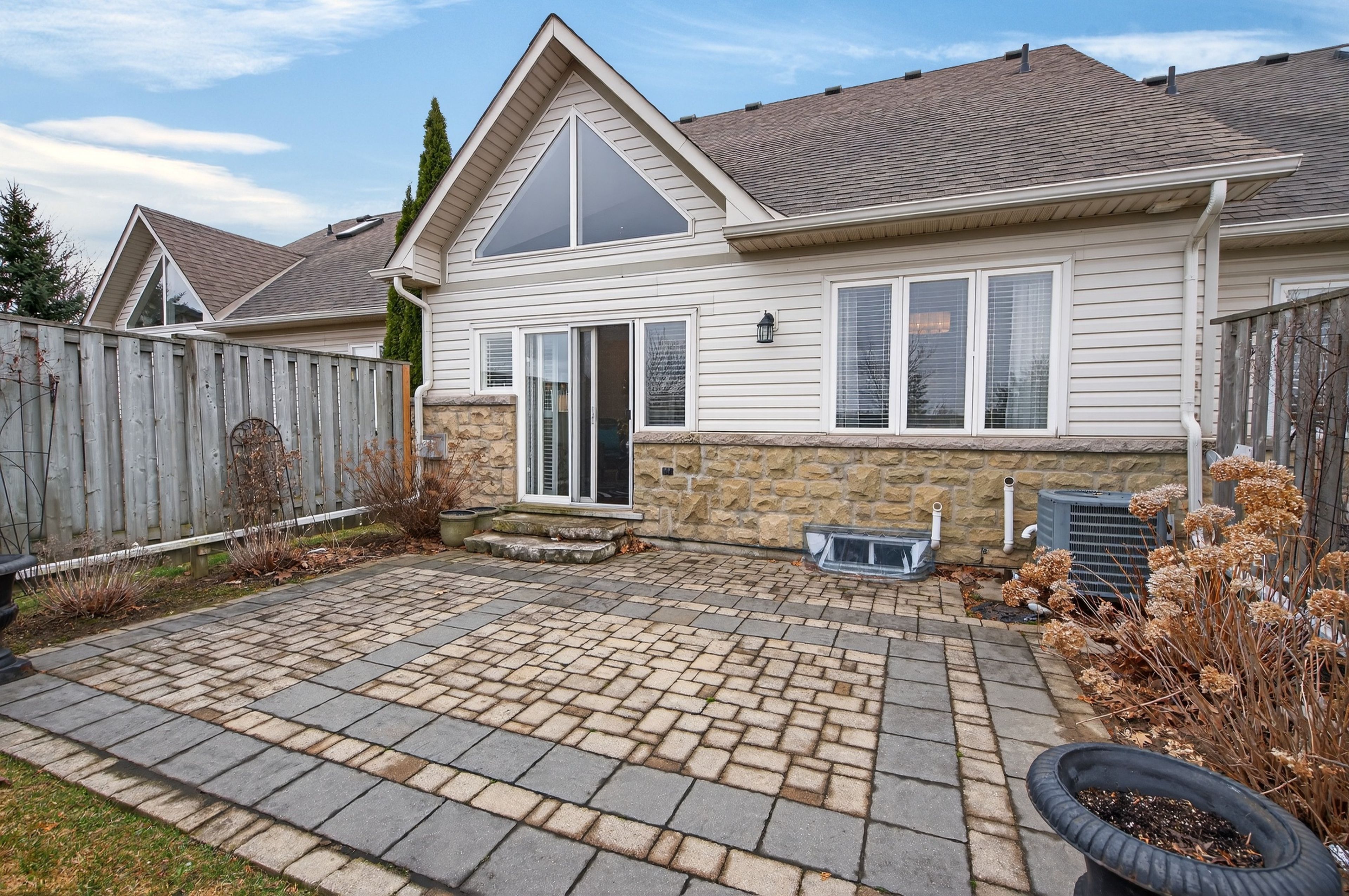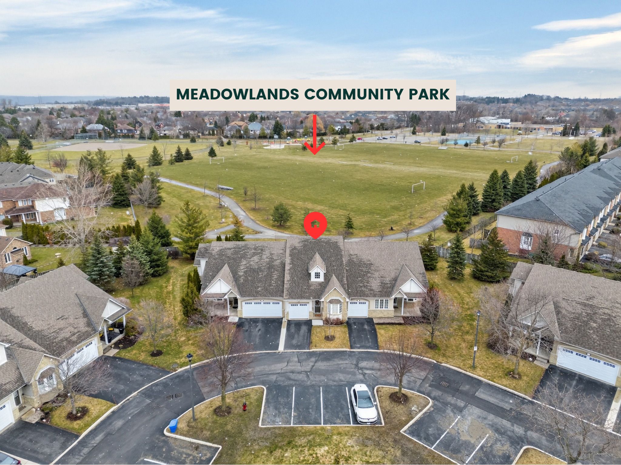Located in a quiet, well-maintained and highly desirable complex, this 3 bdrm, 2. 5 bath executive bungaloft offers low-maintenance living in the coveted town of ancaster. The attractive ext showcases timeless stone accents, a charming bay window, a covered front porch, & an upper dormer. The property also feat surfaced parking plus a 1-car grg w/ inside entry. Stepping through the front door with bonus phantom screen, a bright & welcoming foyer leads to a thoughtfully designed open-concept layout, feat a well-appointed kitch w/ ample cabinetry & pot lighting. The kitch flows seamlessly into a spacious din area & the stunning liv rm w/ vaulted ceil & oversized windows, cali shutters, & a cozy corner gas fp. Sliding doors lead to a private interlock patio, offering a peaceful outdoor retreat. The main flr is designed for convenient 1 lvl living, feat a front bdrm w/ flex for guests or a home office, a powder rm, main flr laund, & a well-appointed primary w/ dbl closets and an updated 3-piece ensuite with an oversized glass walk-in shower and additional storage cabinetry. Upstairs, the open loft provides a versatile multi-purpose space overlooking the main level, perfect for a variety of purposes. A spacious second-level bedroom offers a walk-in closet and a full 4-piece ensuite, making it an ideal secondary primary suite. The bsmt lvl feat a finished hallway leading to an unspoiled area with a bathroom rough-in, offering excellent potential for future customization. Backing directly onto meadowlands community park with no immediate rear neighbours, this rare offering provides added privacy and a premium setting. Additional highlights include visitor parking, roof shingles replaced approximately 6 years ago, and updated furnace/central air conditioning. Enjoy the convenience of living just minutes to top-rated schools, shopping centres, restaurants, walking trails, parks, and major highway access - all within the highly sought-after meadowlands community of ancaster.
