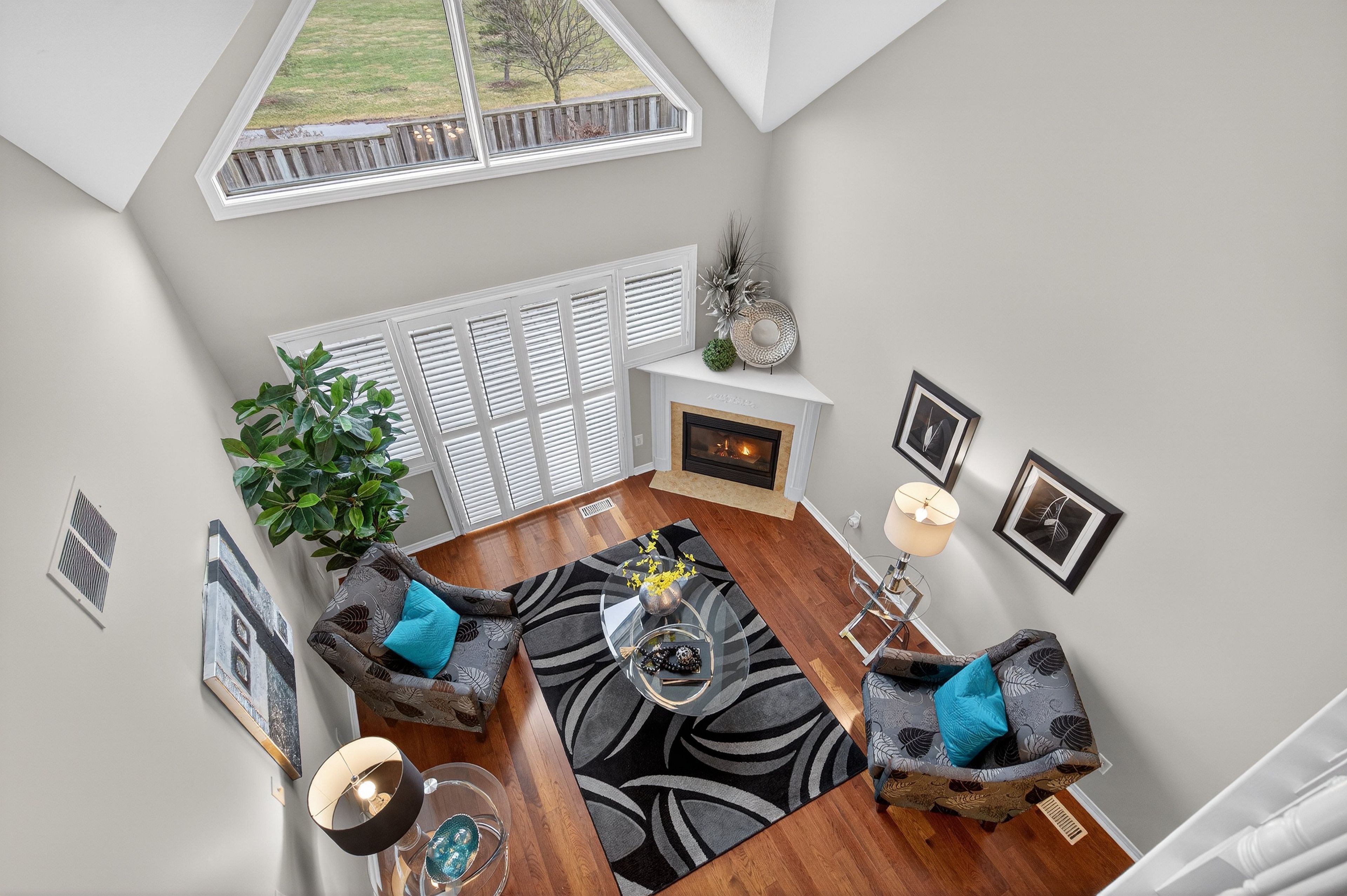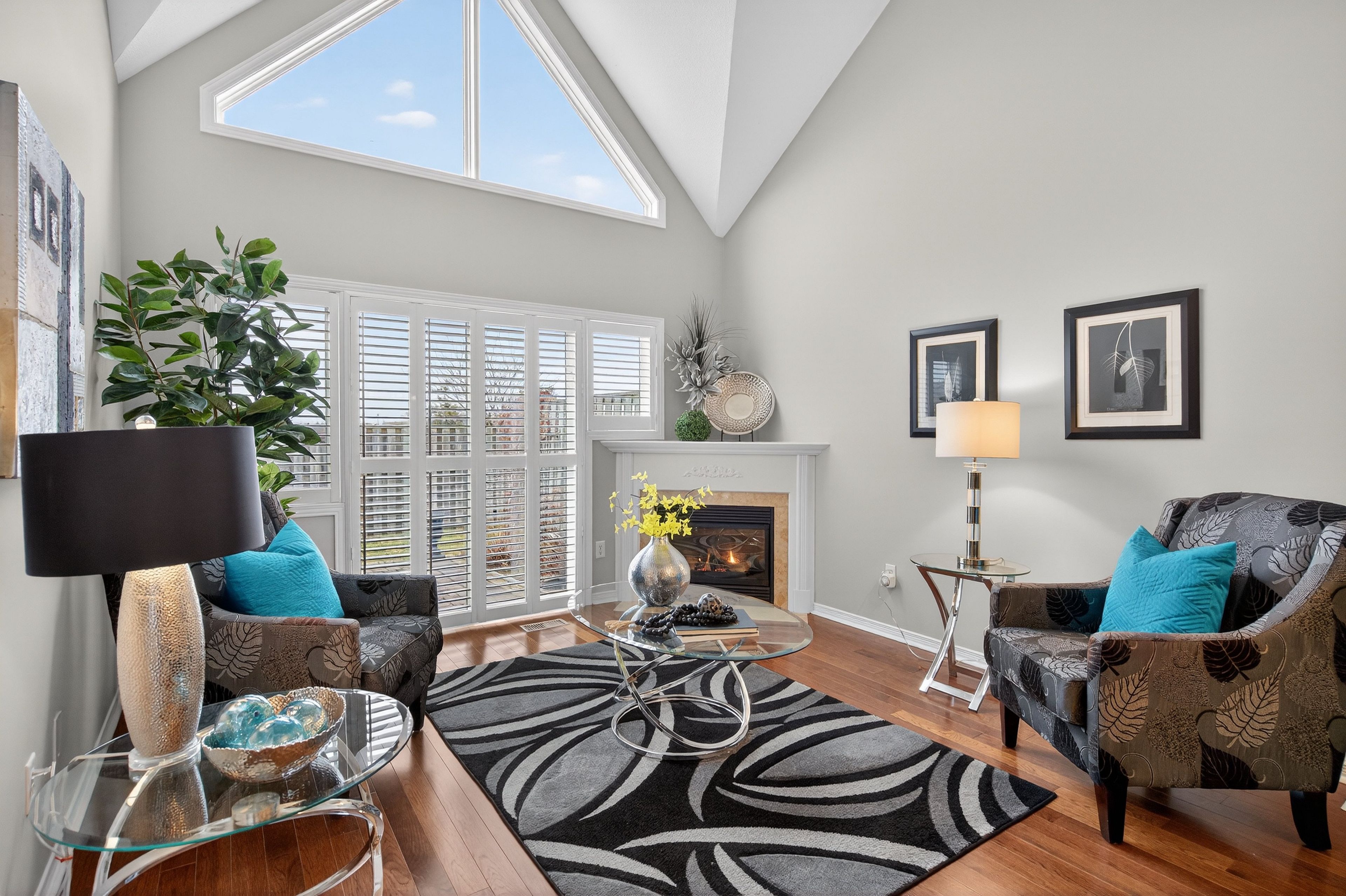 • Cozy living room features vaulted ceilings, oversized windows, and a gas fireplace.