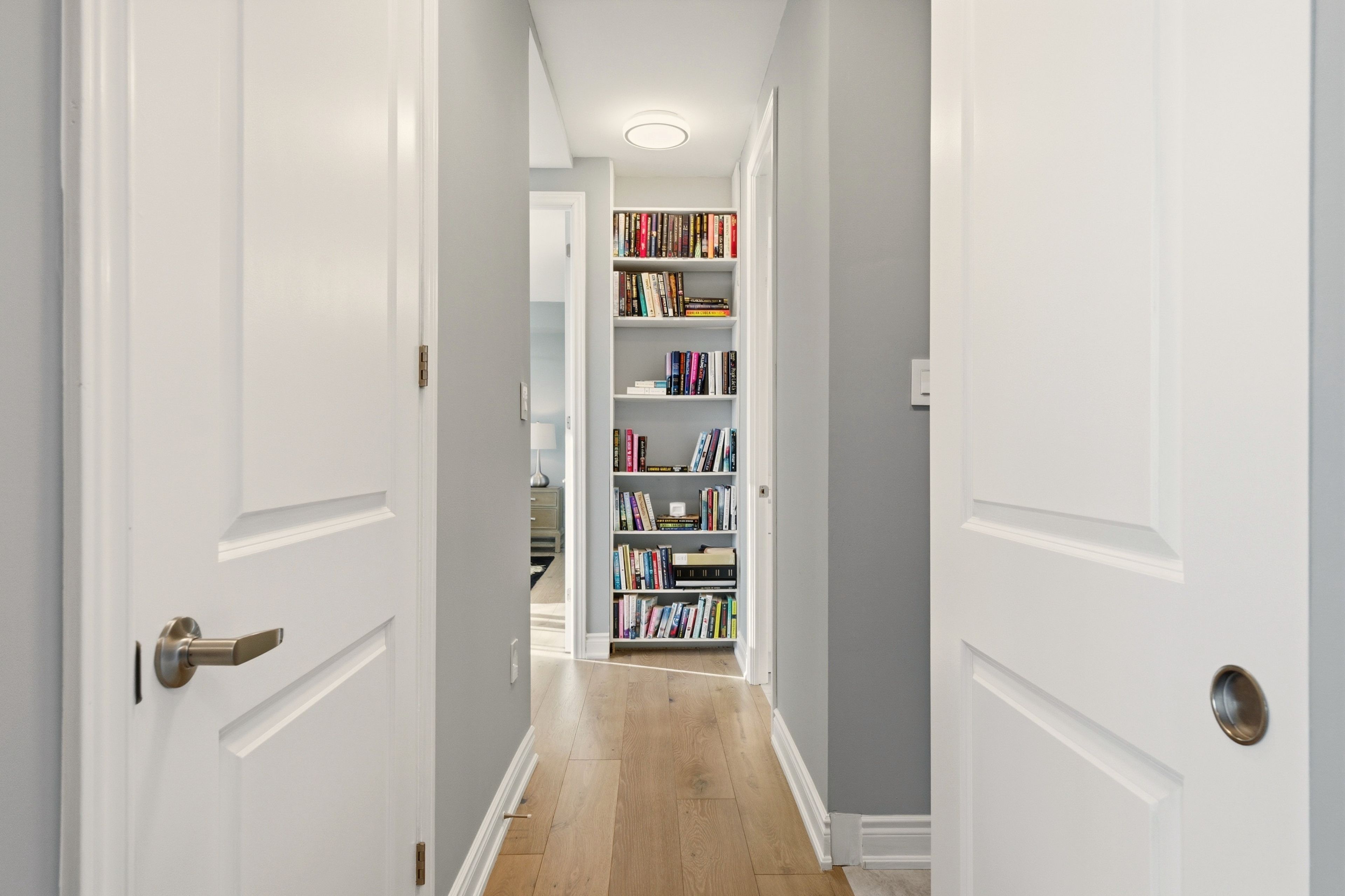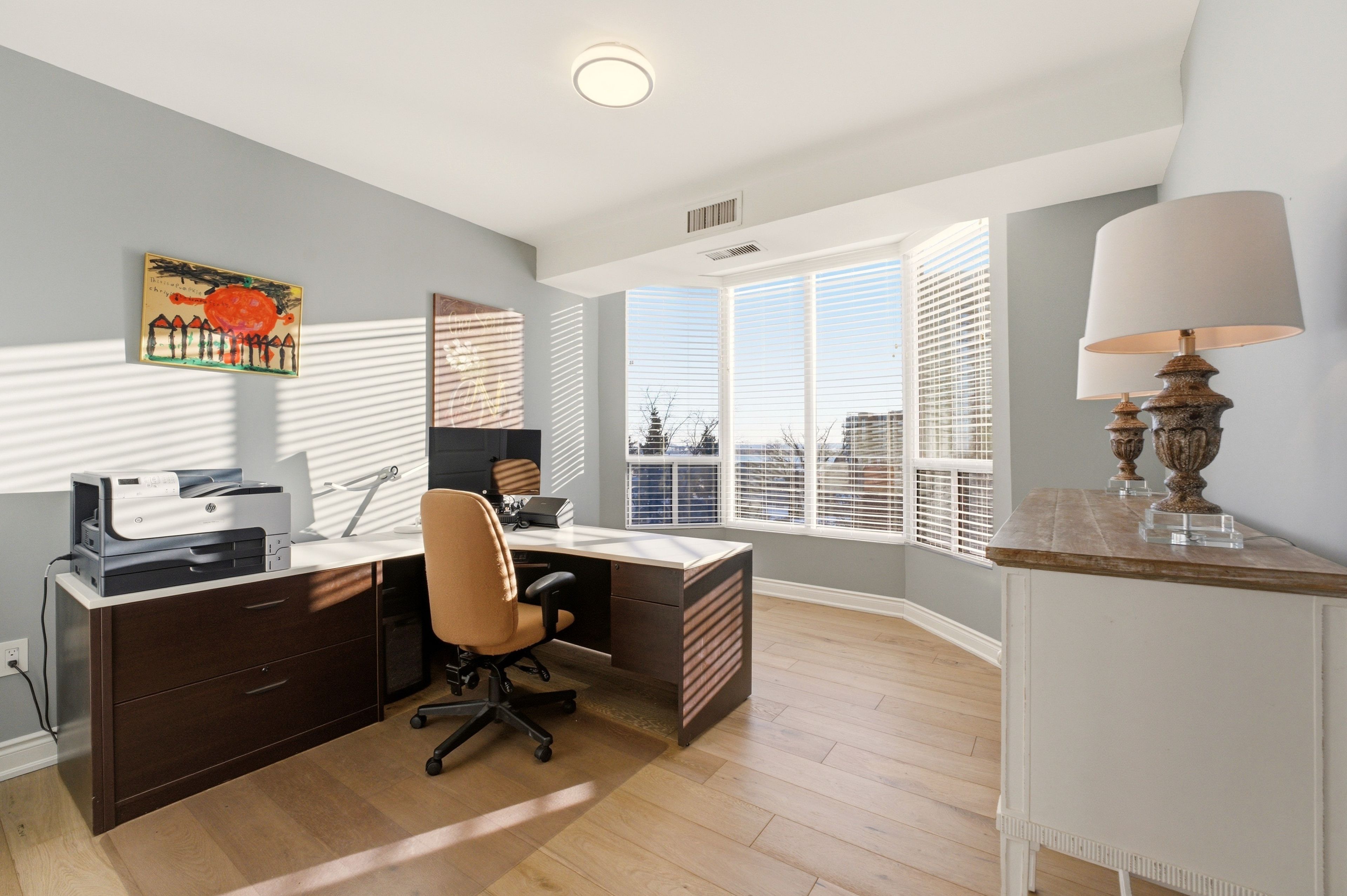 Perfectly located within steps of burlington's vibrant downtown. Sw corner suite at 2121 lakeshore road - burlington. Move in ready. Welcome to unit 603 - beautifully renovated, the perfect balance of sophistication and comfort with lake and city views as your everyday backdrop. Elegant & functional living spaces with attention to detail throughout. Large windows, 9' ceilings, and tons of natural light. The open-concept living & dining room creates a seamless flow - ideal for entertaining or quiet evenings at home. A separate den offers a tranquil retreat to relax while enjoying the views. The custom kitchen features: - white cabinetry, tons of drawers, quartz countertops, breakfast bar, glass tile backsplash, led pot lights and s/s appliances. A charming hall library leads to the private quarters. Principal bedroom retreat - with a cozy sitting area framed by a bay window, custom walk-in closet. Spa-inspired 3-piece ensuite with quartz vanity, step-in shower, heated tile floors & a linen closet. Guests will enjoy the spacious 2nd bedroom with a beautiful bay window offering southwest views. The main bath mirrors the upscale finishes of the ensuite, complete with heated floors, quartz counters, and a step-in shower. Highlights of unit 603: 2 bedrooms + den. Soaring nine foot ceilings, engineered hardwood flooring, custom blinds, tall interior doors & trim, custom closets, two linen closets. In-suite laundry. Two parking spaces + locker. Building features, two elevators, secure fob lobby access, visitor parking, beautifully landscaped grounds w/outdoor spaces / gardens to sit and relax. Unbeatable location - just steps to everything downtown burlington: boutique shopping, cafés & restaurants, burlington's performing arts centre and art gallery, waterfront trail, library, seniors' centre, golf, recreation, transit, hospital & morel. Easy access to major highways. Elevated, serene, turn-key living. Welcome home!