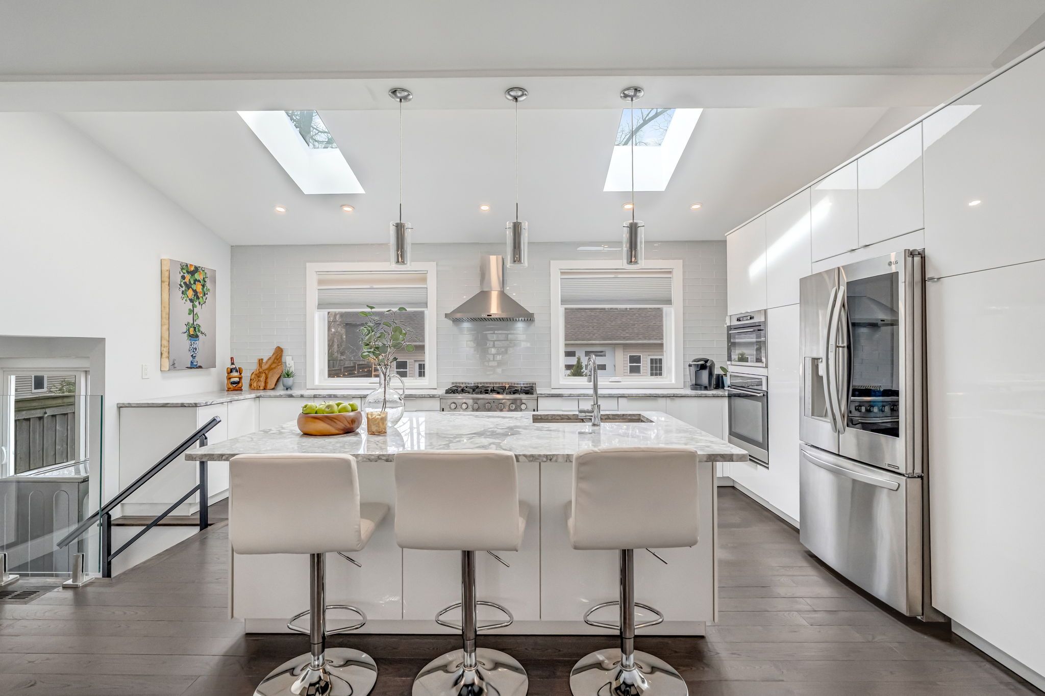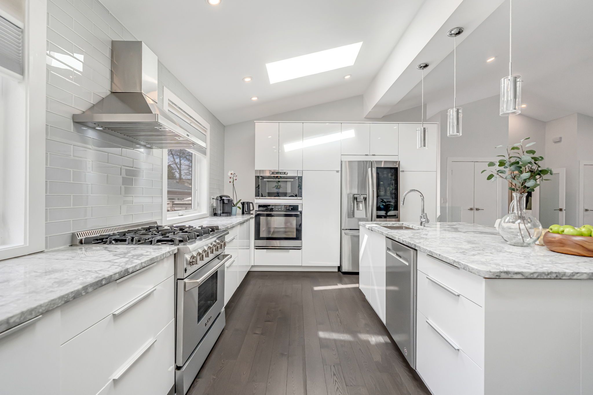 • Luxurious kitchen features stainless appliances, gas range, and large island.