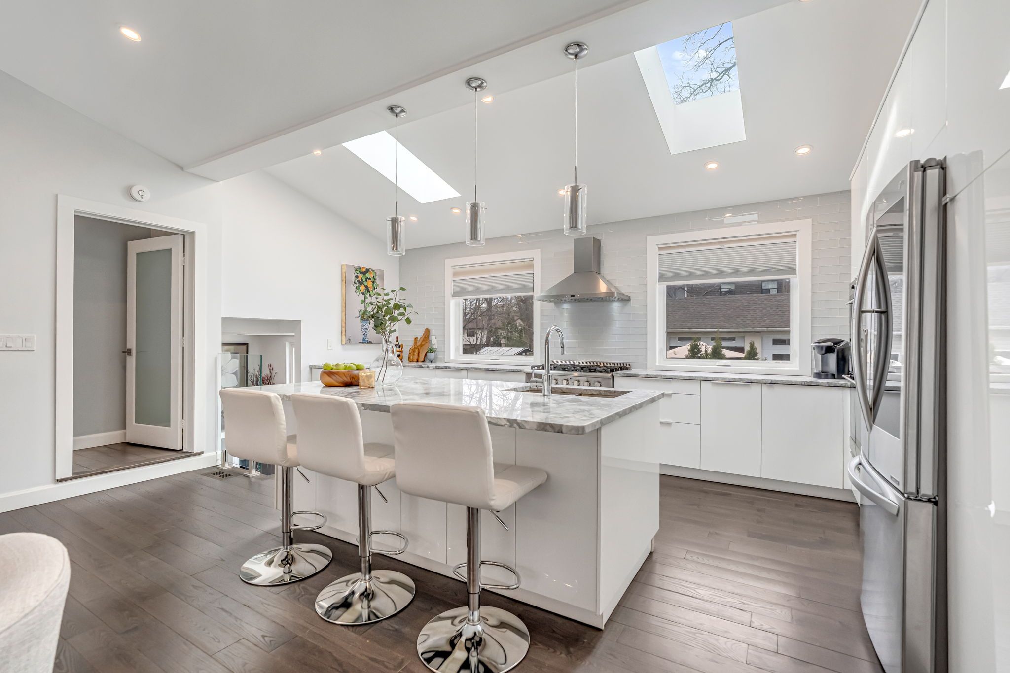 There's a reason people fight to get onto deyncourt drive - and this bungaloft is exactly why. Extensively renovated in 2018 on a stunning 65 x 140 ft lot in burlington's coveted downtown central neighbourhood, this is the kind of home where the layout just makes sense, the finishes feel right, and the backyard makes you forget the rest of the world exists. Step inside and the vaulted ceiling opens things up immediately. A floor-to-ceiling stone feature wall with gas fireplace anchors the living and dining space, hardwood floors run throughout, and the kitchen delivers everything a family or entertainer could want: stainless built-in appliances, chef's gas range, massive island, and endless counter space - all bathed in natural light from skylights above. The floorplan is genuinely thoughtful - two bedrooms and a 3-piece bath tucked quietly along their own private wing on the main level, while a half-flight up, the primary suite feels like a world apart. Walk-through closet, freestanding tub, glass shower, skylit and serene, overlooking the backyard. Main floor laundry, two sets of sliding doors on opposite sides of the home - every detail considered. The backyard is the closer. Saltwater pool just steps from an infrared sauna, full bath, and a 419 sq ft heated pool house - permitted and winterized with a year-round living room and workshop. Whether it becomes a she-shed, man cave, or studio, it's a space people don't expect to find. A fully finished basement adds over 1,275 sq ft more for whatever life calls for. Steps to the vibrant core - downtown burlington, the waterfront, top-rated schools, and burlington go. Homes like this on streets like this don't come around often.
