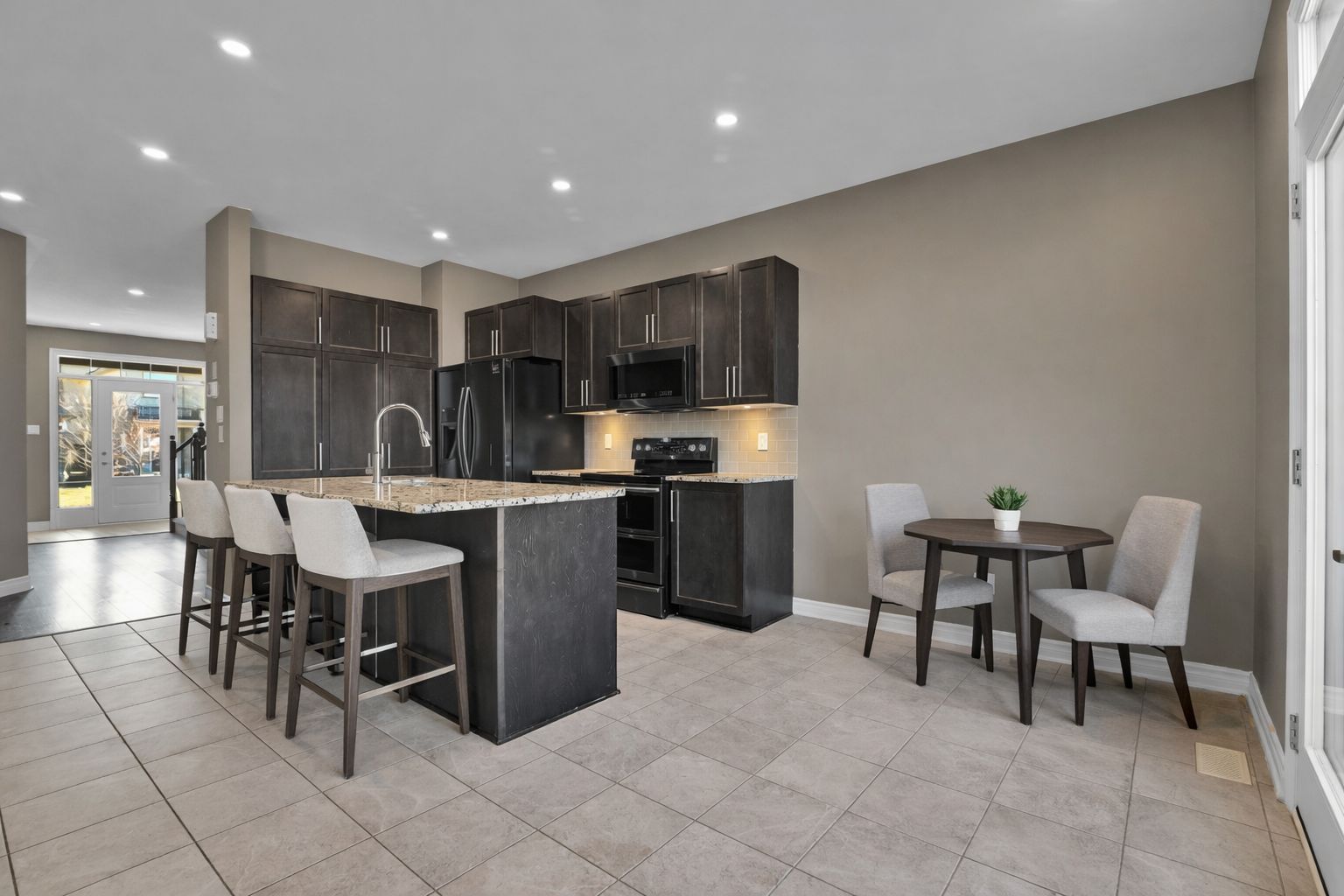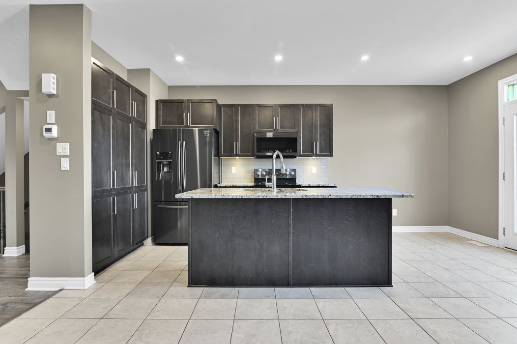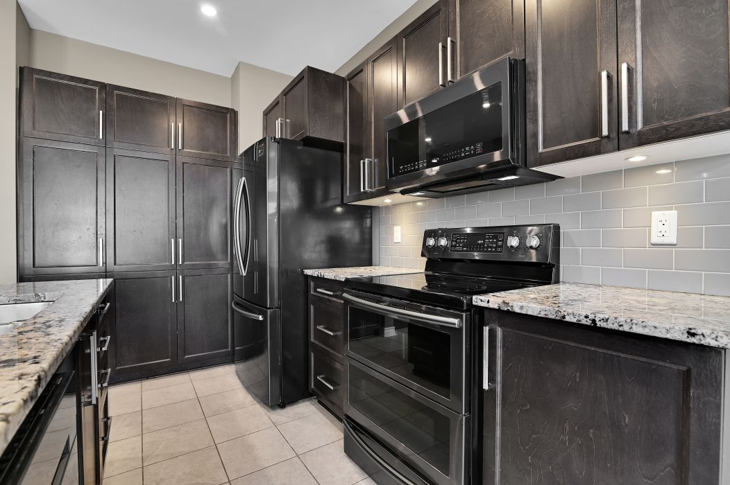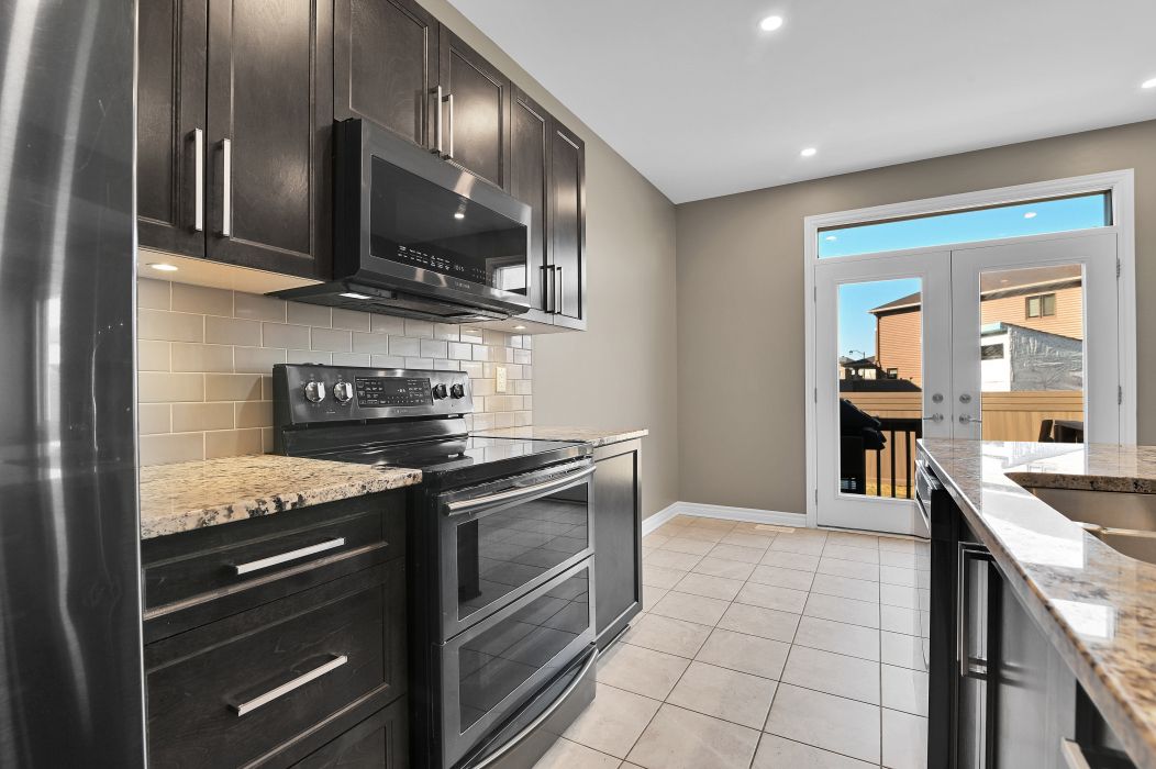 • Stylish kitchen with granite countertops and stainless steel appliances.