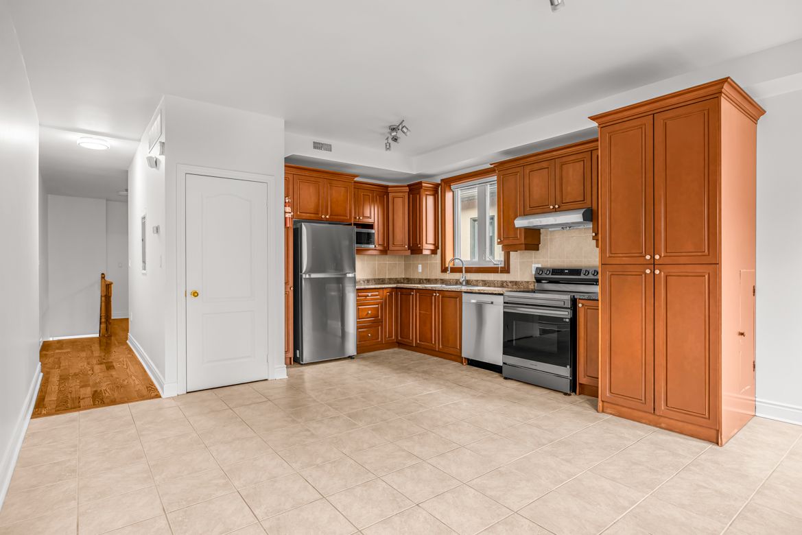 • Modern kitchen with full-size stainless steel appliances for cooking.