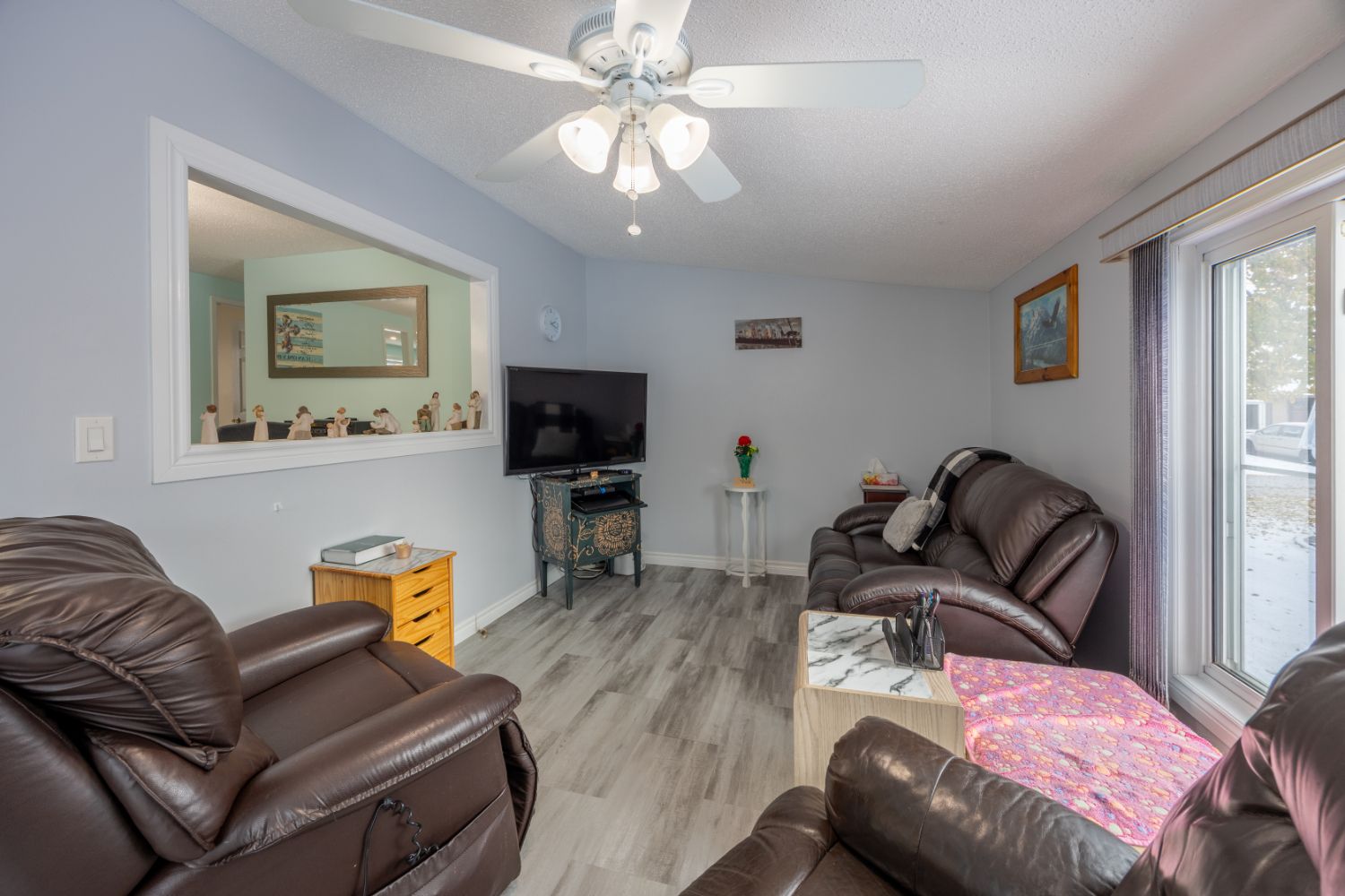 • Spacious living room with a cozy gas fireplace and bay window.