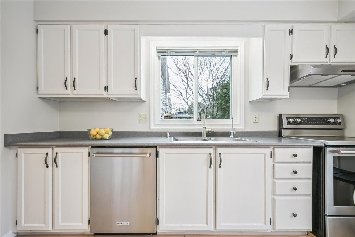 • Bright kitchen with stainless steel appliances and breakfast area.