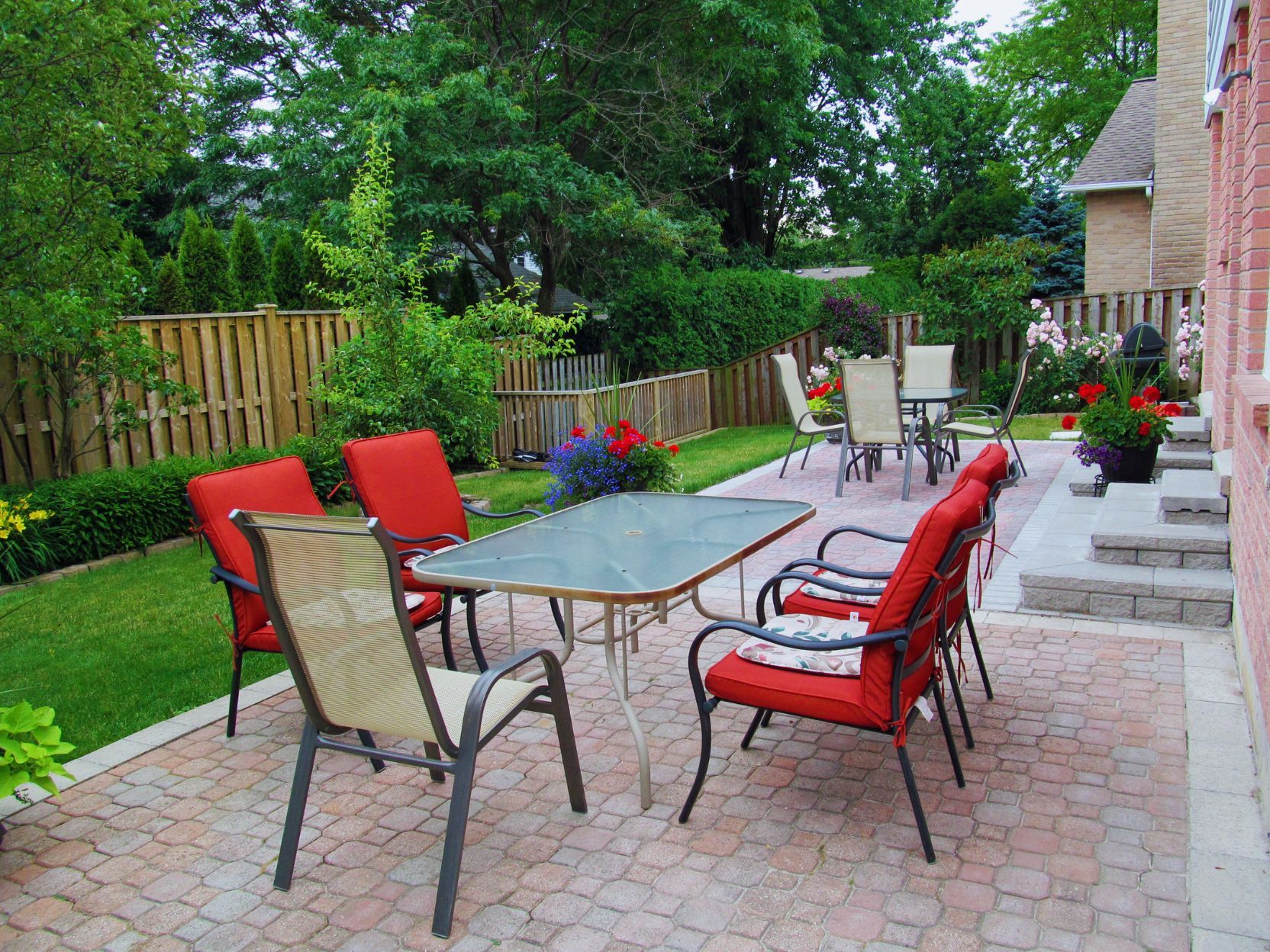 • Private backyard with a patio, mature trees, and perennial gardens.