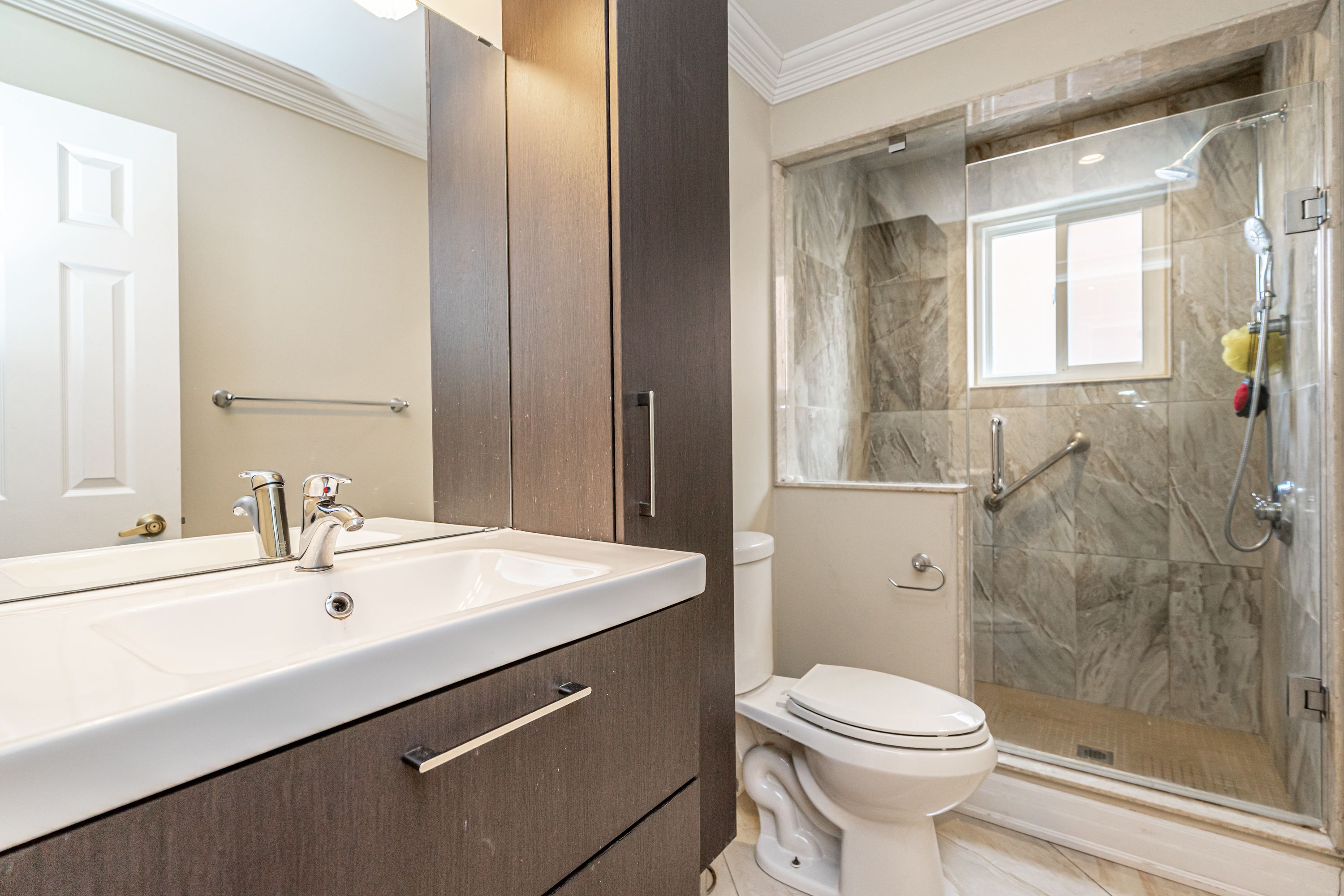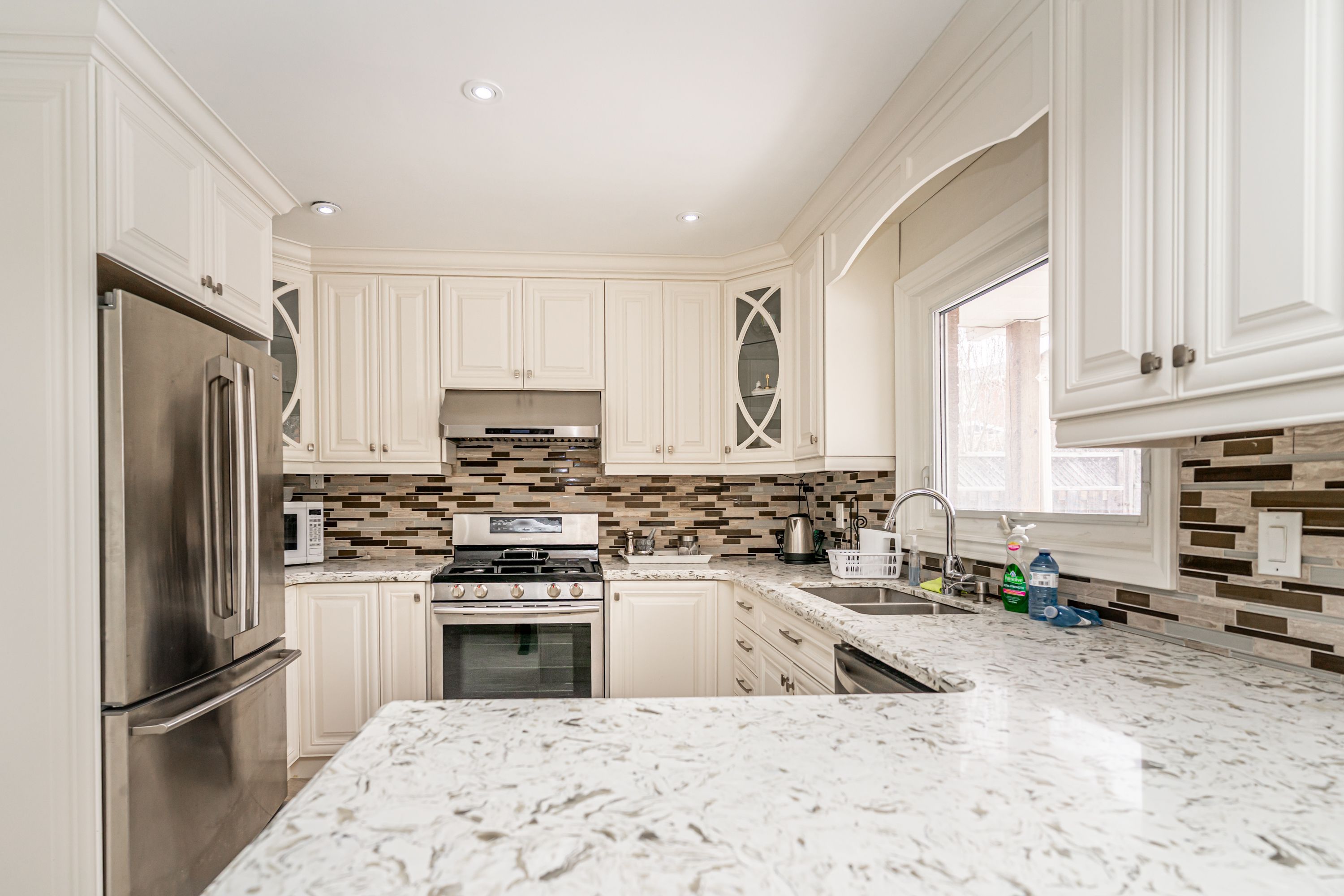 • Upgraded kitchen with granite counters and ample cupboard space.