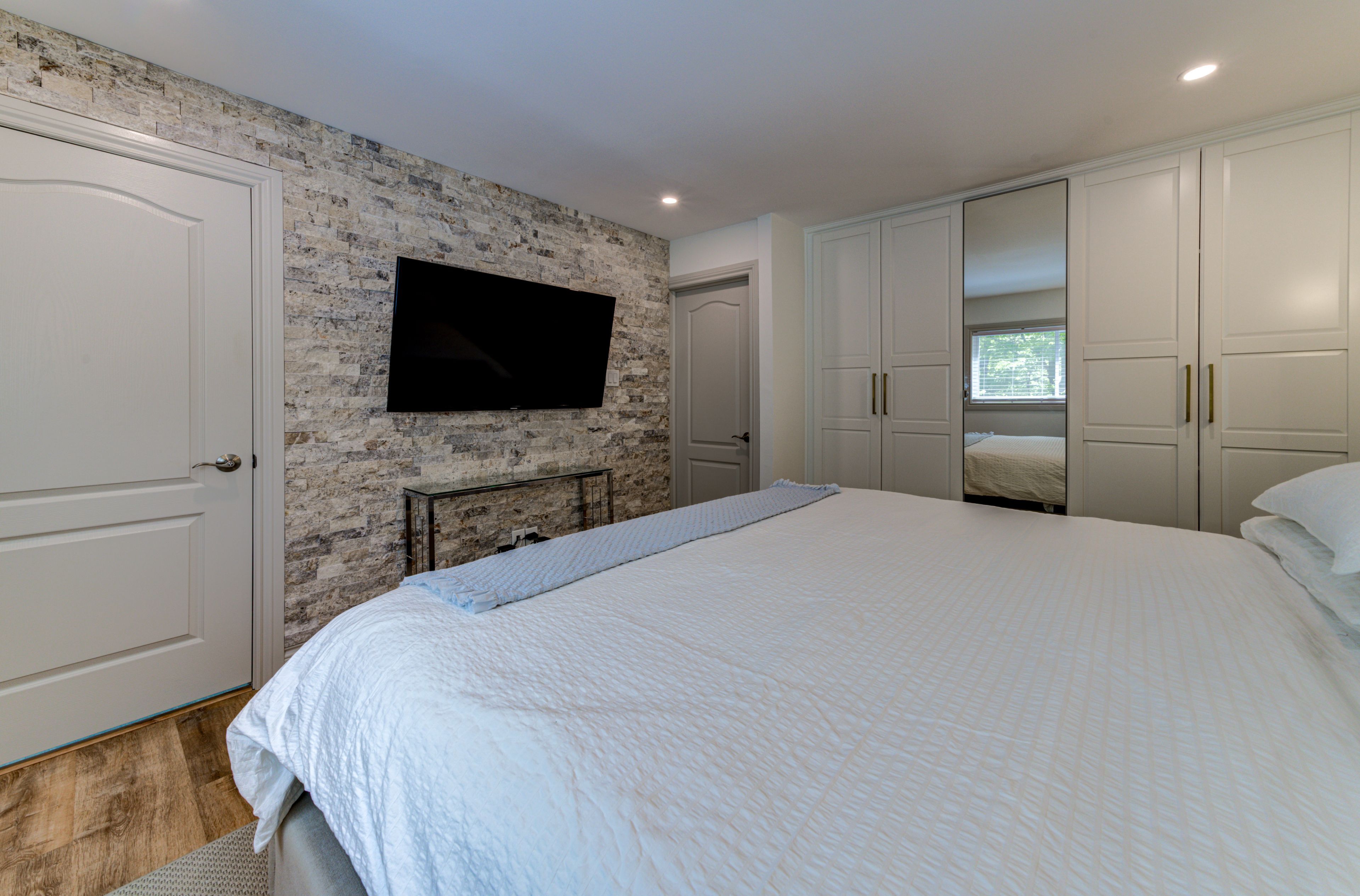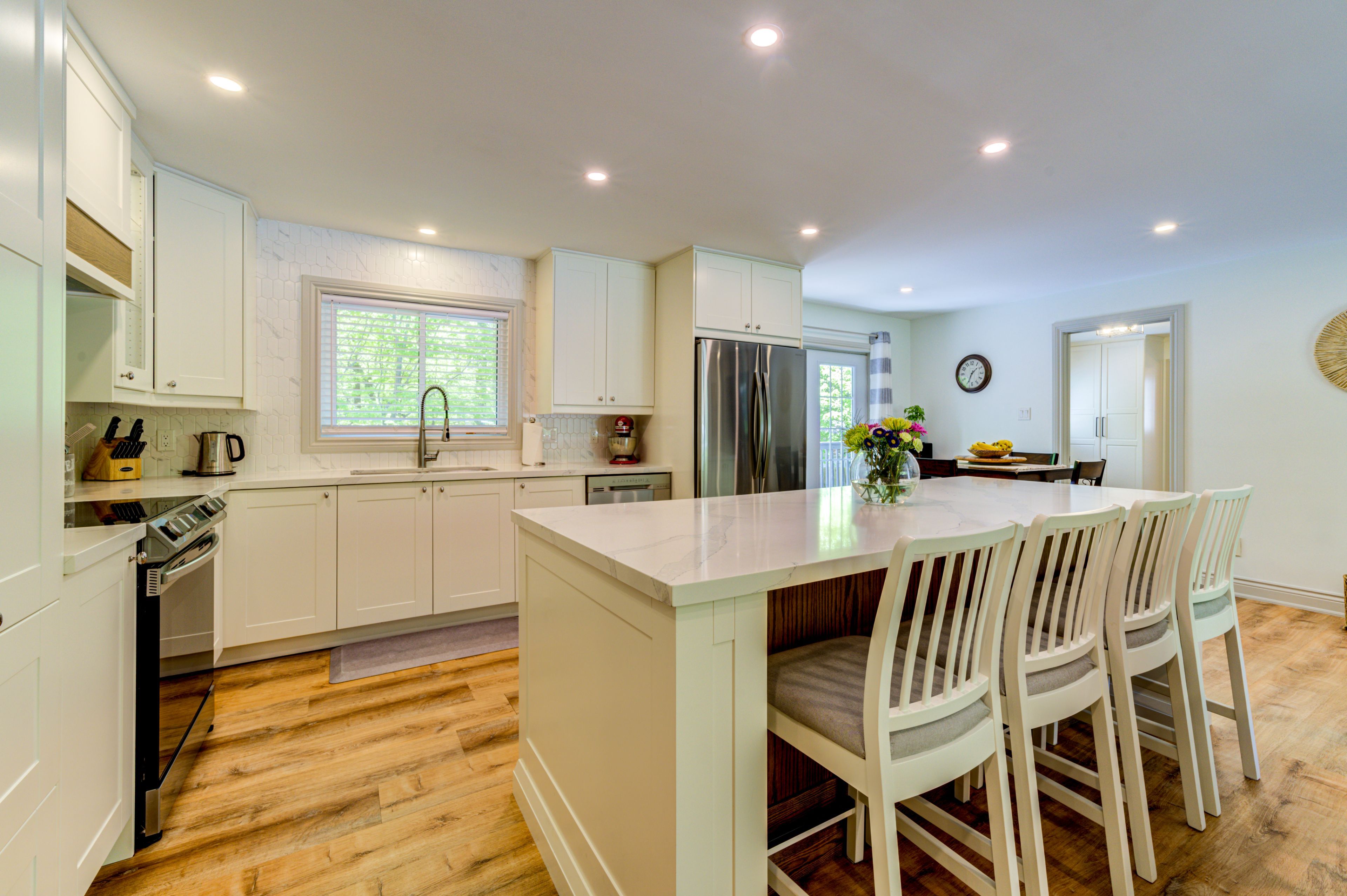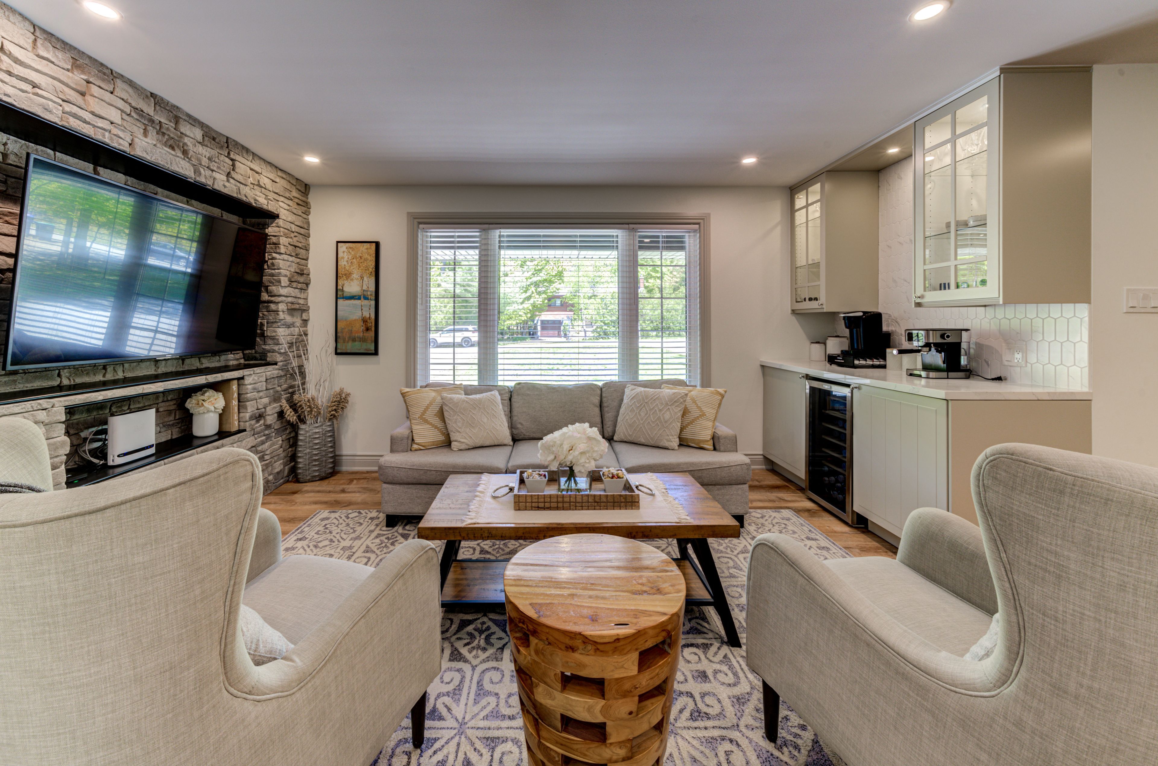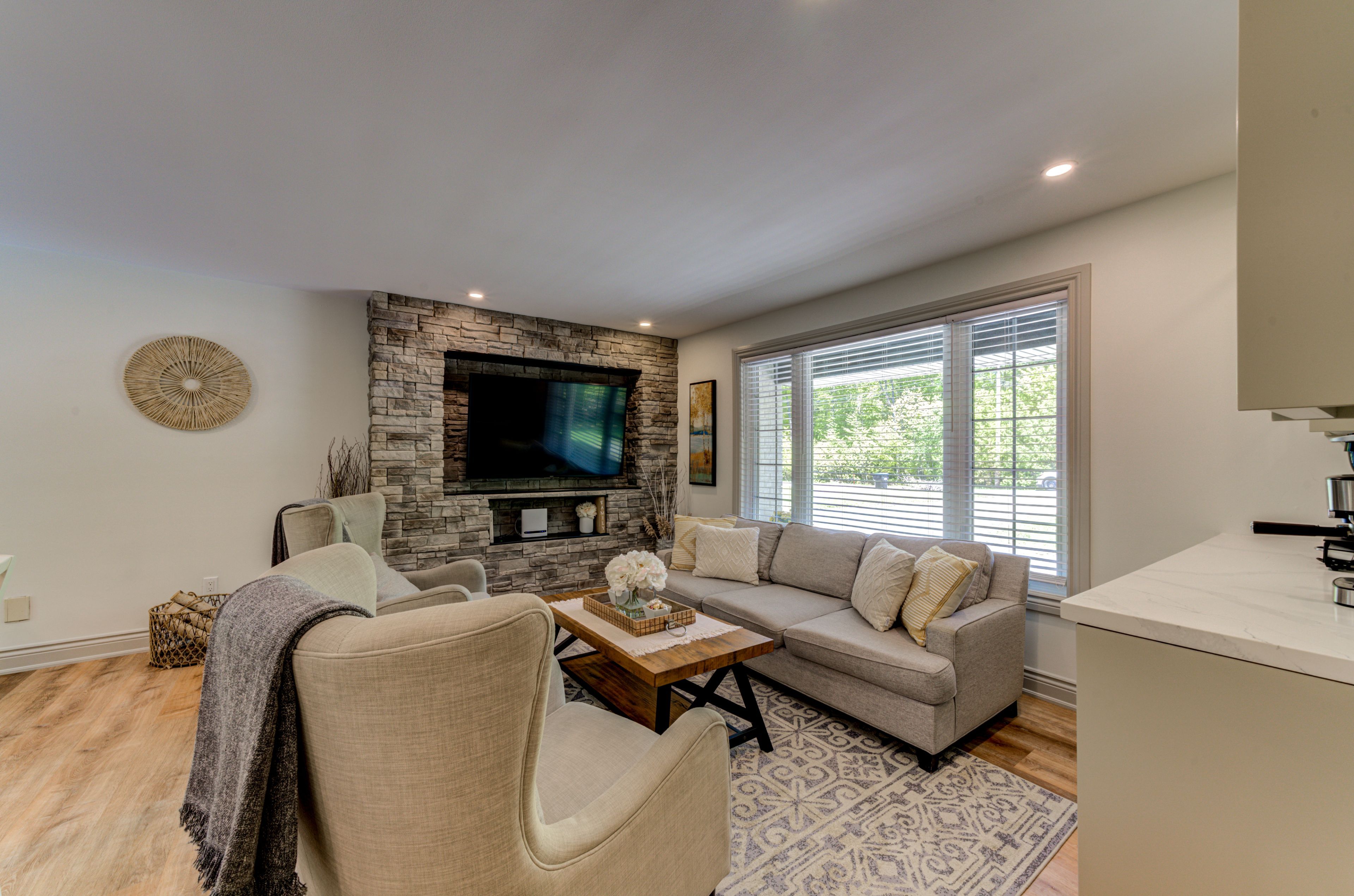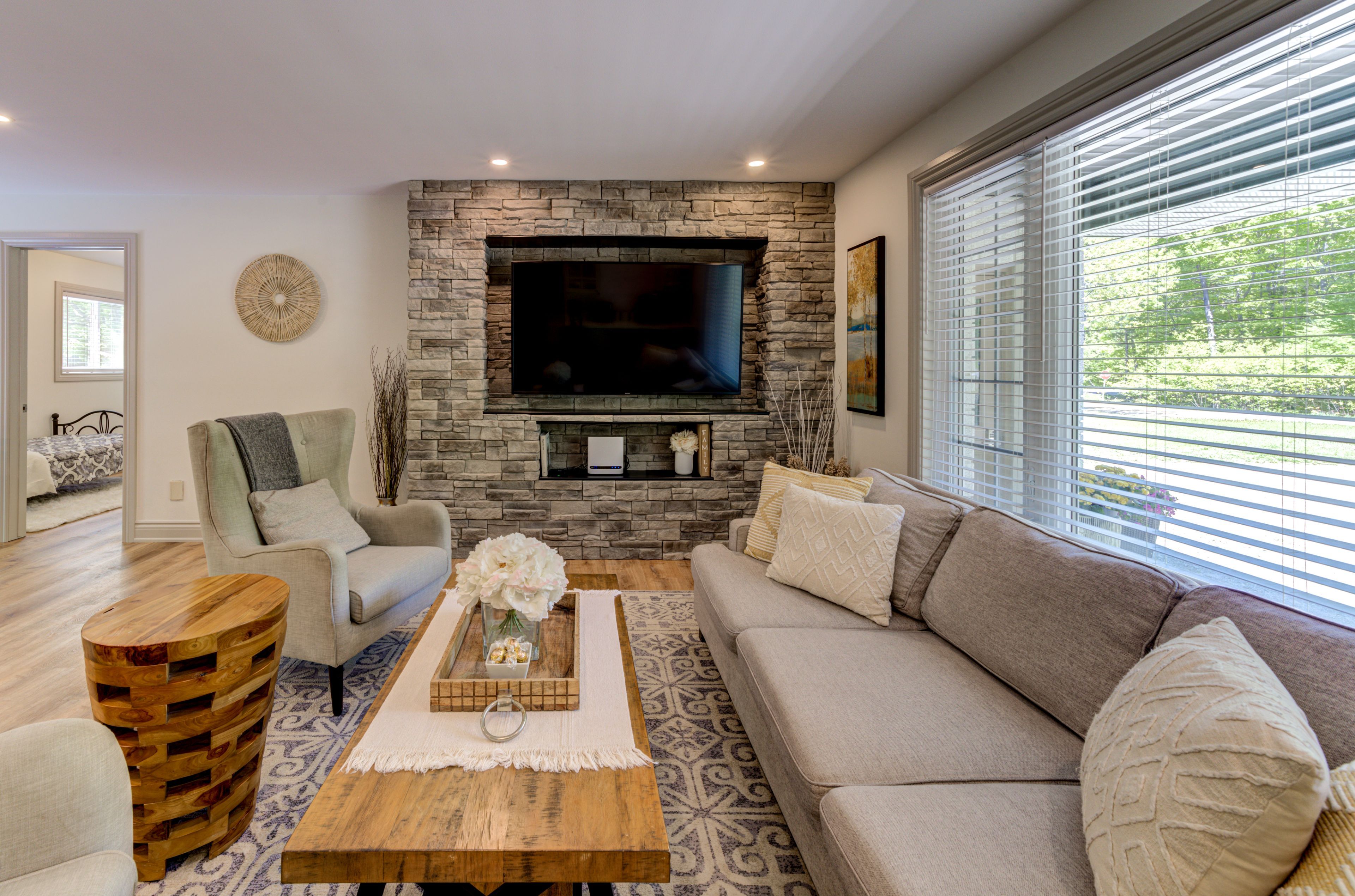Step into a lifestyle of comfort and relaxation with this stunning bungalow with a walk-out basement, just a 5 minute stroll to beautiful lafontaine beach. Perfectly blending functionality w/ modern elegance, this thoughtfully designed 3+1 bedroom, home offers 3 main floor bdrms, two of which each feature private ensuites, offering convenience and privacy. The primary bdrm ensuite is complete with its own stacked washer & dryer for the ultimate convenience, heated floors, custom tile backsplash, wall sconces, & a bluetooth enabled speaker. At the heart of the home, an open-concept kitchen features an expansive island w/ electrical outlets containing usb ports, quartz countertops, tile backsplash, stainless steel appliances and a w/o to the deck. The living room's stone feature wall adds warmth and coziness while the custom coffee bar caters to your morning rituals. Each bedroom is enhanced w/ custom built-in wardrobes, ensuring optimal organization and storage. The inviting walk-out basement retreat is designed for comfort and wellness. The walk-out basement features custom stone feature wall with a cozy gas fireplace and a billiards table. Thoughtfully placed wall sconces provide ambient lighting, creating a relaxing and stylish atmosphere. With two convenient walk-outs to the expansive backyard, you'll enjoy easy access to the outdoors, surrounded by mature trees that offer both beauty and privacy. The spacious basement bedroom features custom built-in wardrobes and two large windows, filling the room with lots of natural light. The exercise room is outfitted with a custom tile feature wall w/ a napolean electric fireplace equipped w bluetooth-enabled speakers and a 2 pc washroom for added convenience. Class 4 filter bed septic system (june 2024) - permit available, roof (april 2022), water softener (2022) and much more - see attached sheet for list of upgrades. Water is included in property tax bill.