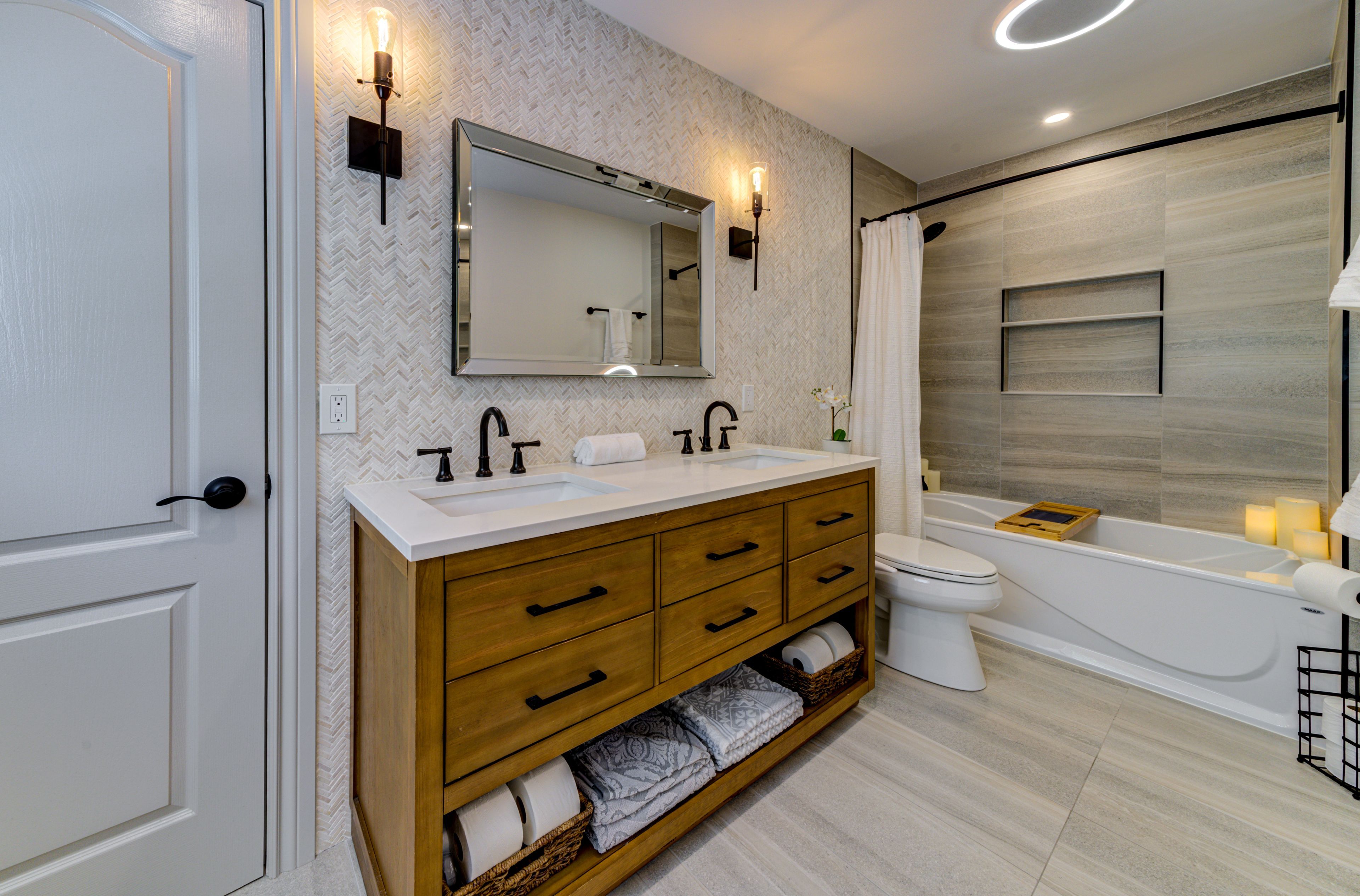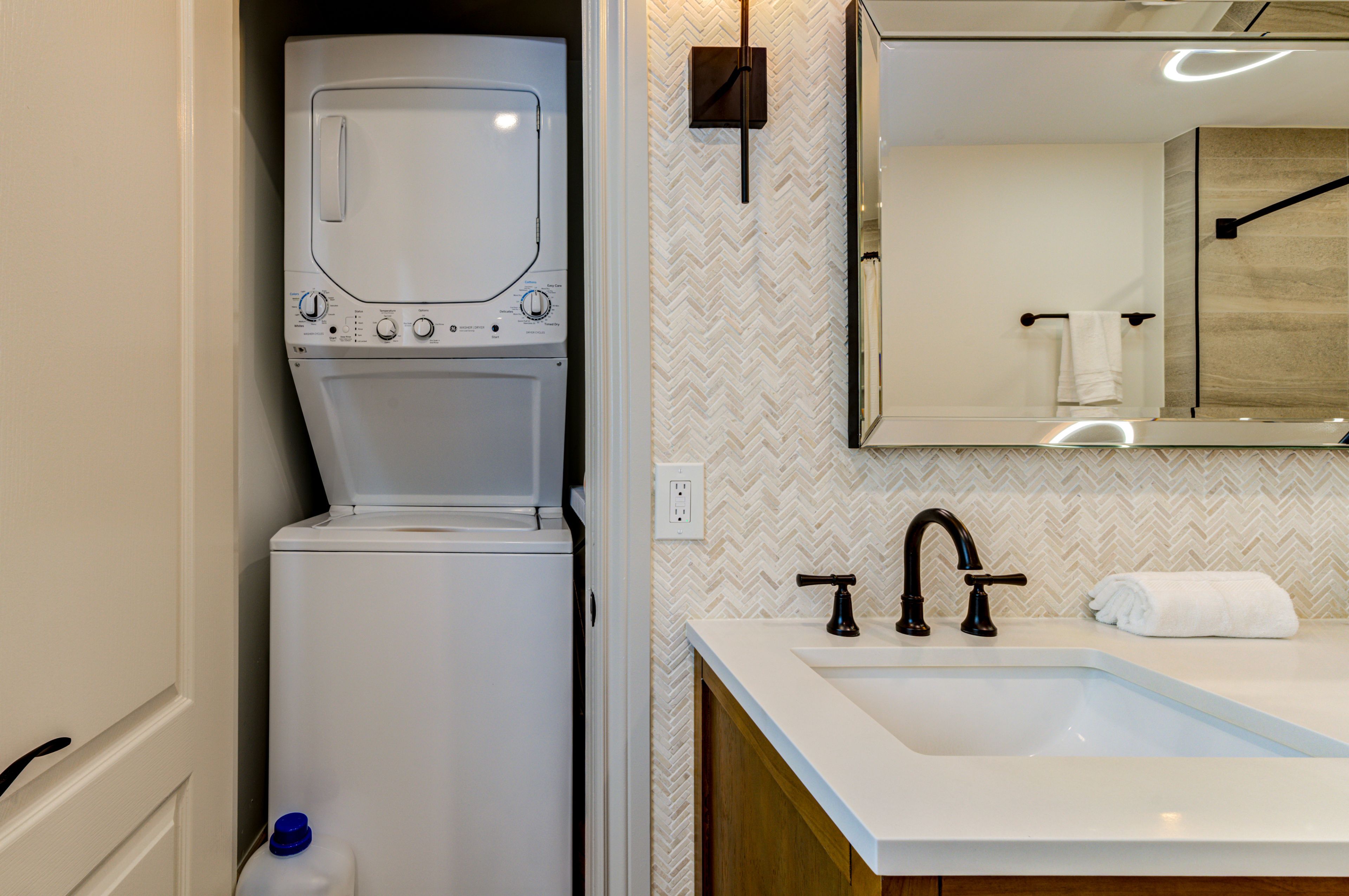• Open-concept kitchen with modern appliances and USB-outlet island.