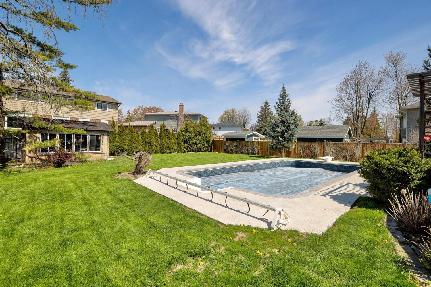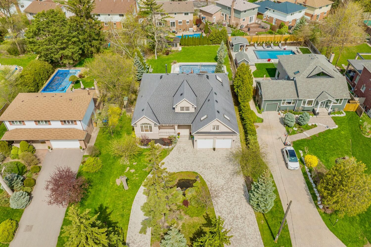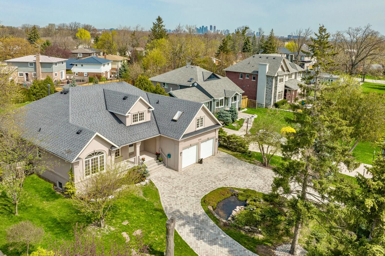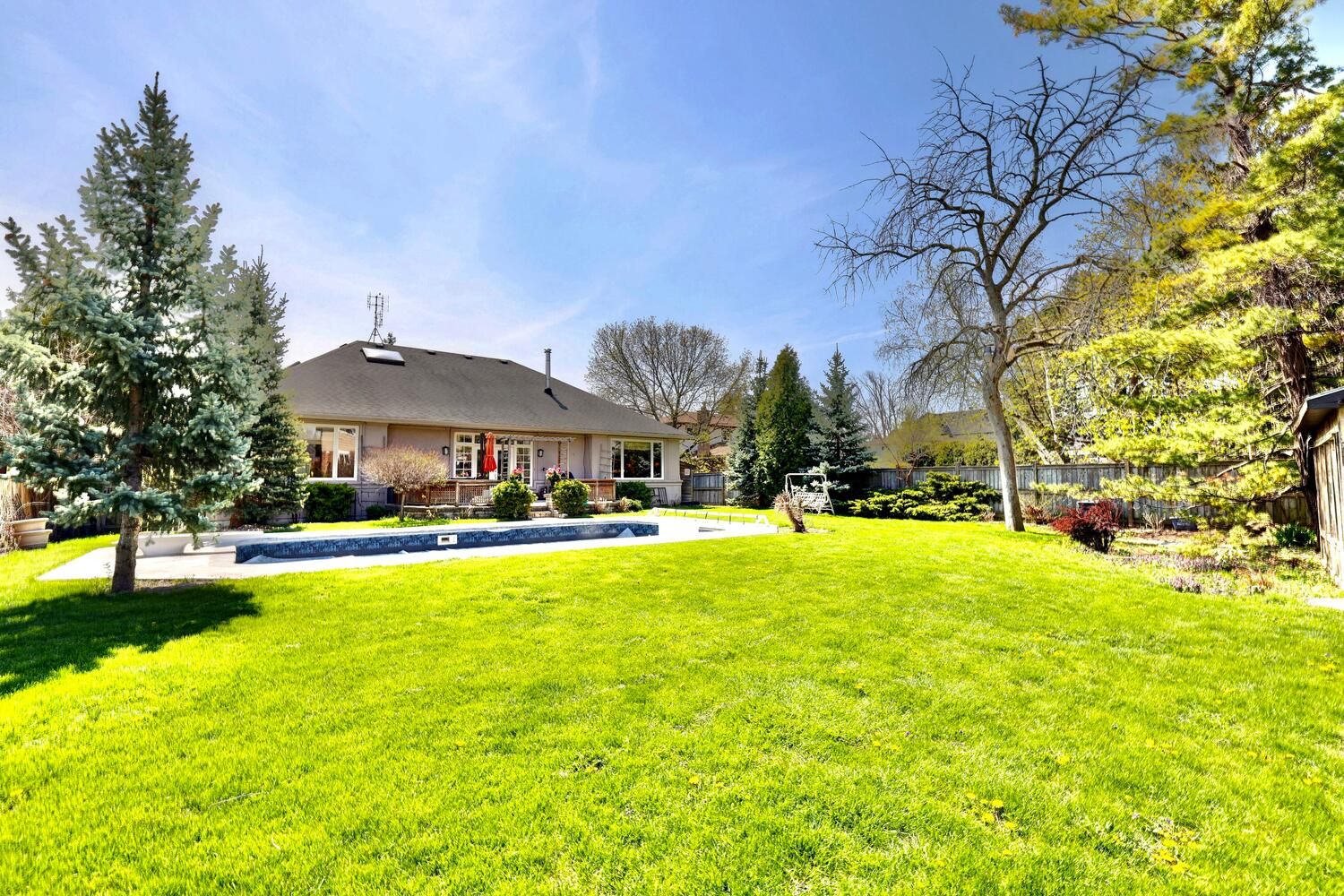 Custom built sheridan homelands bungalow situated on a 79 by 196 foot lot over 3300 square feet with in-ground pool, 9 foot ceilings, and jatoba hardwood floors throughout the main level. Huge living/great room with indoor garden area with skylight, floor to ceiling stone fireplace, crown moudling, and walk-out to interlocking stone patio area. Separate formal dining room with pot lighting. Gourmet kitchen with granite counter tops, breakfast bar, ceramic floors/backsplash, skylight, built-in pantry, stainless steel appliances with gas cooktop and large breakfast area overlooking the pool. Main floor office, front staircase with wrought iron spindles, interior entrance to garage, and main floor laundry. Primary bedroom retreat with double door entry, walk-in closet with organizers, 6 piece en-suite with jacuzzi tub and his/her sinks. Main 3 piece bathroom and second bedroom with cathedral ceilings. Fantastic rental potential/in-law suite with a separate side entrance leading up to bachelorette apartment over garage with 3 piece bathroom, closet and kitchenette. Potential basement rental/in-law suite with side entrance leading down from the 2nd staircase to basement with 2 recreation areas, 2nd laundry, 3 piece bathroom, 5th bedroom, water line and drain available to add 2nd kitchen. Lots of natural light with multiple skylights, 5 bathrooms, 5 bedrooms, and lots of storage space. Great curb appeal with stucco exterior, covered veranda, gorgeous landscaped gardens, front entrance water feature, and large circular driveway that fits up to 12 cars. Private backyard oasis with stone patio area, in-ground pool, pergola, and fully fenced treed backyard.