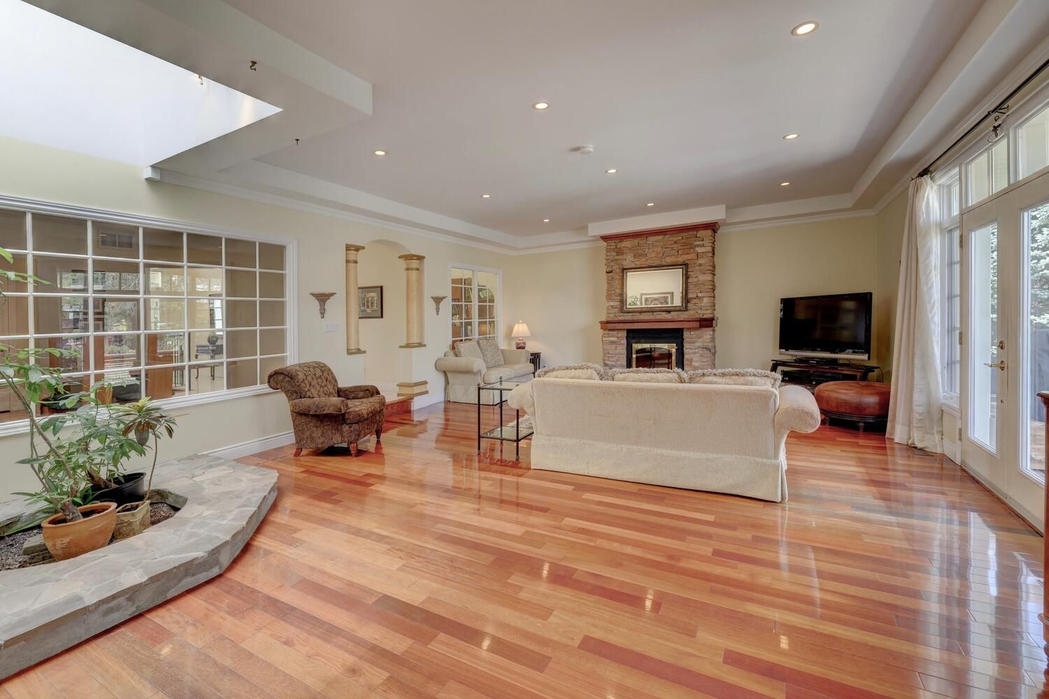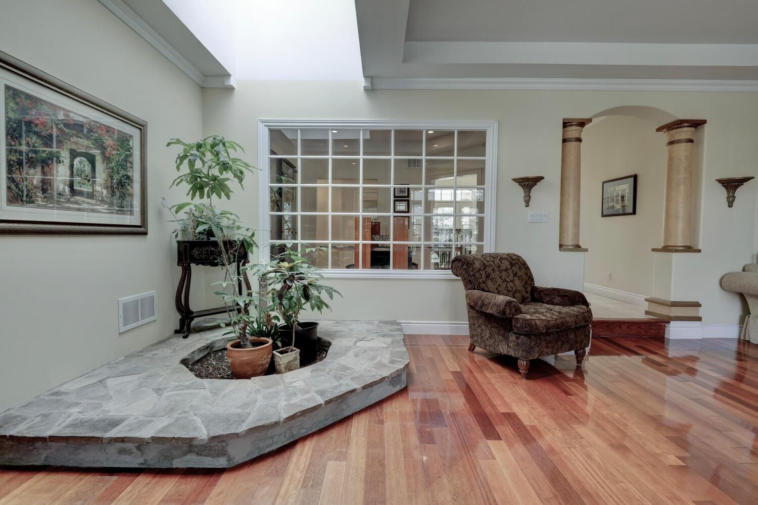 • Large living area featuring a stone fireplace and indoor garden with skylight.