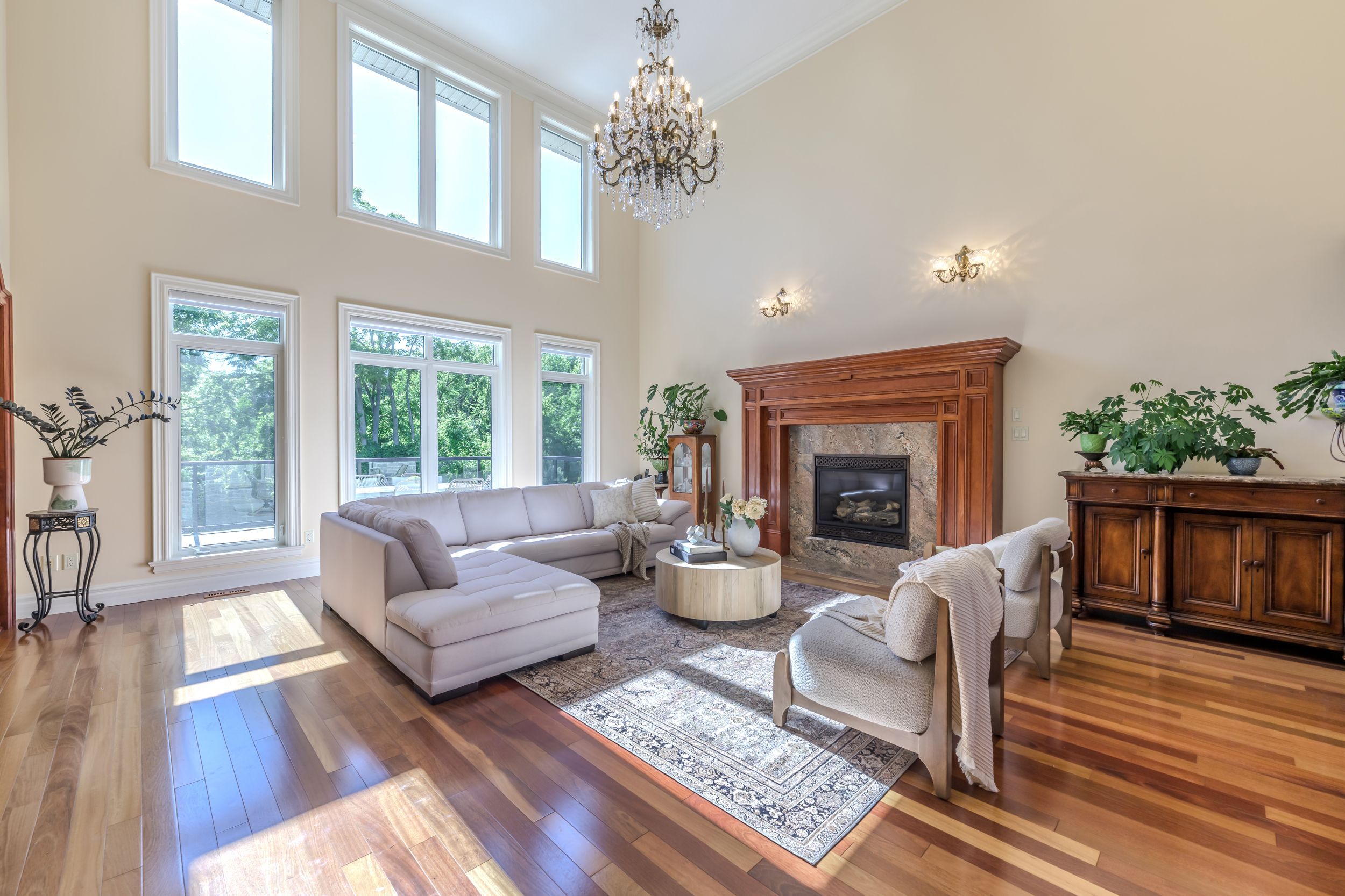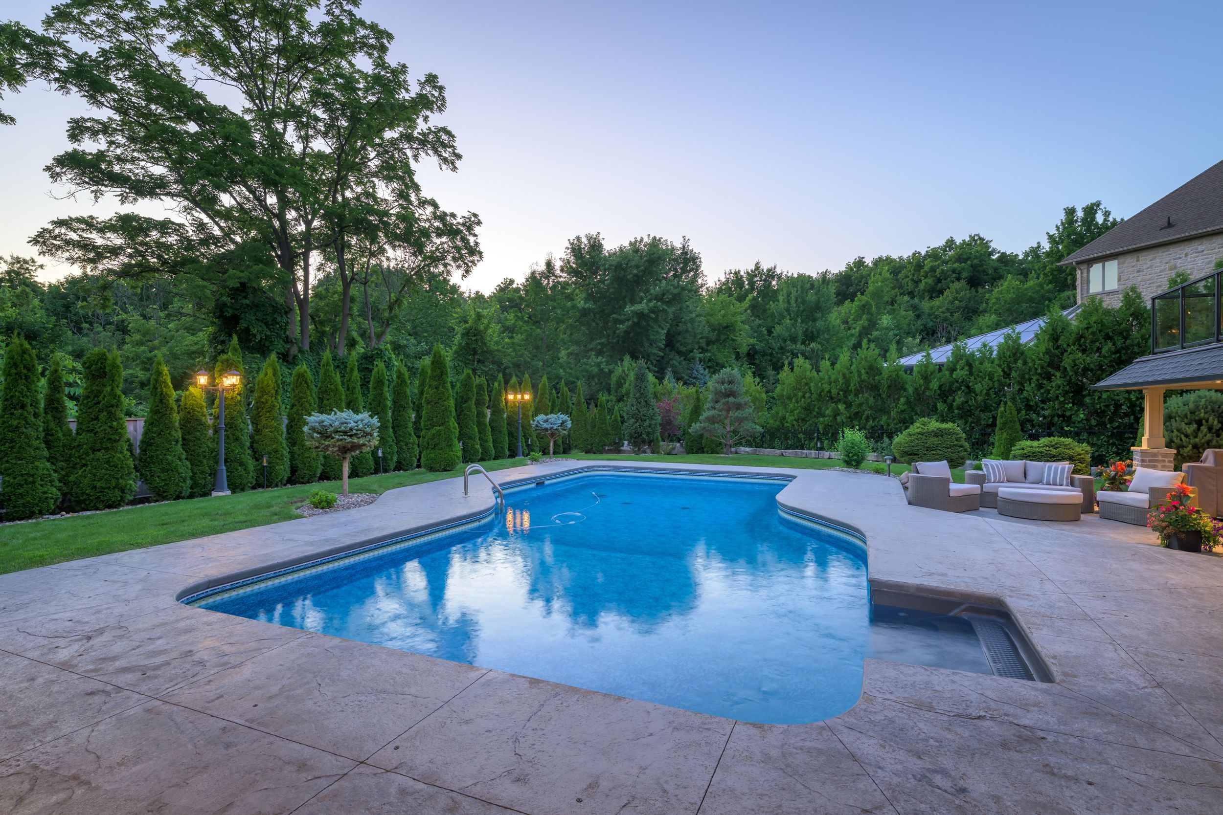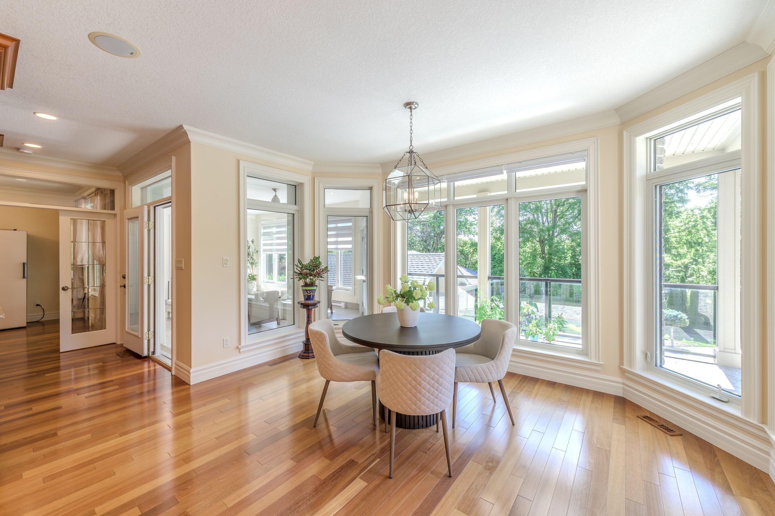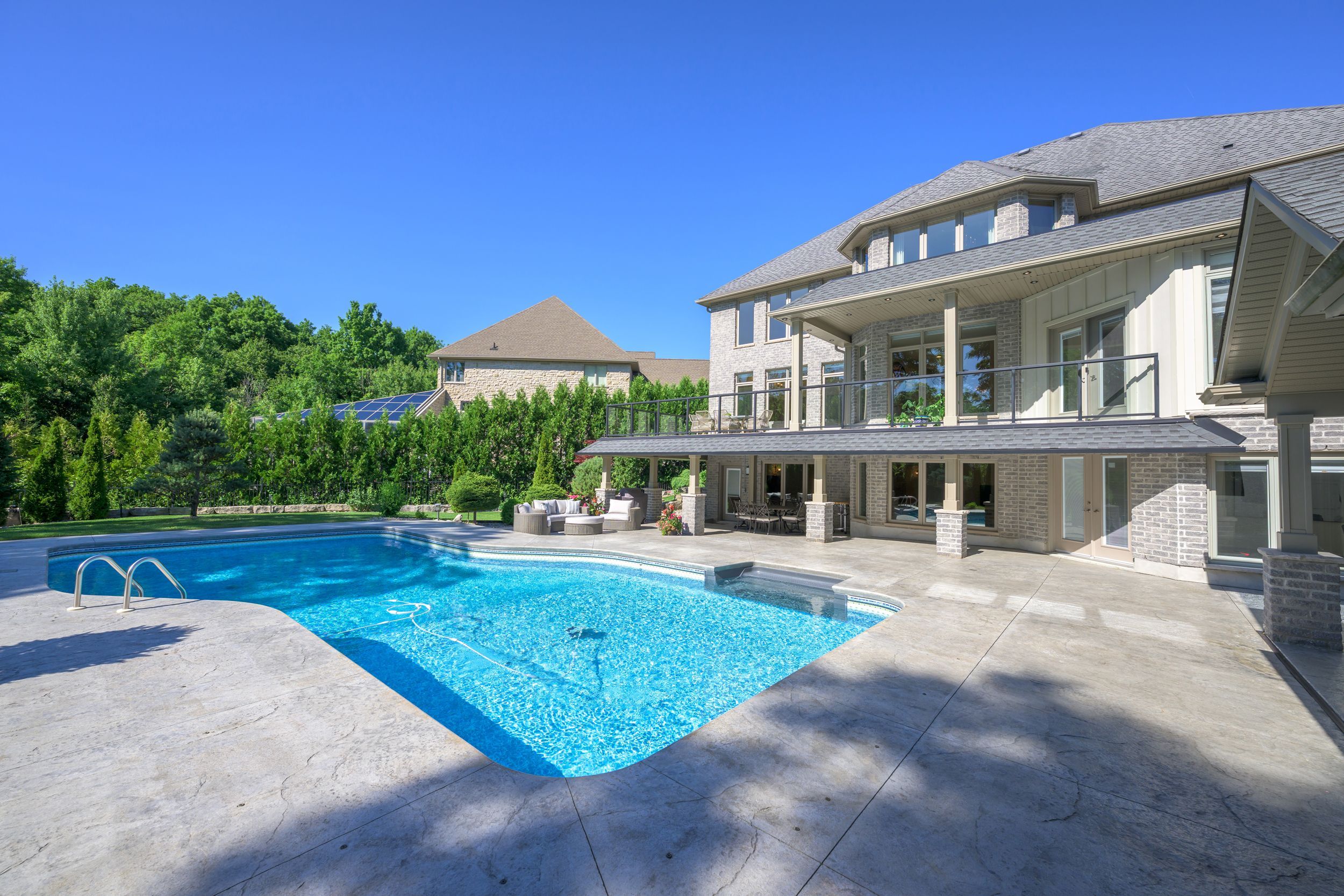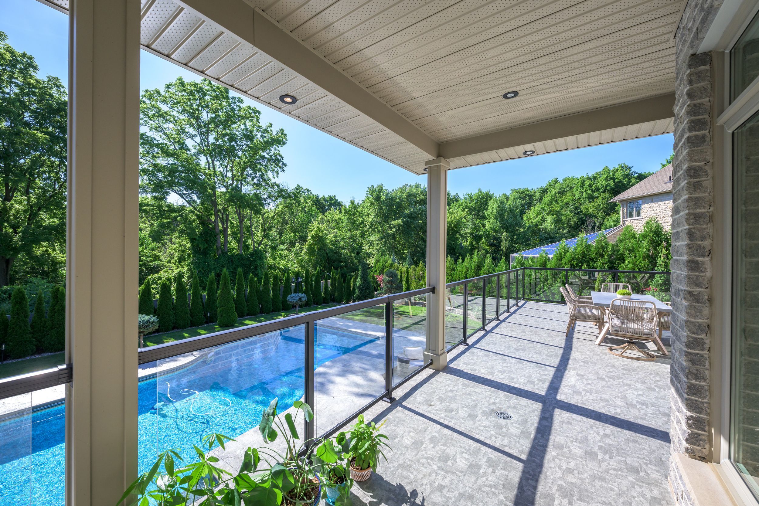 Nestled at the end of a quiet cul-de-sac in one of sunningdale's most prestigious enclaves, this extraordinary executive residence offers approximately 6,500 sq. Ft. Of luxurious living space backing directly onto the protected medway valley heritage forest. A stately stone façade with contrasting stone voussoirs crowning the arched windows and triple-car garage introduces architectural drama and elegance for a commanding first impression. Professionally landscaped grounds with sculptural evergreens, gardens, and elegant accent lighting establish the refined tone carried throughout the home. At the centre, a grand double-door entry framed by a soaring arched portico and transom glass invites you into the interior with a sense of architectural grandeur. Inside, soaring ceilings and a double-height great room with a dramatic wood and stone fireplace showcase a spectacular wall of windows framing tranquil forest views. Rich brazilian cherry hardwood adds warmth throughout. The crystal chandelier, arched transoms, formal dining area, and gallery-style overlook enhance opulence. The chef's kitchen features full-height cherry cabinetry, granite surfaces, upscale built-in appliances, a window-wrapped dinette, and a custom wet bar. A separate morning room opens to the upper deck with glass railings. A bonus room serving as an oversized pantry and a richly appointed office with custom cherry millwork elevate the main floor. Upstairs, the solid wood staircase ascends to a sunlit landing. The primary suite offers forest views, two walk-ins, and a spa ensuite. All 3 additional bedrooms enjoy ensuite access. The walkout level includes a guest room, full washroom and a family room/games/media fusion with gas fireplace. Separate gym with private patio access. Outside enjoy lush gardens, saltwater sport pool, extensive hardscaping & gate to the forest. The fully outfitted cabana with vaulted ceiling, wet bar, and full bath is ideal for entertaining or overnight guests.