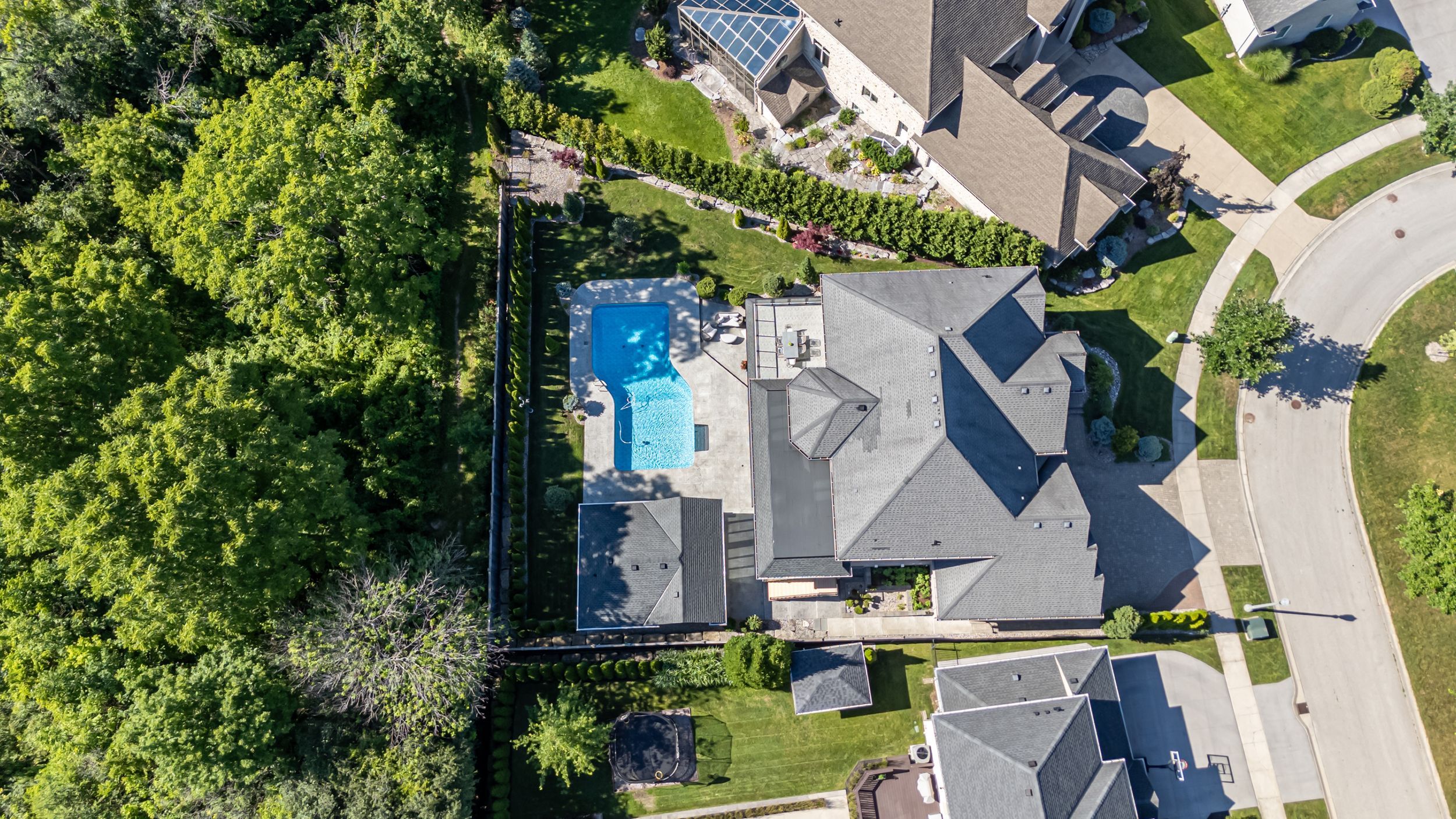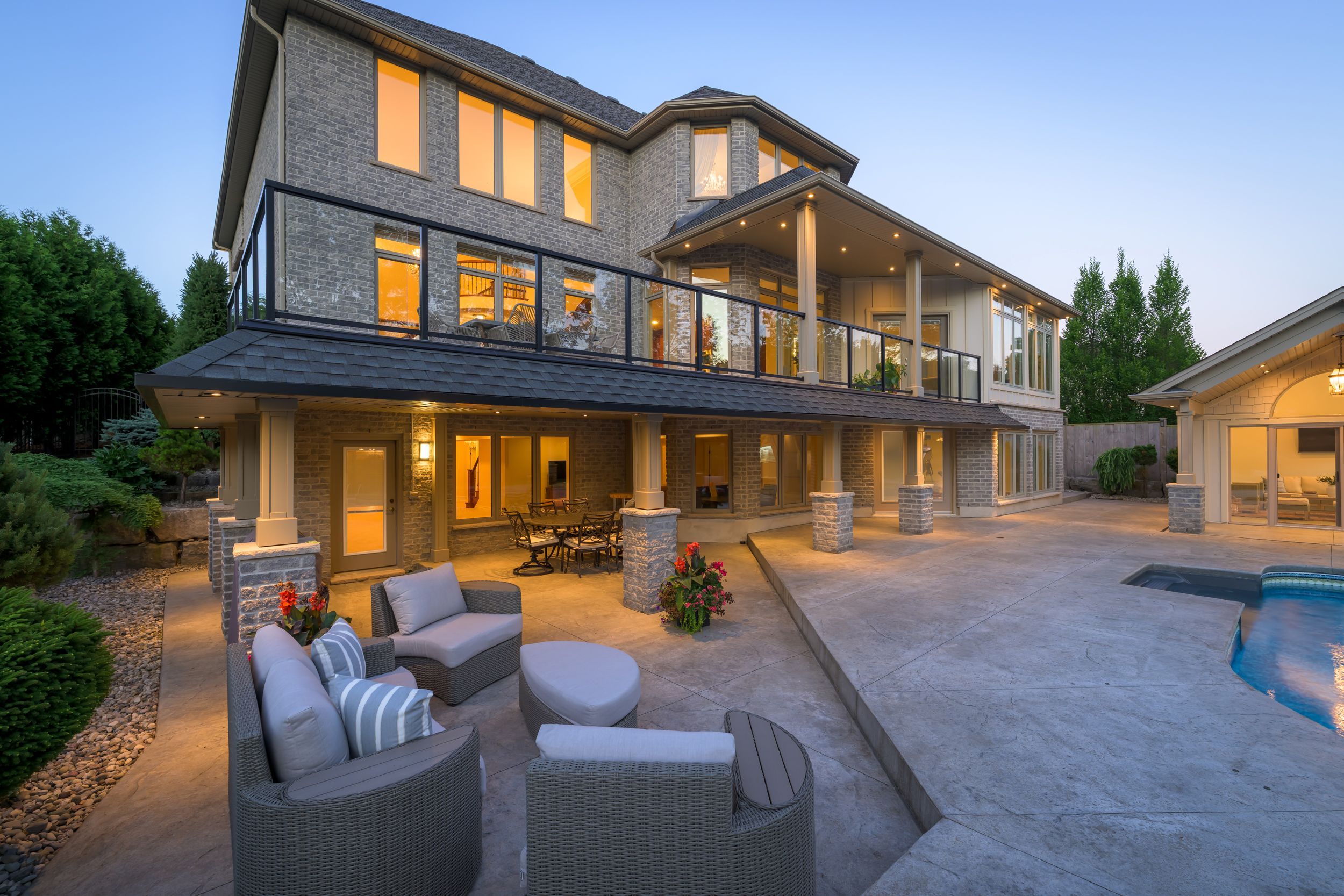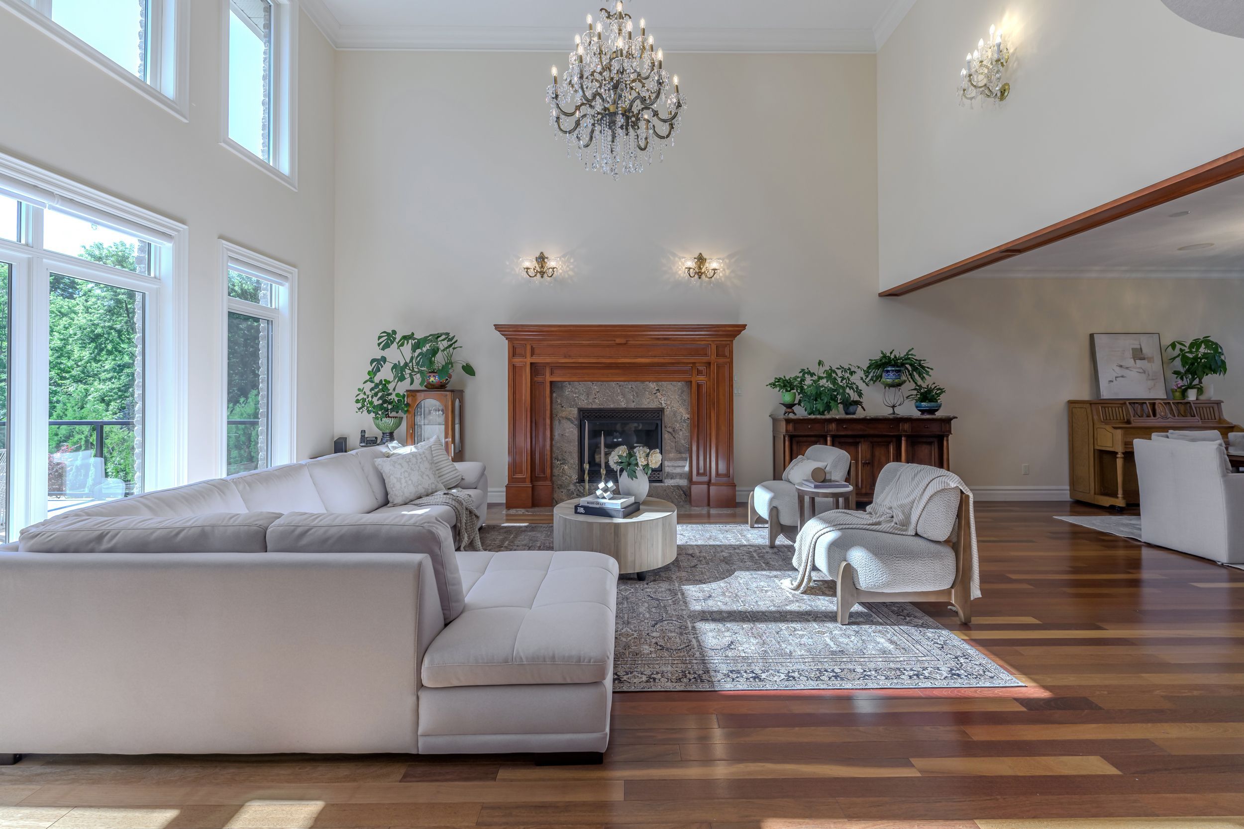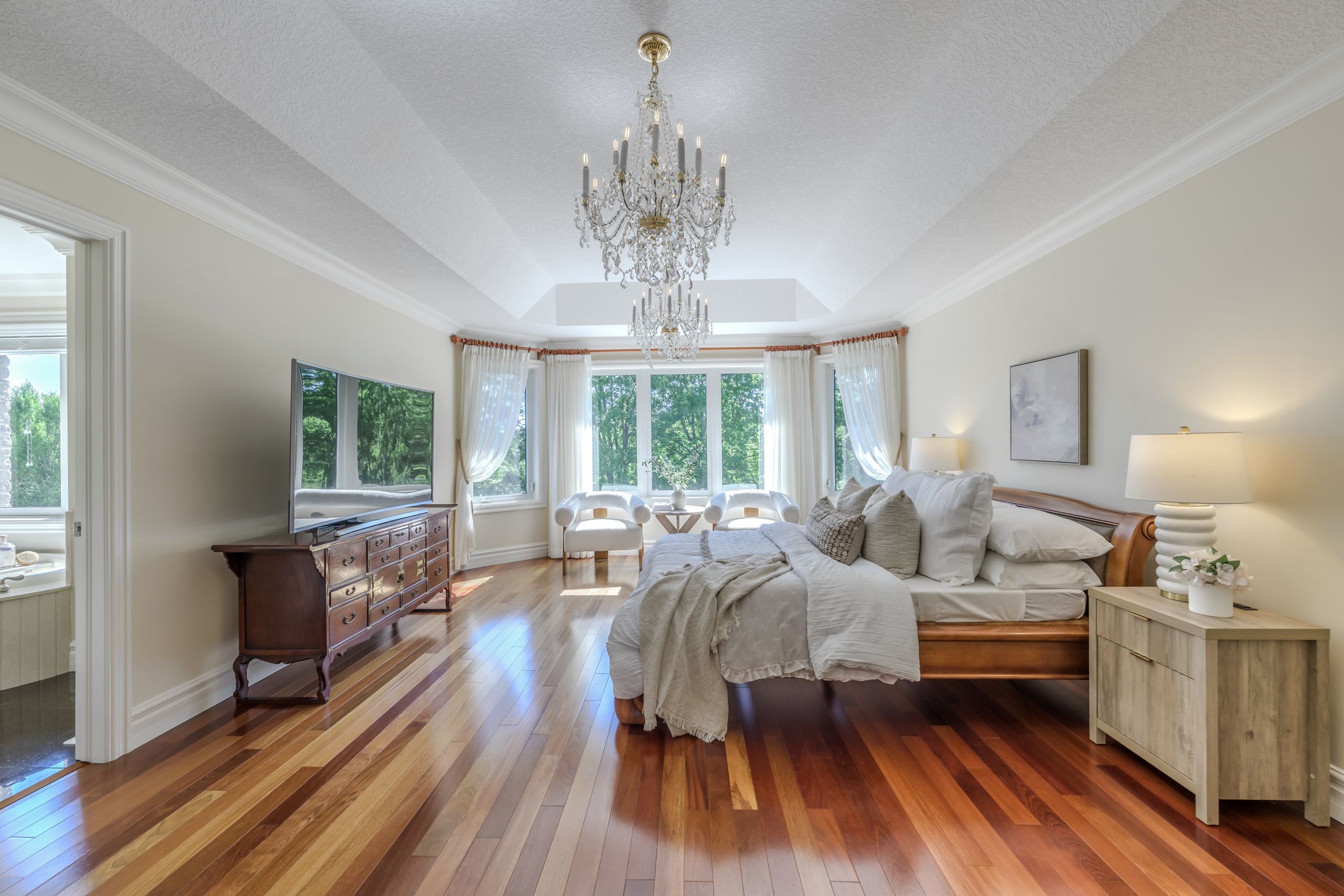 Nestled at the end of a quiet cul-de-sac in one of sunningdale's most prestigious enclaves, this extraordinary executive residence offers approximately 6,500 sq. Ft. Of luxurious living space backing directly onto the protected medway valley heritage forest. A stately stone façade with contrasting stone voussoirs crowning the arched windows and triple-car garage introduces architectural drama and elegance for a commanding first impression. Professionally landscaped grounds with sculptural evergreens, gardens, and elegant accent lighting establish the refined tone carried throughout the home. At the centre, a grand double-door entry framed by a soaring arched portico and transom glass invites you into the interior with a sense of architectural grandeur. Inside, soaring ceilings and a double-height great room with a dramatic wood and stone fireplace showcase a spectacular wall of windows framing tranquil forest views. Rich brazilian cherry hardwood adds warmth throughout. The crystal chandelier, arched transoms, formal dining area, and gallery-style overlook enhance opulence. The chef's kitchen features full-height cherry cabinetry, granite surfaces, upscale built-in appliances, a window-wrapped dinette, and a custom wet bar. A separate morning room opens to the upper deck with glass railings. A bonus room serving as an oversized pantry and a richly appointed office with custom cherry millwork elevate the main floor. Upstairs, the solid wood staircase ascends to a sunlit landing. The primary suite offers forest views, two walk-ins, and a spa ensuite. All 3 additional bedrooms enjoy ensuite access. The walkout level includes a guest room, full washroom and a family room/games/media fusion with gas fireplace. Separate gym with private patio access. Outside enjoy lush gardens, saltwater sport pool, extensive hardscaping & gate to the forest. The fully outfitted cabana with vaulted ceiling, wet bar, and full bath is ideal for entertaining or overnight guests.