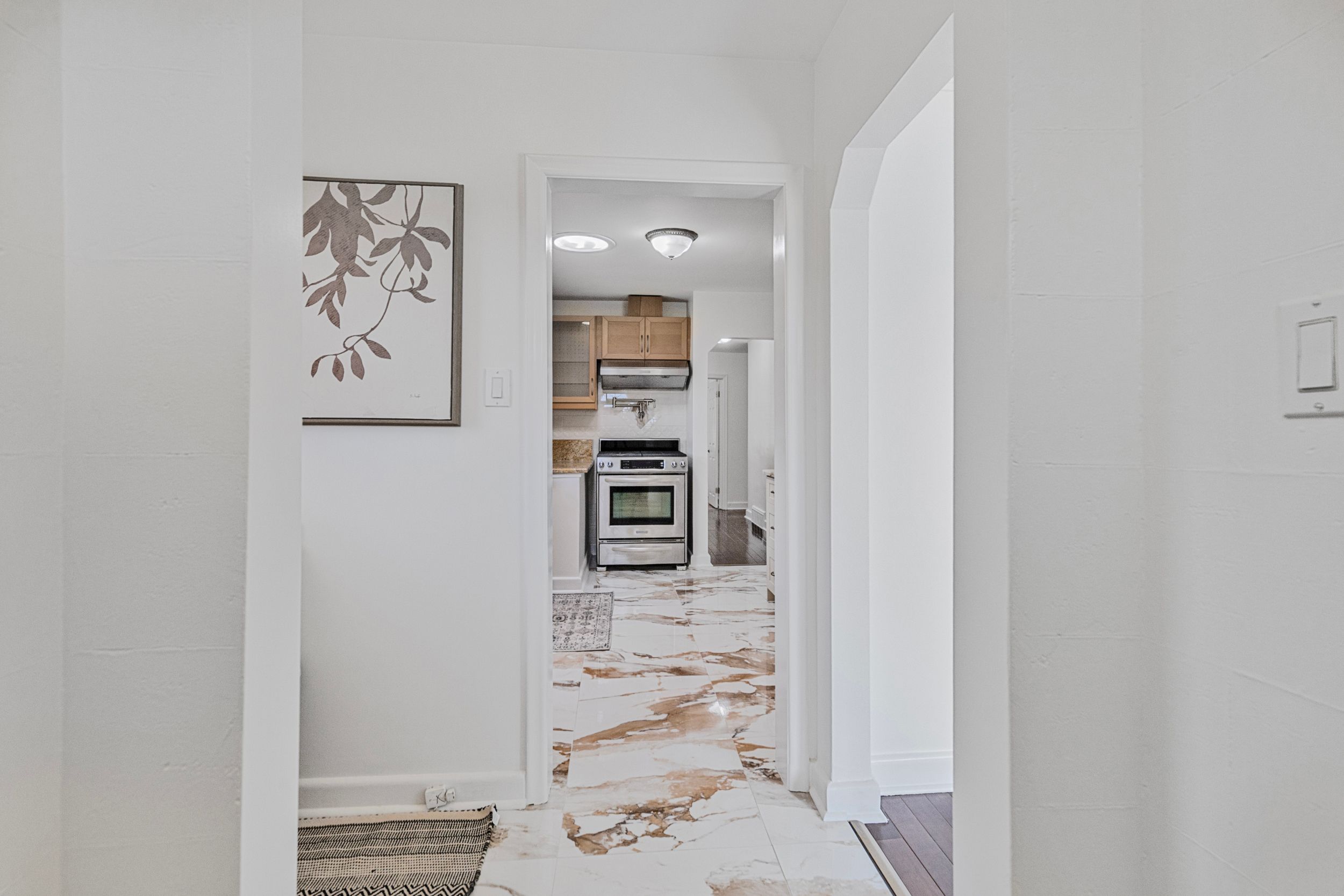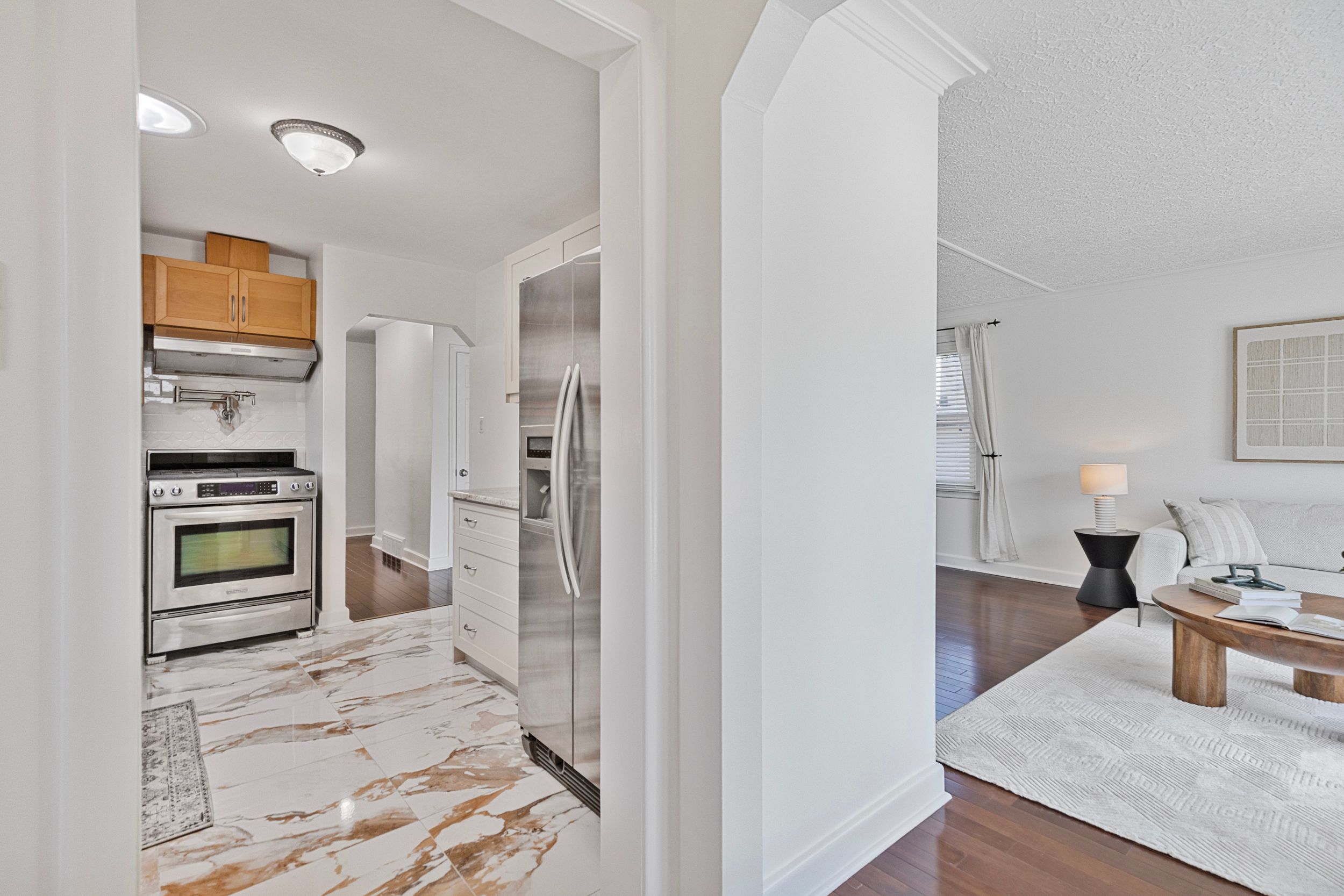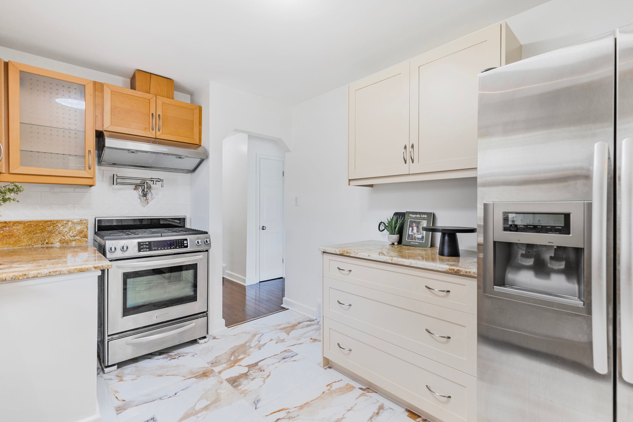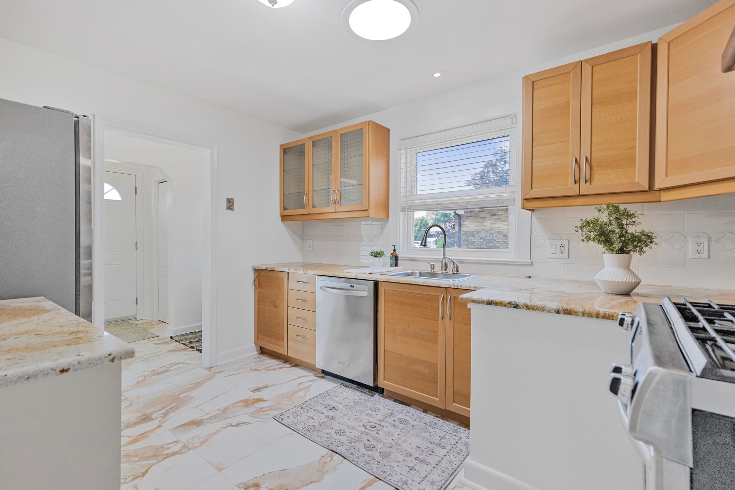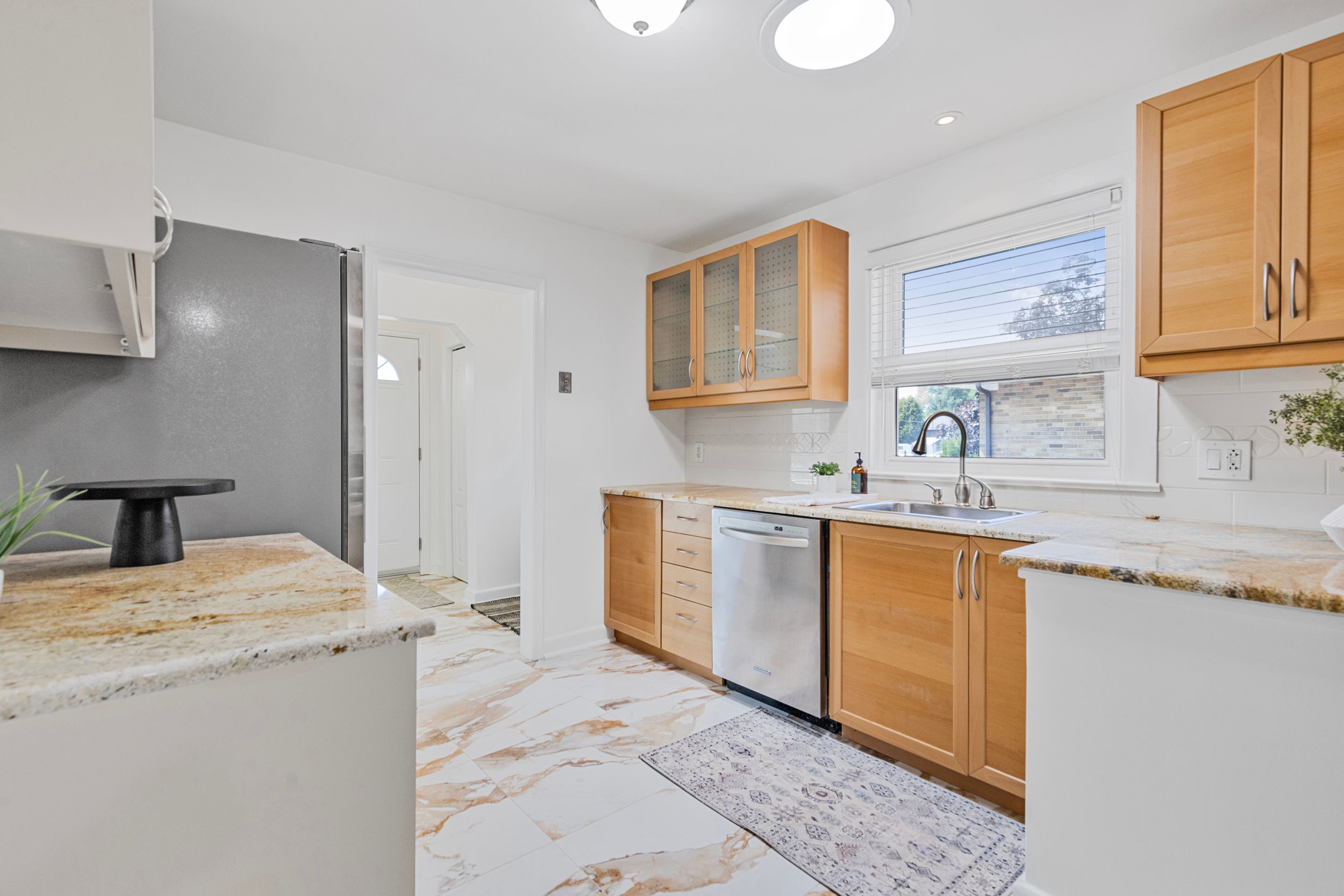 • Updated kitchen with granite countertops and ample storage for cooking enthusiasts.