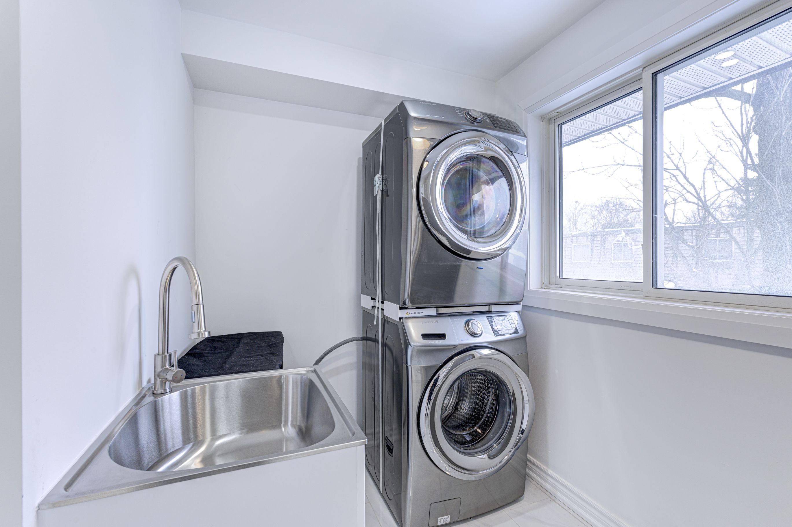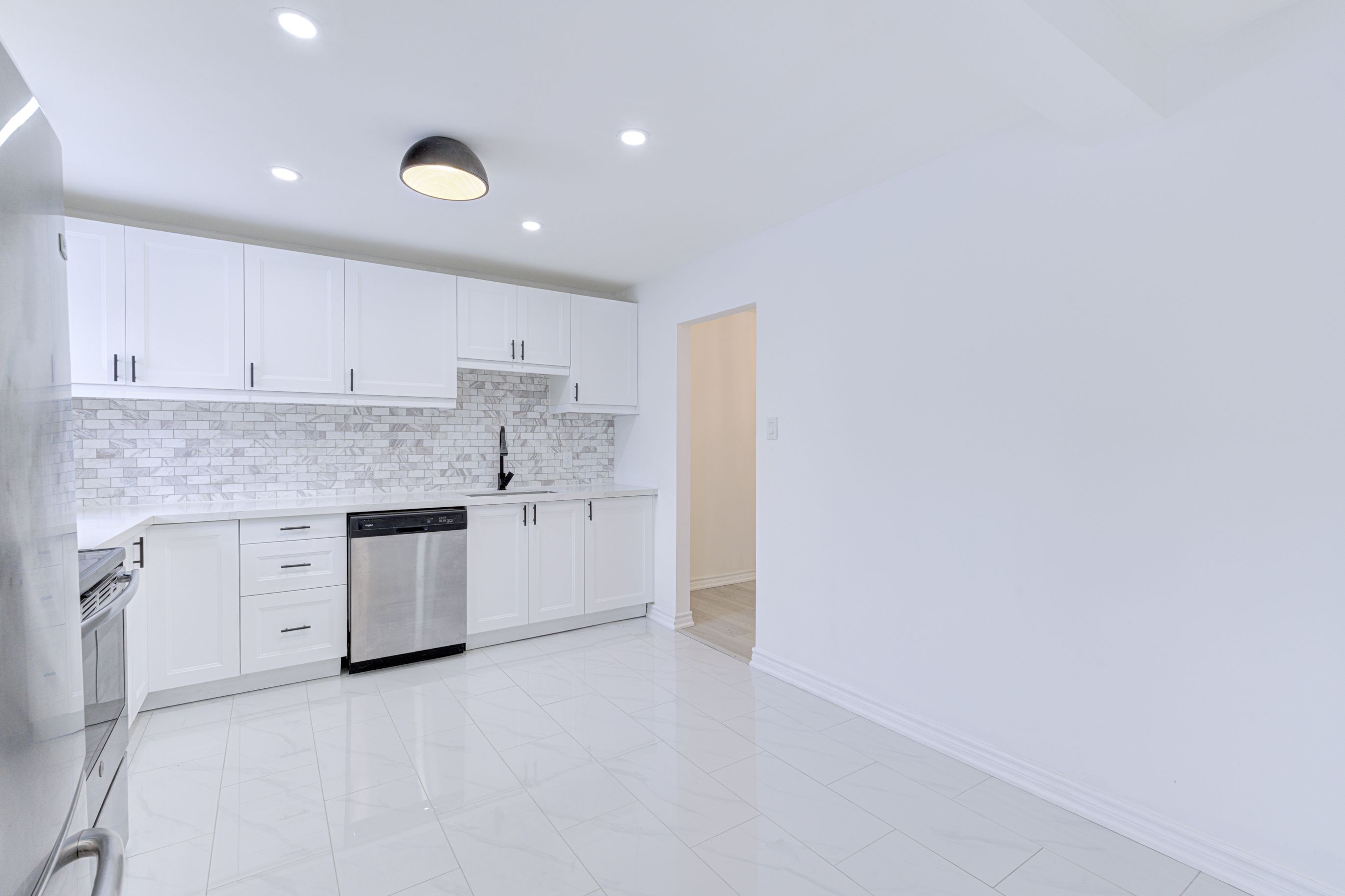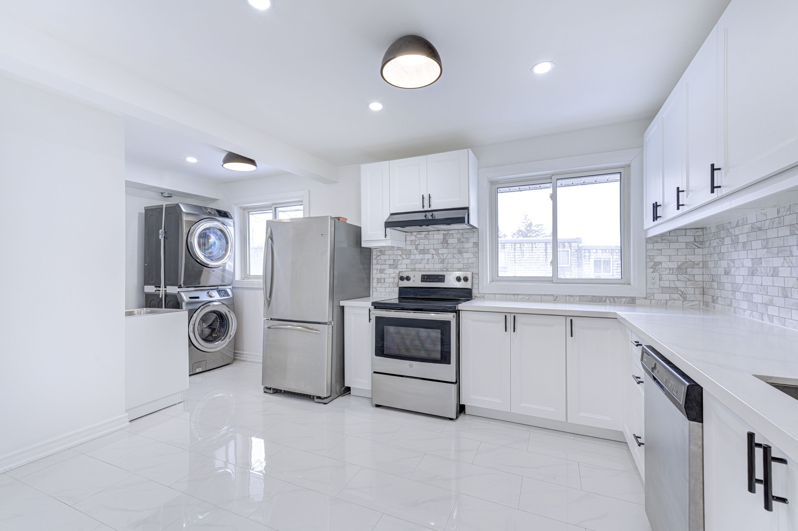 • Stylish kitchen with quartz countertops and stainless steel appliances.