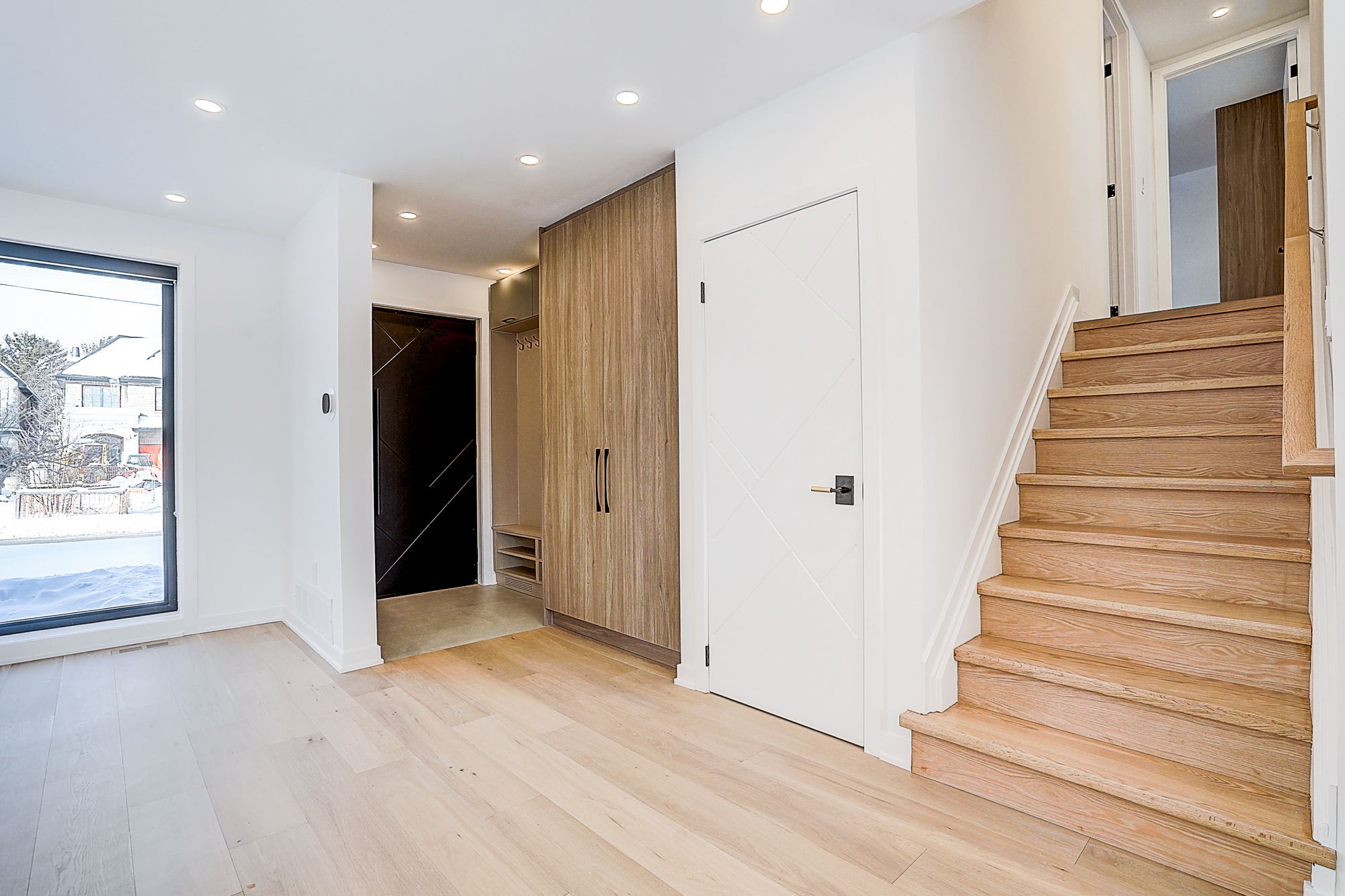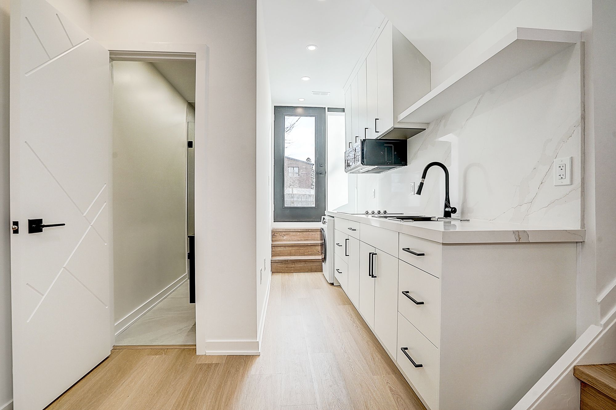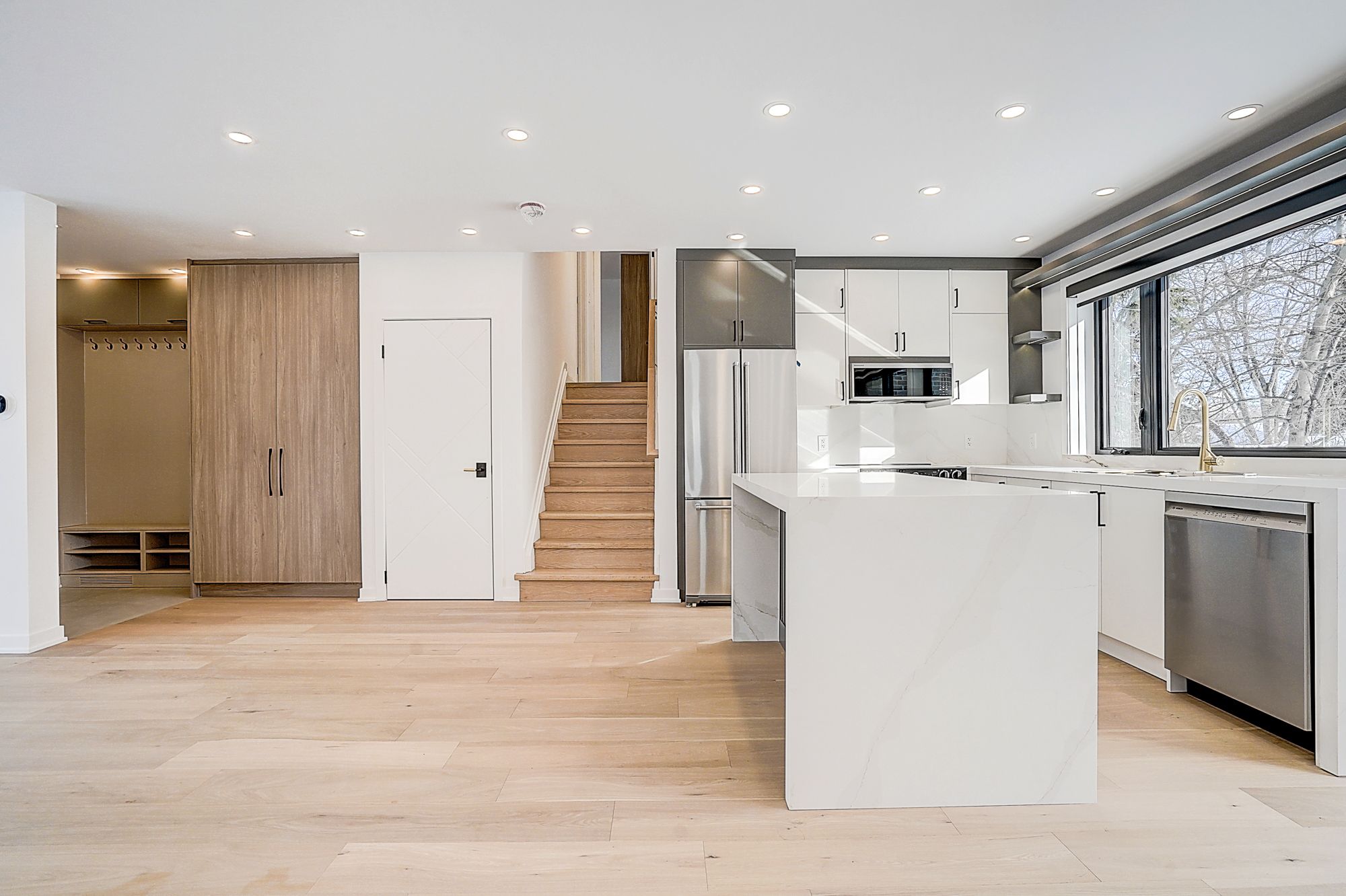 A masterfully reimagined luxury detached residence completely rebuilt from the studs with uncompromising attention to detail, this exceptional 3+1 bedroom residence showcases refined design and superior craftsmanship throughout. Featuring all-new plumbing, a state-of-the-art hvac system, upgraded electrical, premium new flooring, and professionally spray-foam insulated exterior walls, the home offers outstanding energy efficiency, comfort, and long-term performance natural light pours through all-new windows, highlighted by a breathtaking panoramic living room features window and an impressive 8-foot sliding glass door that seamlessly extends the living space onto the private deck-creating an effortless indoor-outdoor lifestyle enhanced by freshly sodded a fenced rear yard with lush green lawn, five-car parking including a single-car garage throughout the home, all-new modern designer blinds provide privacy while enhancing the clean, contemporary aesthetic. The home offers two beautifully appointed modern 4 piece bathrooms thoughtfully designed with sleek finishes and elegant curb-less showers for a seamless spa-inspired experience. All bedrooms, along with the main entrance, feature custom- built-in closets complete with integrated drawers, offering both refined organization and sophisticated functionality. Two designer custom kitchens boast bespoke cabinetry, contemporary finishes, and elevated functionality-ideal for multi-generational living or a sophisticated in-law suite. Custom double-panel interior doors enhance the home's elegant aesthetic, while the grand luxury fibreglass main entrance door creates a striking first impression with enhanced security and curb appeal. This is not simply a renovation-it is a complete transformation. A rare opportunity to own a meticulously rebuilt, turnkey detached home offering modern luxury, and timeless sophistication.