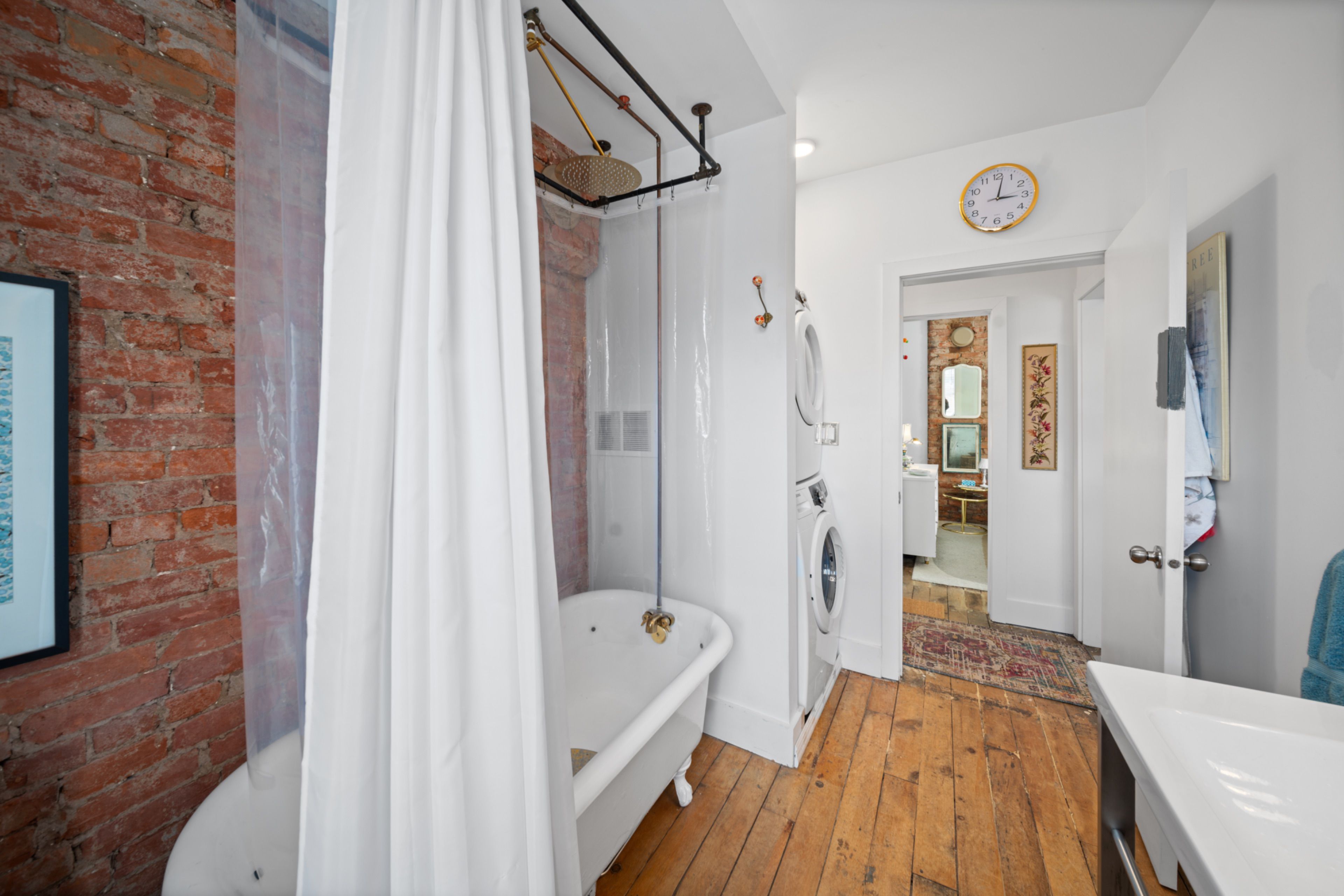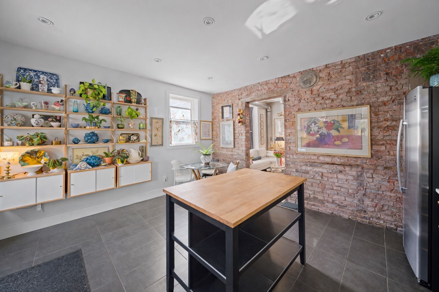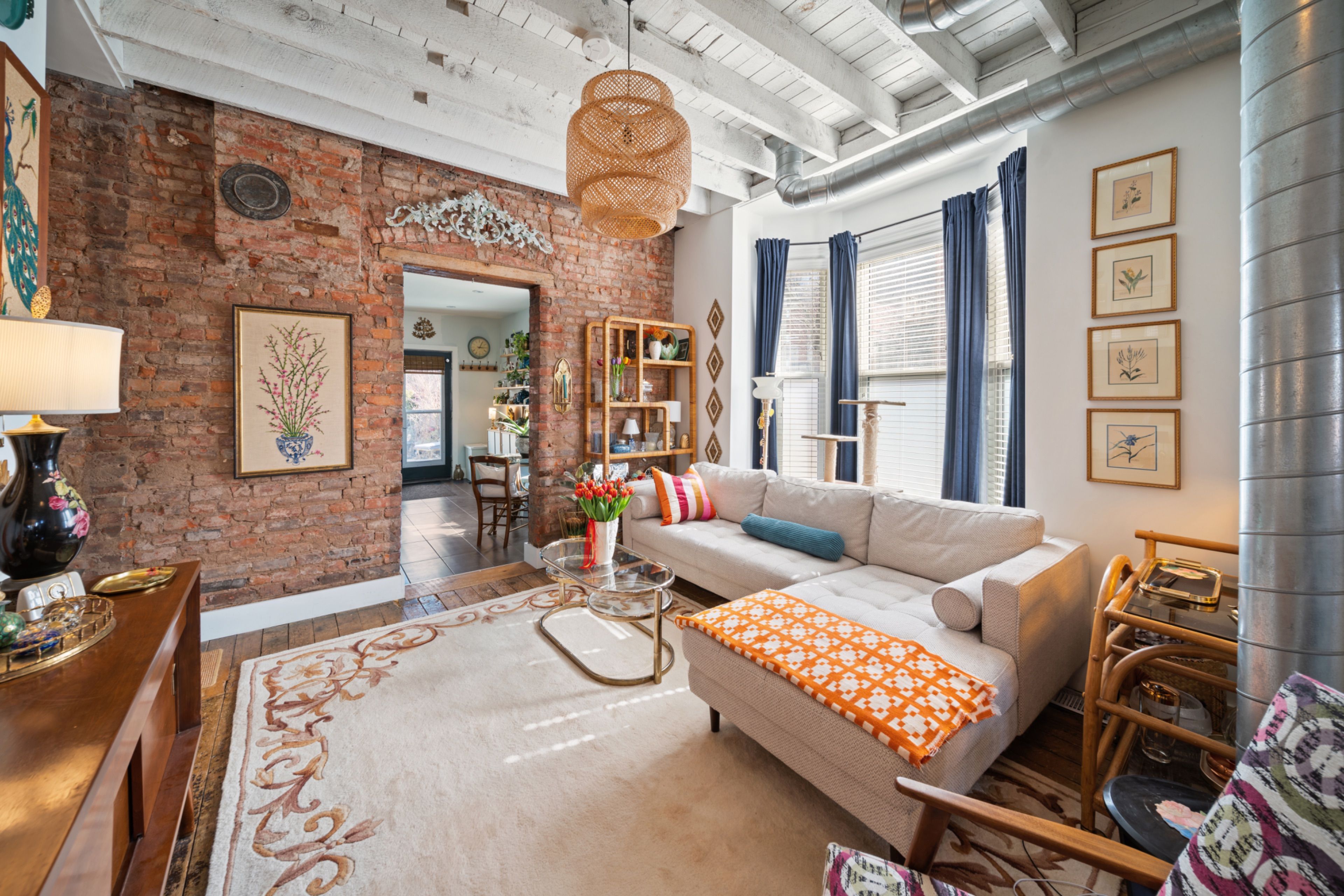 • 10-foot ceilings and exposed brick walls create a bright, inviting space.