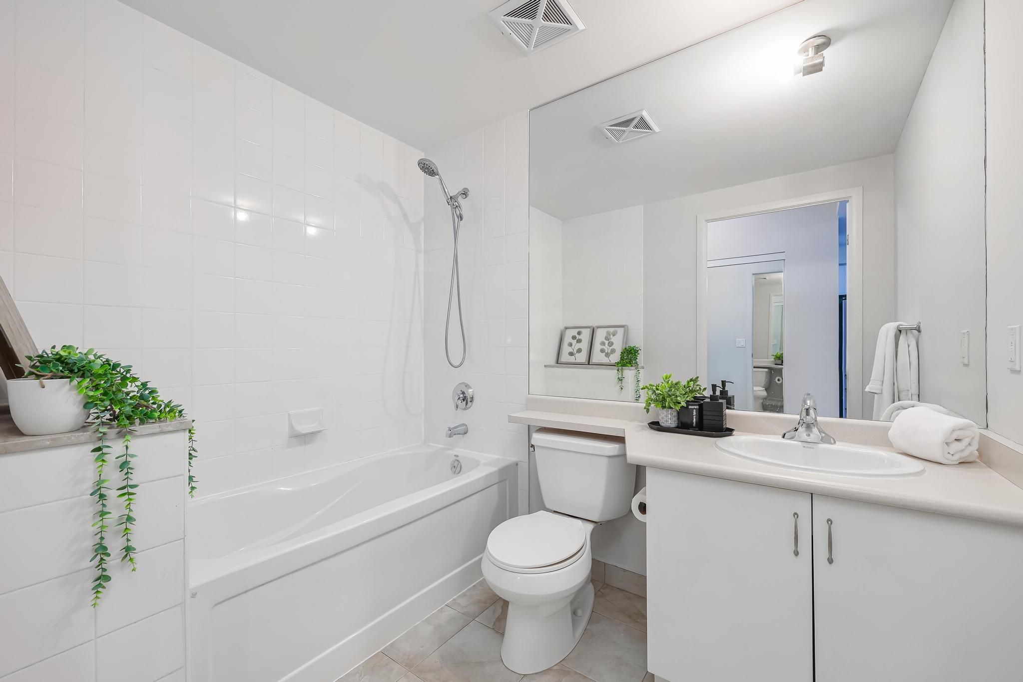 Step into this well-maintained one-plus-den suite, offering 692 sf of bright, open-concept living space. Freshly painted and move-in ready, the home features hardwood flooring throughout the living areas and a sleek kitchen equipped with stainless steel appliances. The versatile den provides a functional environment perfect for a home office or creative studio. Complete with parking and a locker, this residence is situated in a wonderful building with a robust amenity package, including a fitness centre, indoor pool with jacuzzi, sauna, yoga studio, and an outdoor patio, all supported by a 24-hour concierge. Whether you are a first-time buyer, a savvy investor, or a professional seeking the ultimate downtown lifestyle, you'll love being steps away from transit, vibrant shops, top-tier restaurants, and scenic waterfront trails.