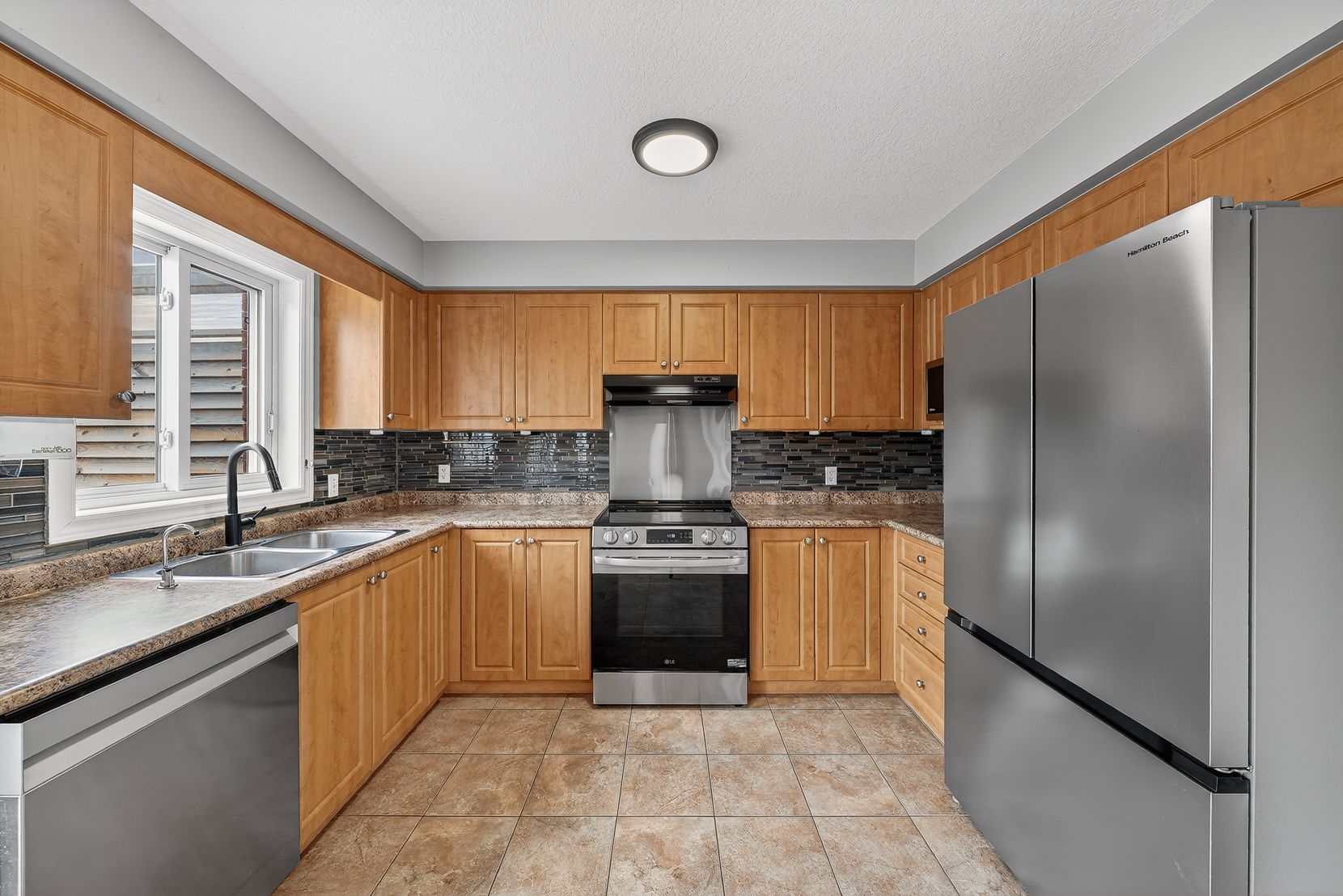 • Functional kitchen with stainless steel appliances and coffee bar area.
