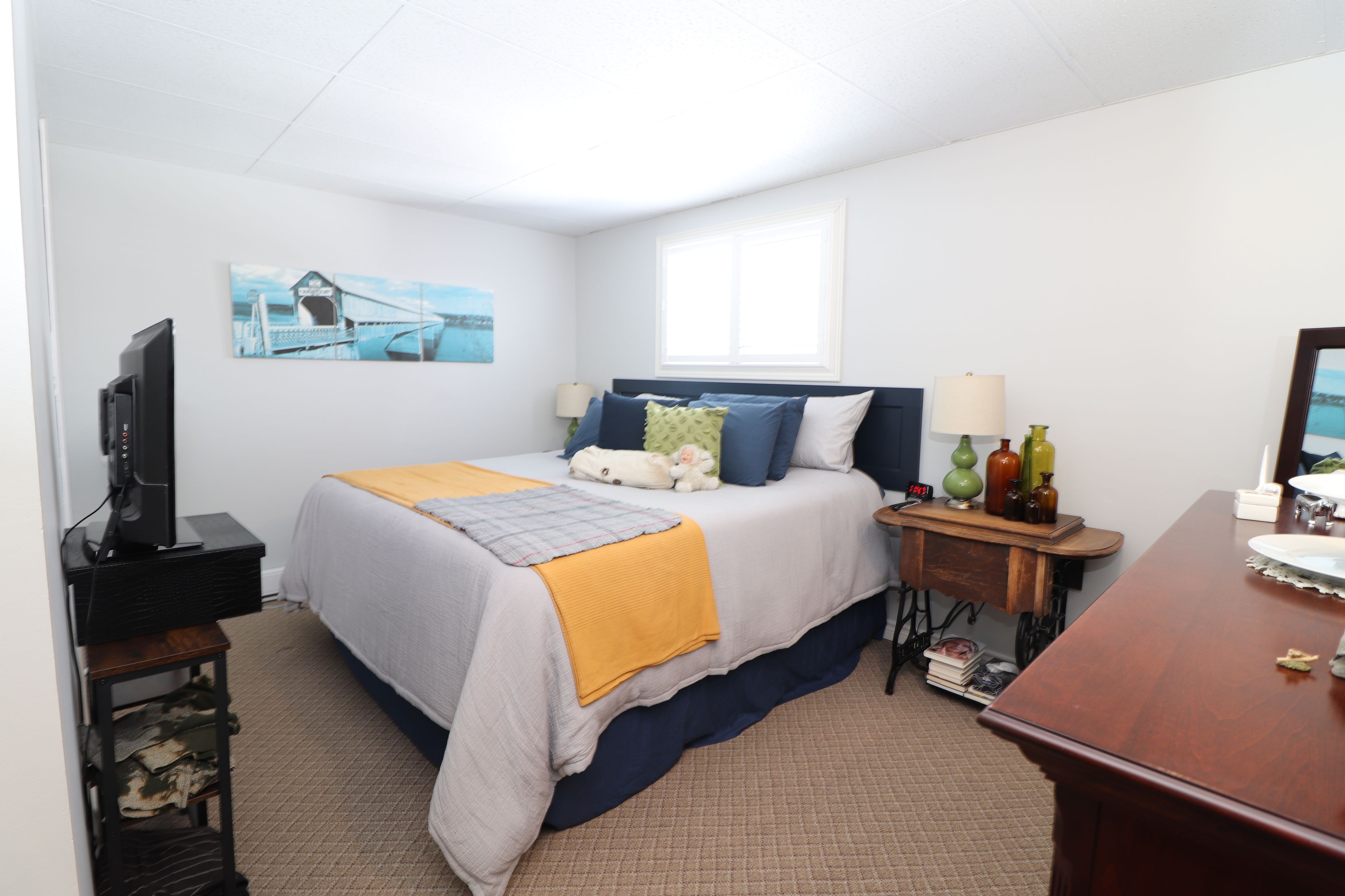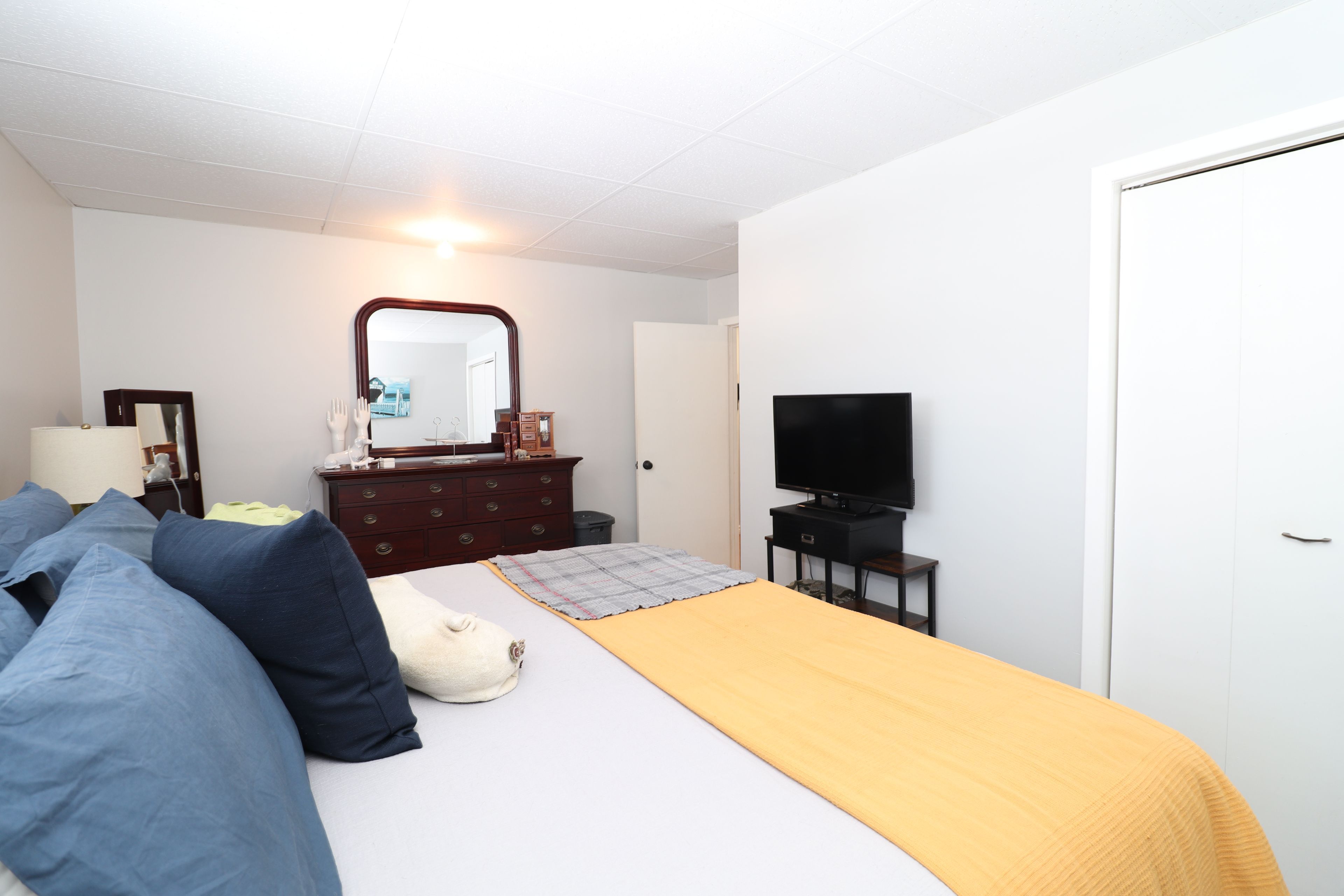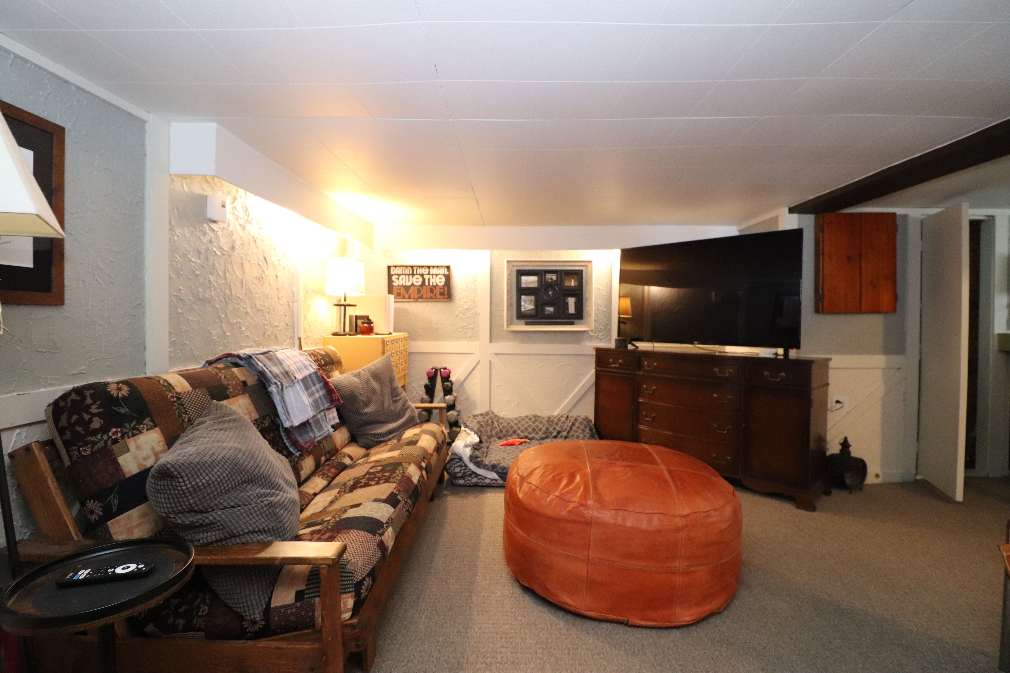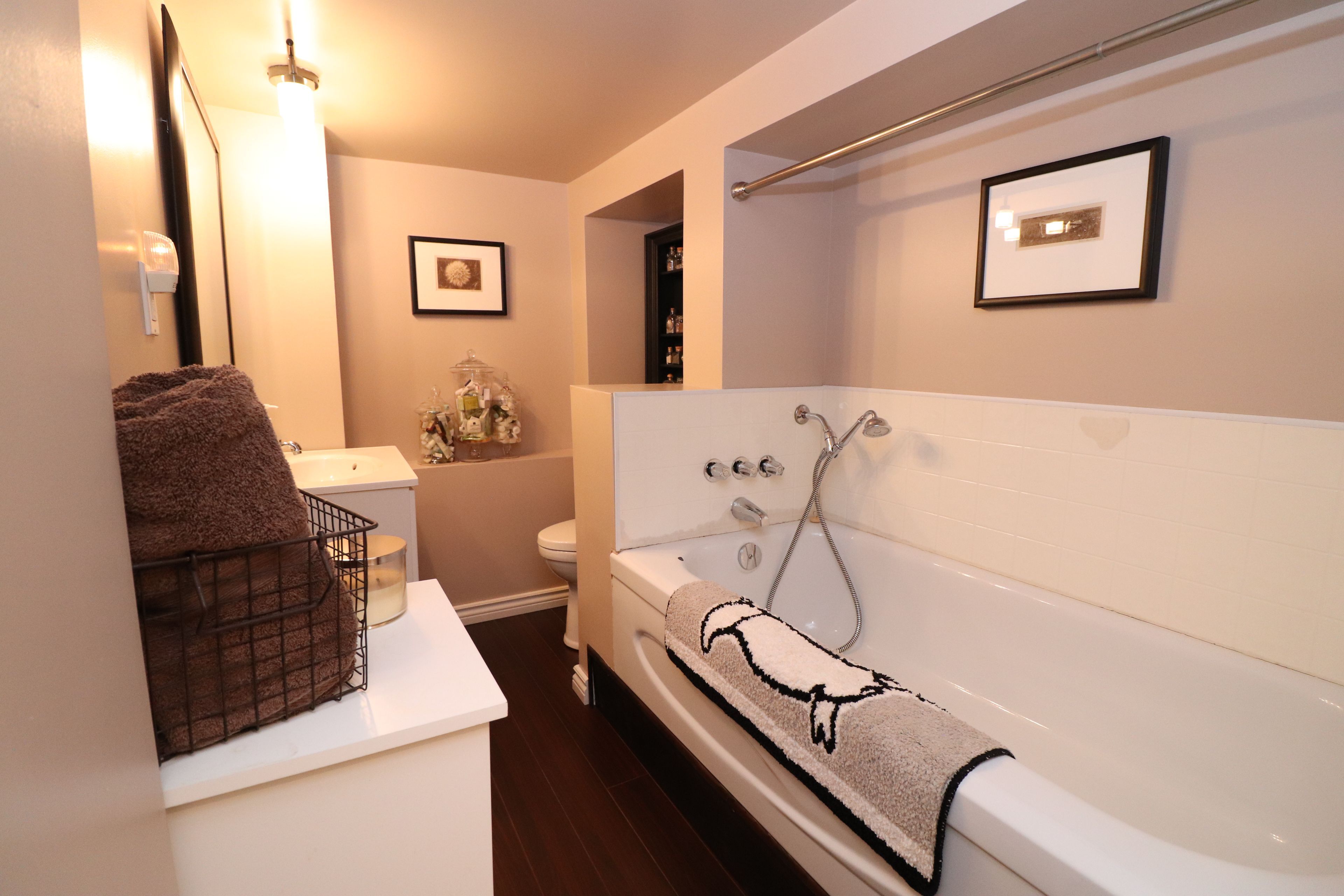 • Lower level includes family room, bar area, and third bedroom.