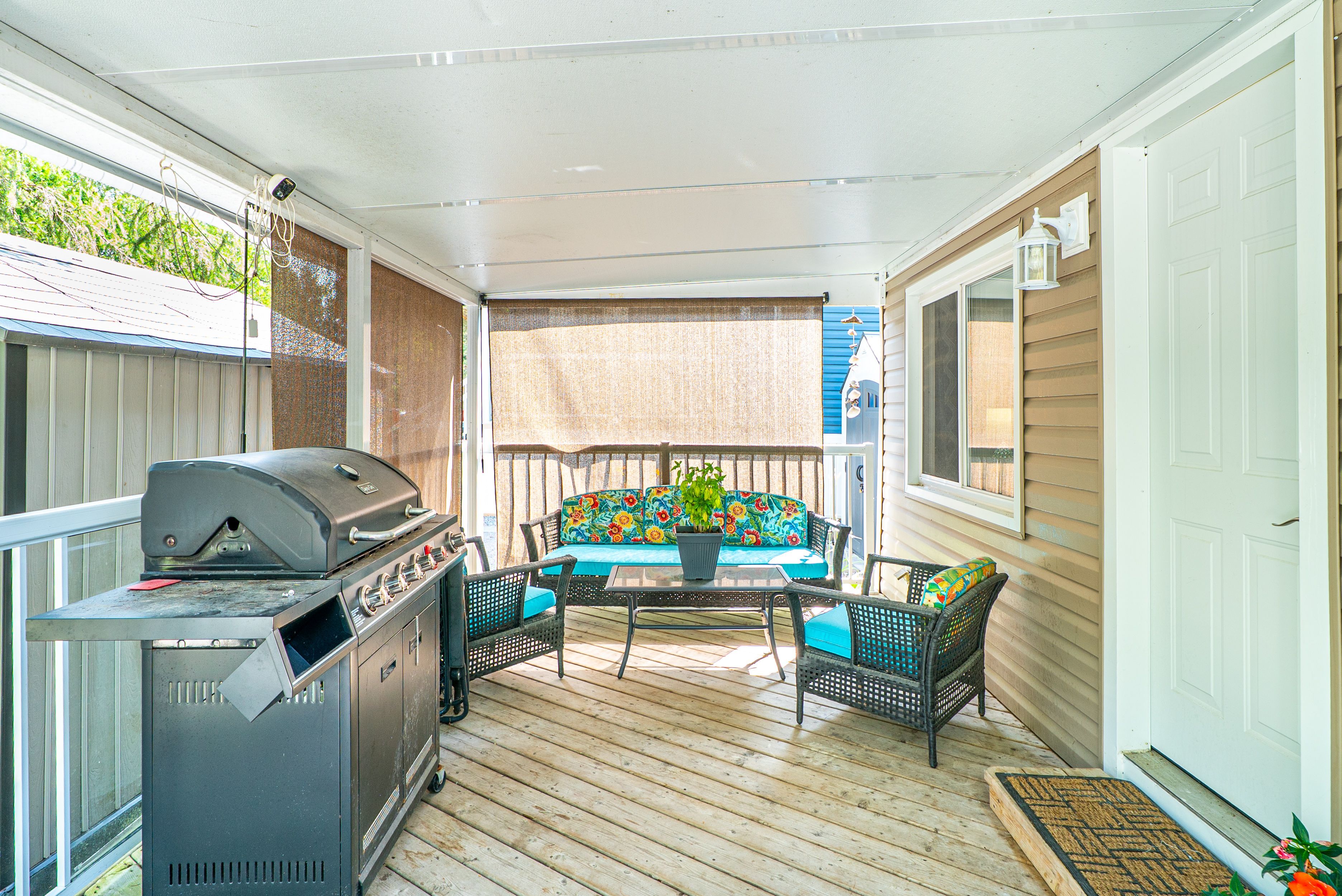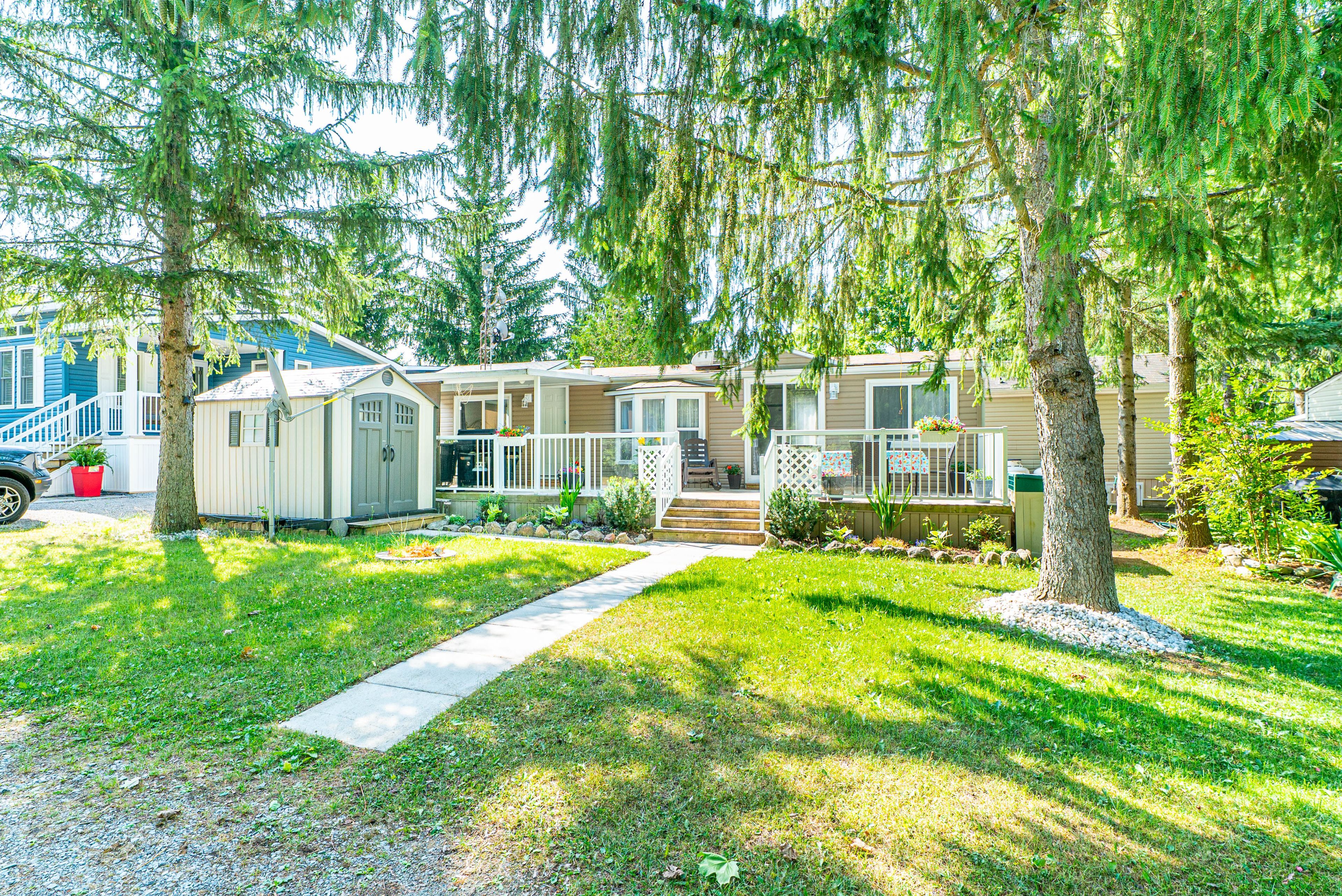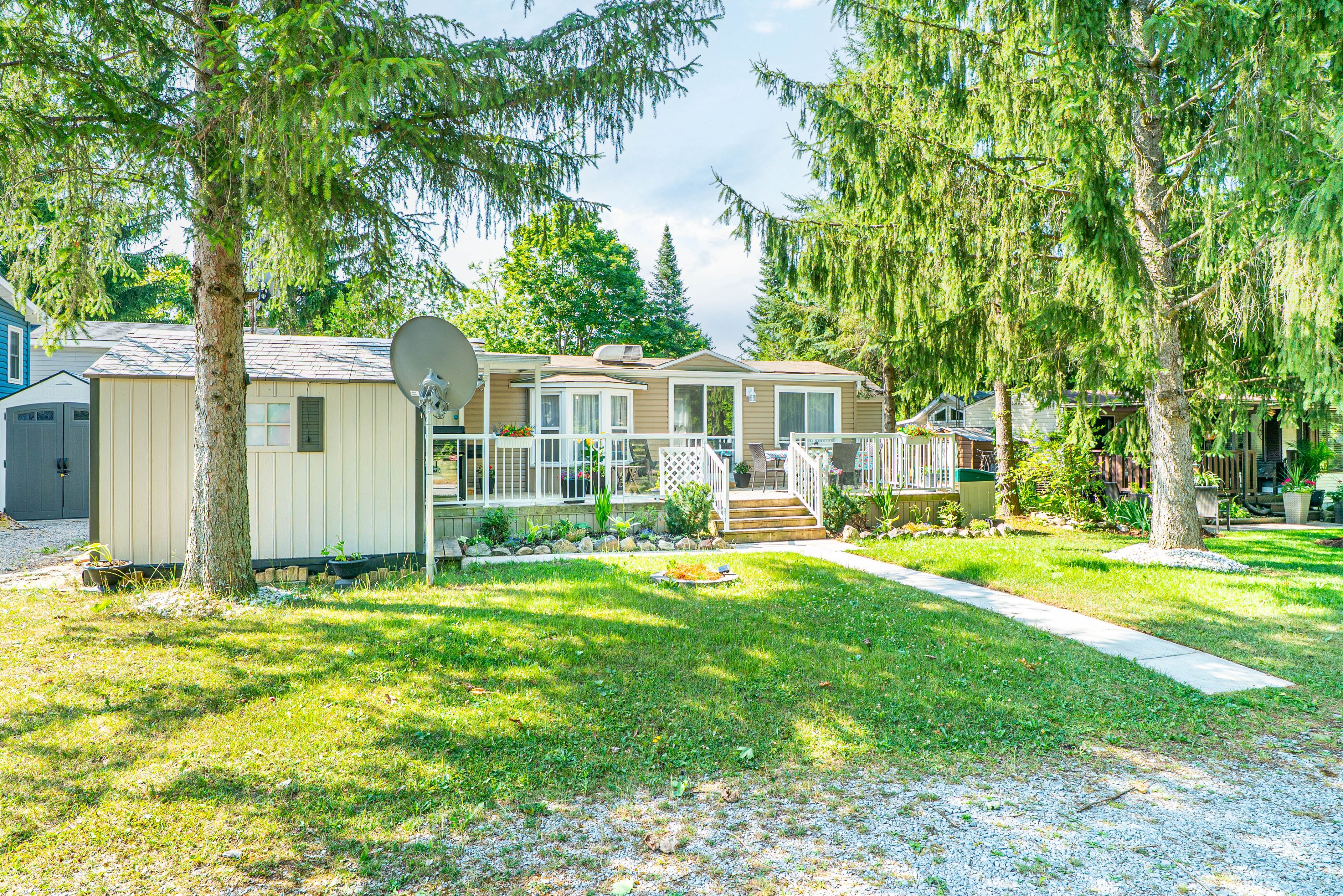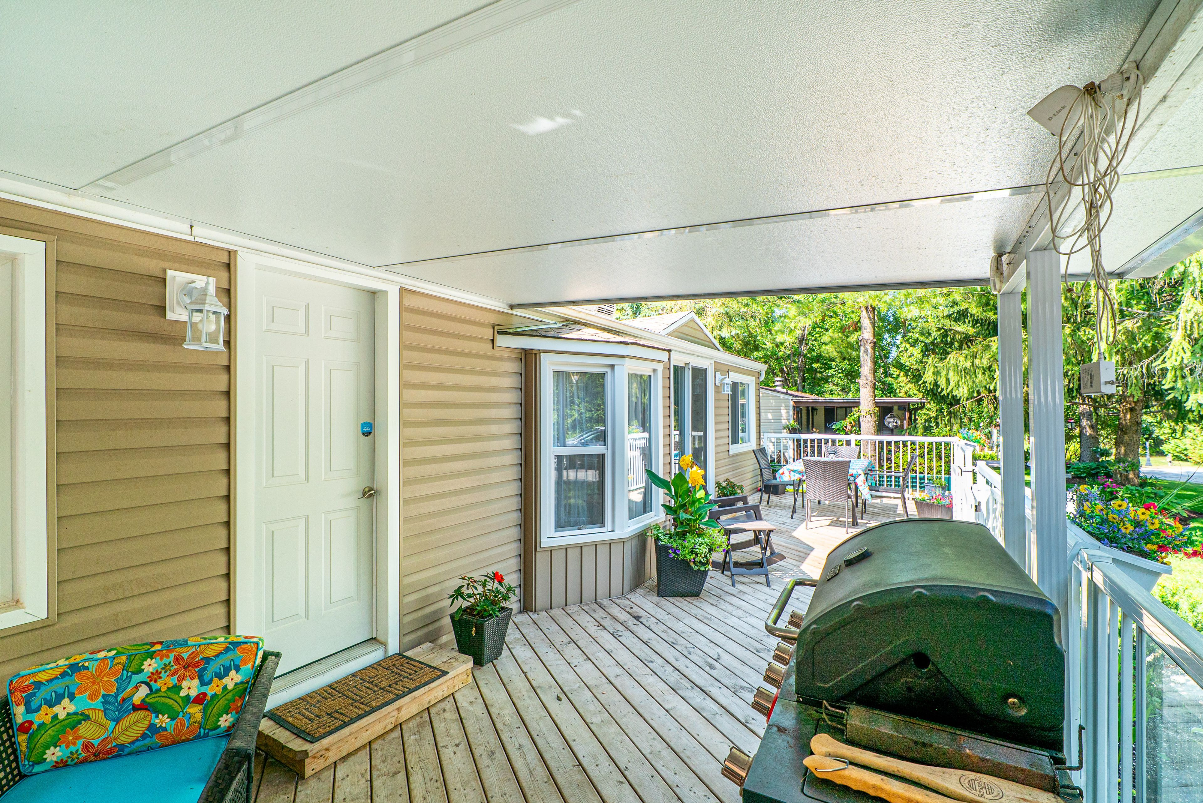 Enjoy carefree seasonal living (may to october) at the sought after nestle in resort in dunsford! This well maintained 1 bedroom, 1 bathroom trailer offers a cozy eat-in kitchen with centre island, a bright living room, and plenty of outdoor space with a covered porch and a spacious deck, perfect for relaxing or entertaining. Nestle in resort offers endless amenities including a heated pool, children's wading pool, boat docks (extra fee), fishing, jumping pillow, beach volleyball, basketball court, horseshoe pit, rec hall, and more. A fantastic way to enjoy the warm weather seasons!