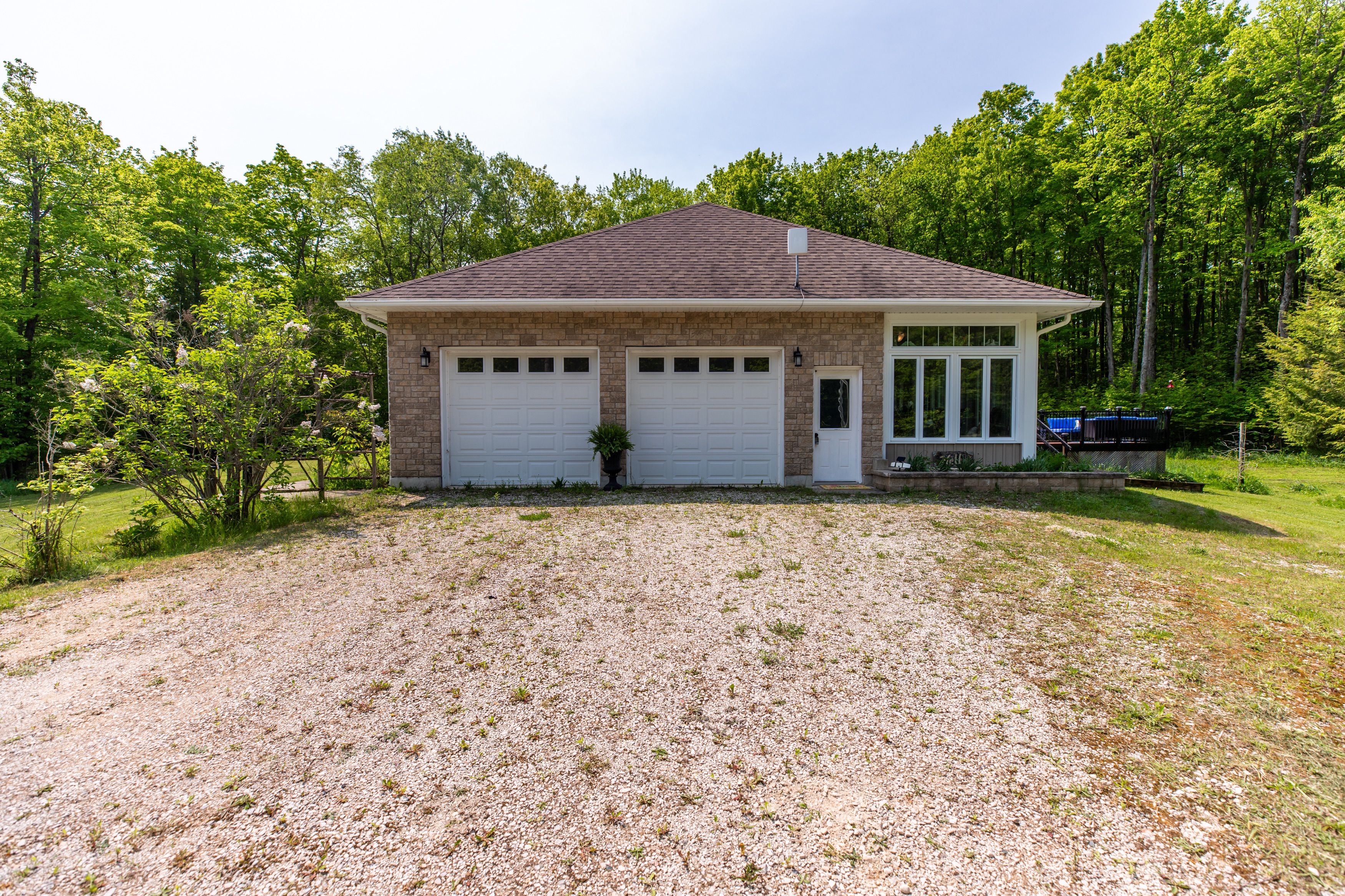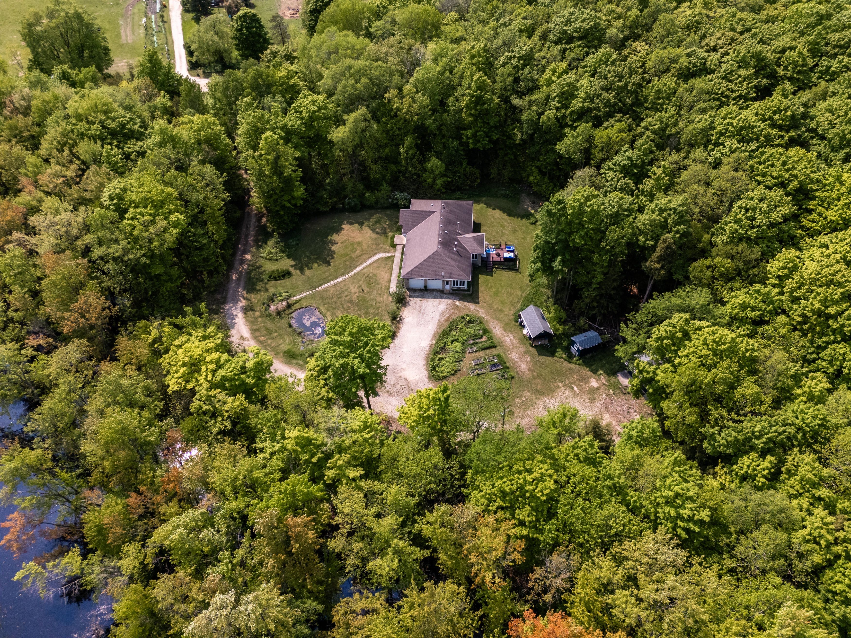 Tranquil 49+ acre retreat with a breathtaking 2008 shouldice stone bungalow nestled behind a serene pond. Enjoy ultimate privacy along the winding driveway to this peaceful haven. The home boasts open-concept living, hardwood floors, a gourmet kitchen with a large island and rich wood cabinetry, and stunning views from every room. A cozy sunroom with a wood cookstove is ideal year-round. The main floor features 3 bedrooms, 2 baths (including an ensuite and walk-in closet), and convenient laundry. The walk-up from the lower level offers in-law potential with a rec room, bar, games area, 2 additional rooms, a bath, and in-floor heating. No carpet, only tile, hardwood, or stone throughout. Outdoors: 15 fenced, workable acres, scenic trails, mixed forest, a 36x24 shop with loft and hydro, rv hookup, sheds, a chicken coop, woodshed, and fascinating eco ponds. Savour wildlife from the deck or porch, stay connected with great internet, and embrace a sustainable lifestyle with wood heat and space for animals. A quintessential country sanctuary. Located just 20 minutes to durham and 30 minutes to owen sound, this chatsworth township property is your chance to live close to nature, whether you're dreaming of hobby farming, raising animals, gardening, or simply enjoying the quiet beauty of grey county.