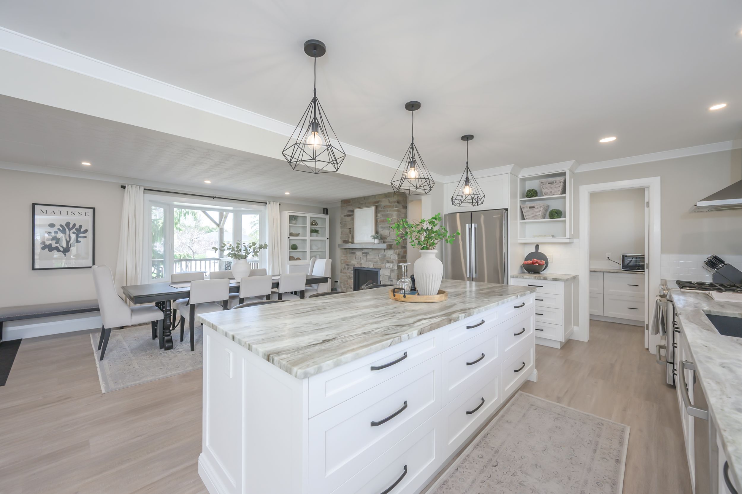 • Gourmet open concept kitchen with quartz countertops and massive island.