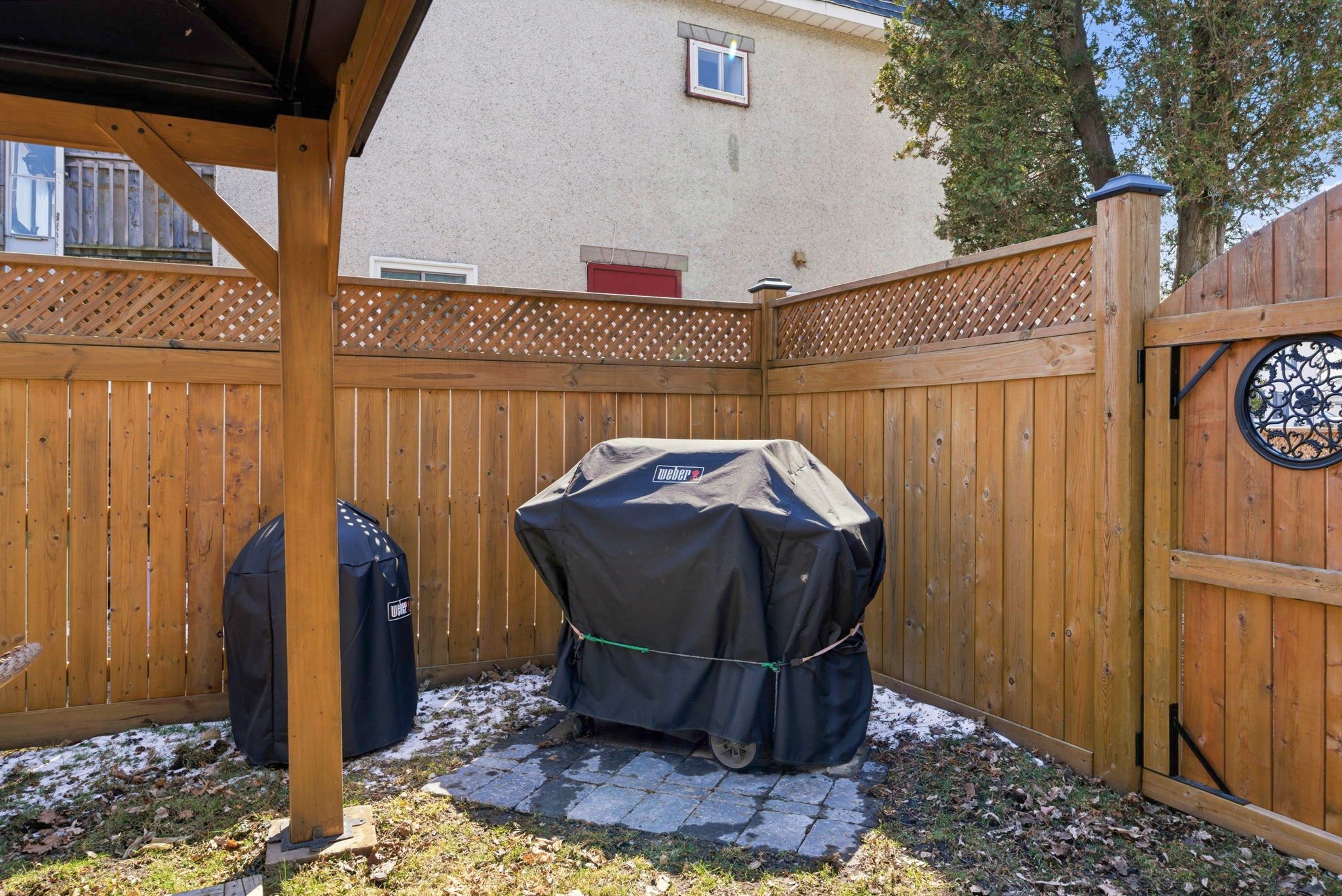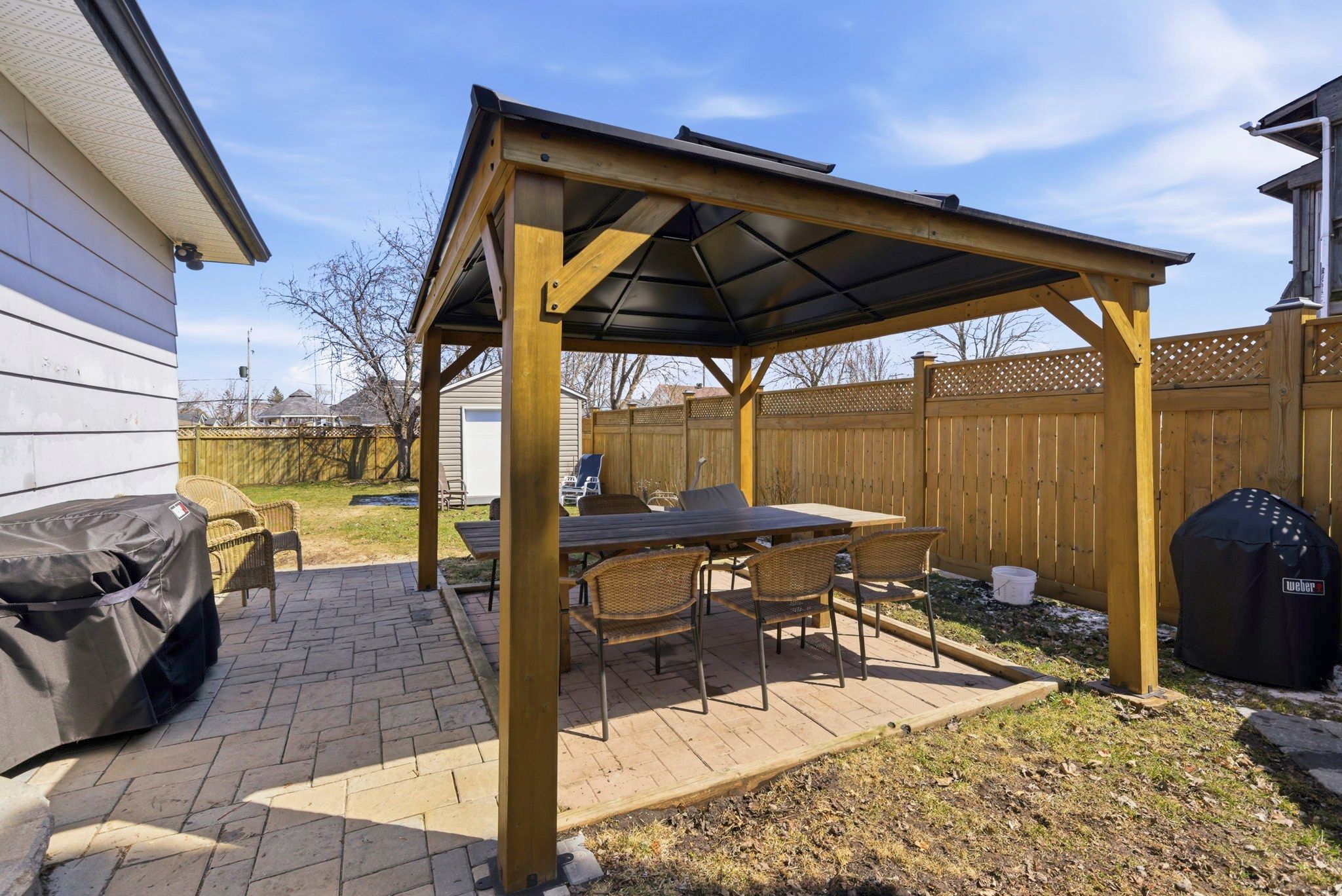 • Fully fenced yard with a gazebo and interlocking stone patio.