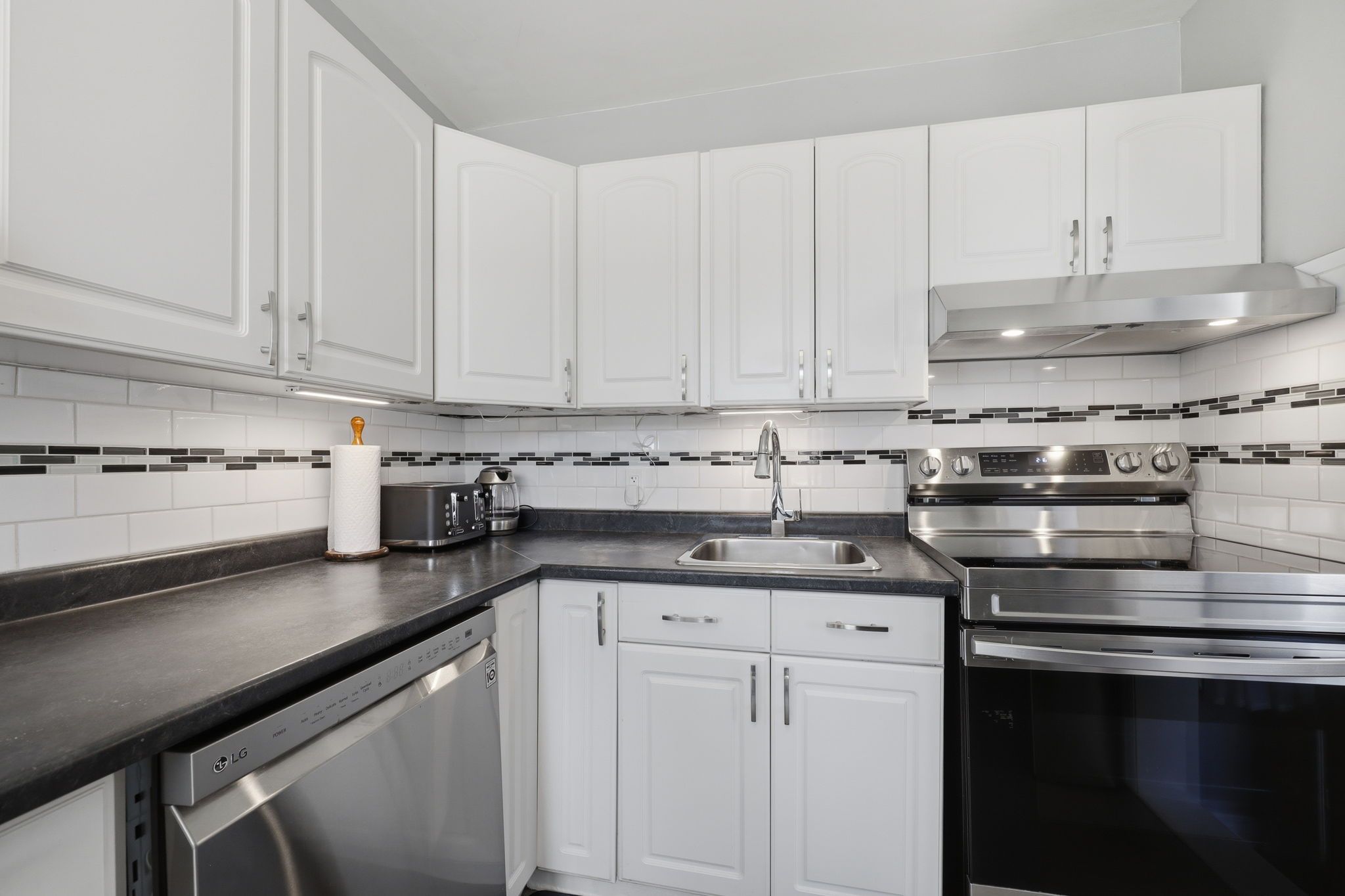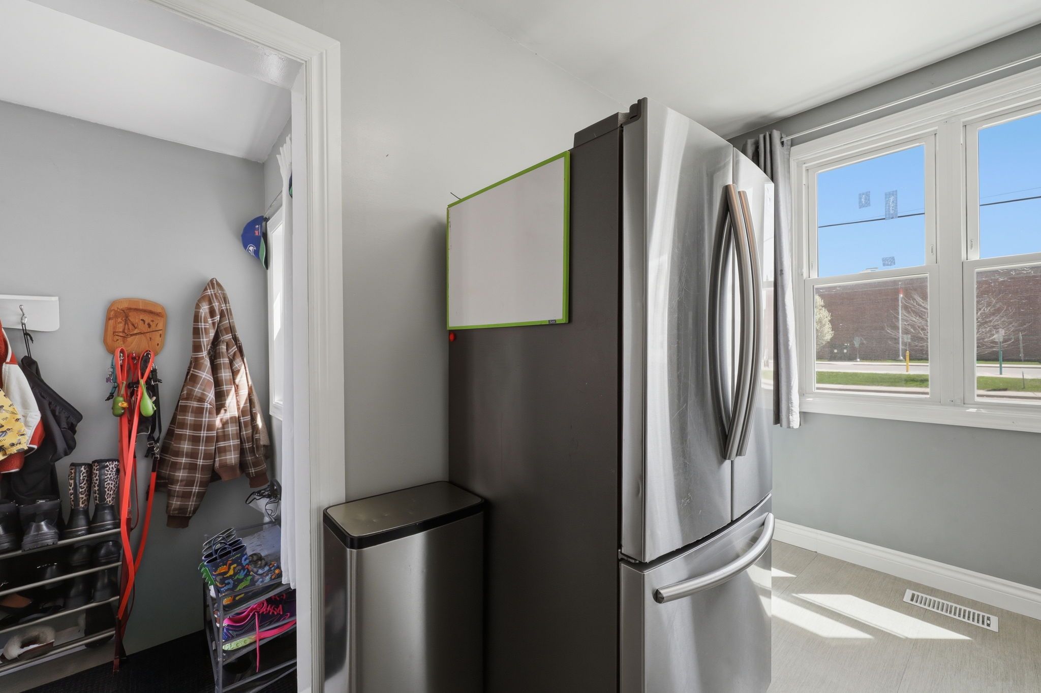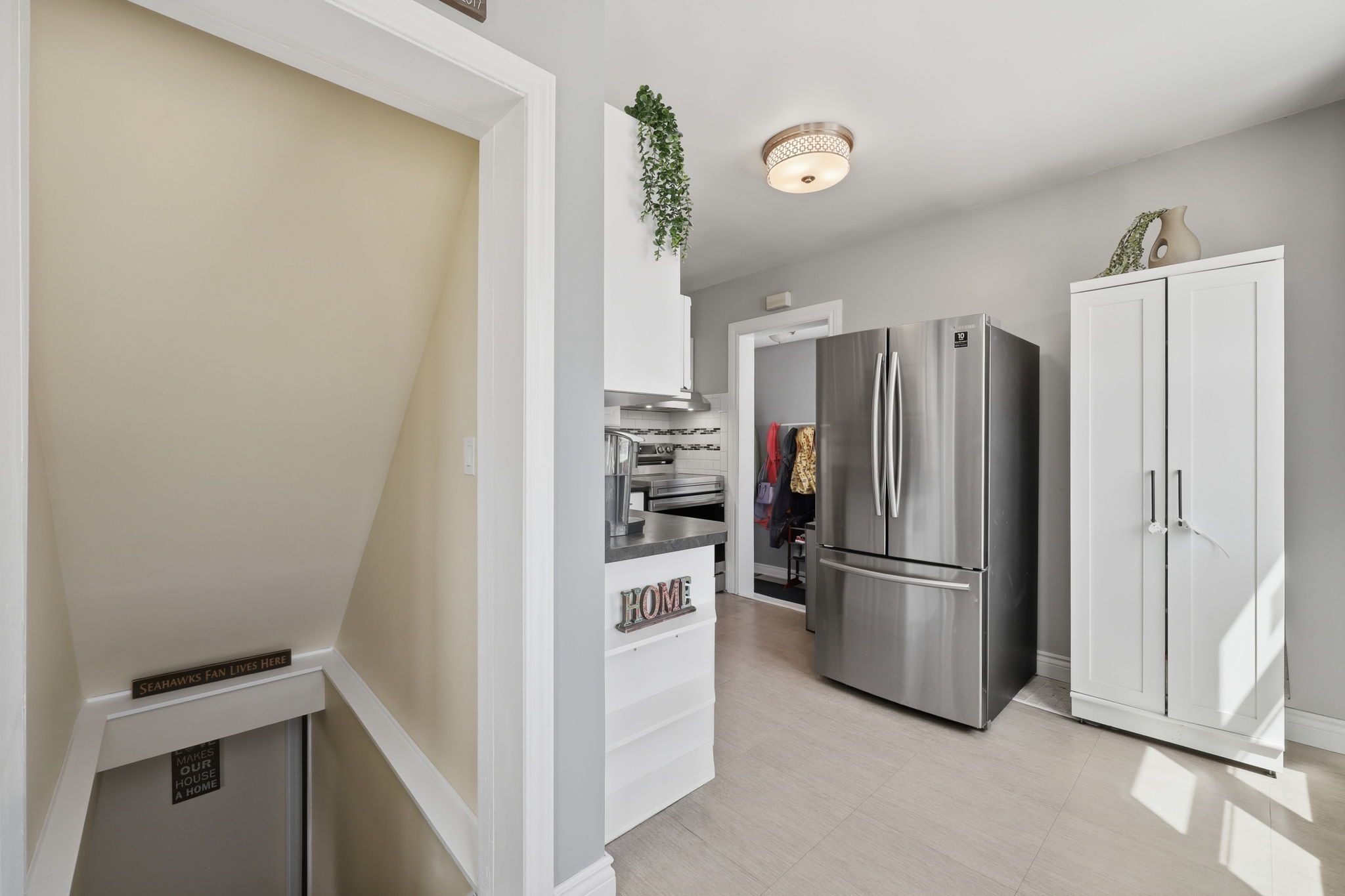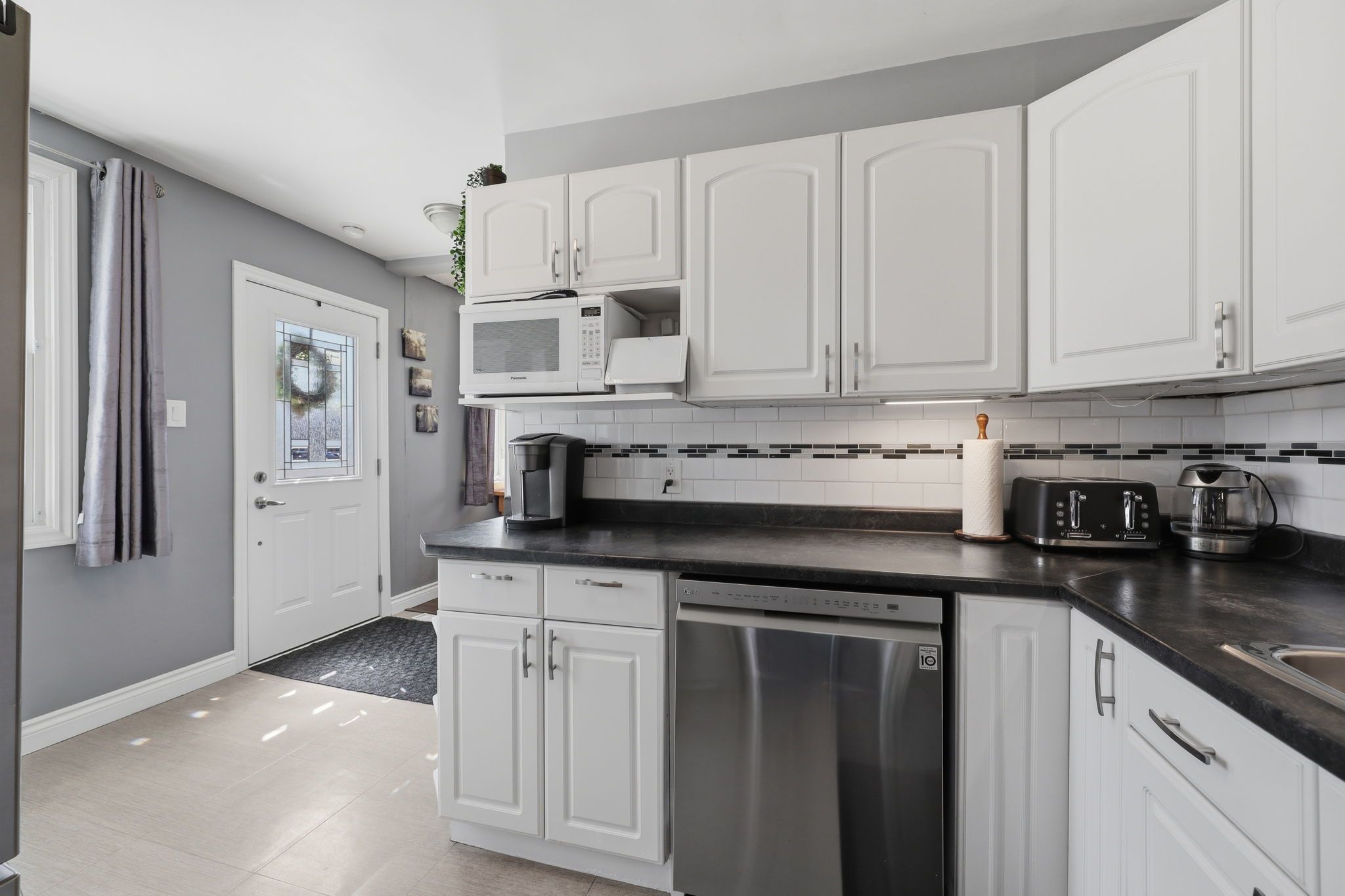 • L-shaped white kitchen with easy backyard access for convenience.