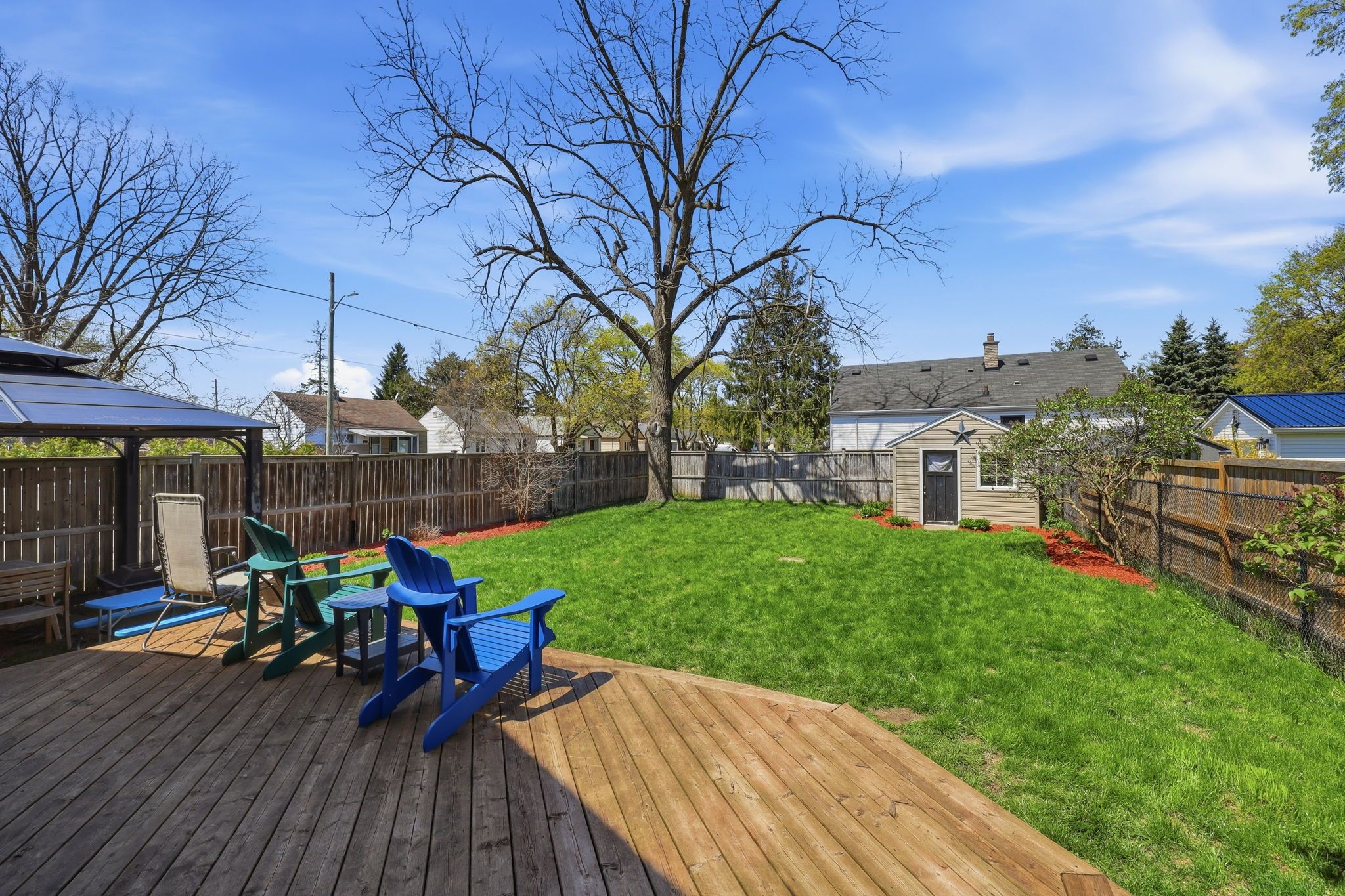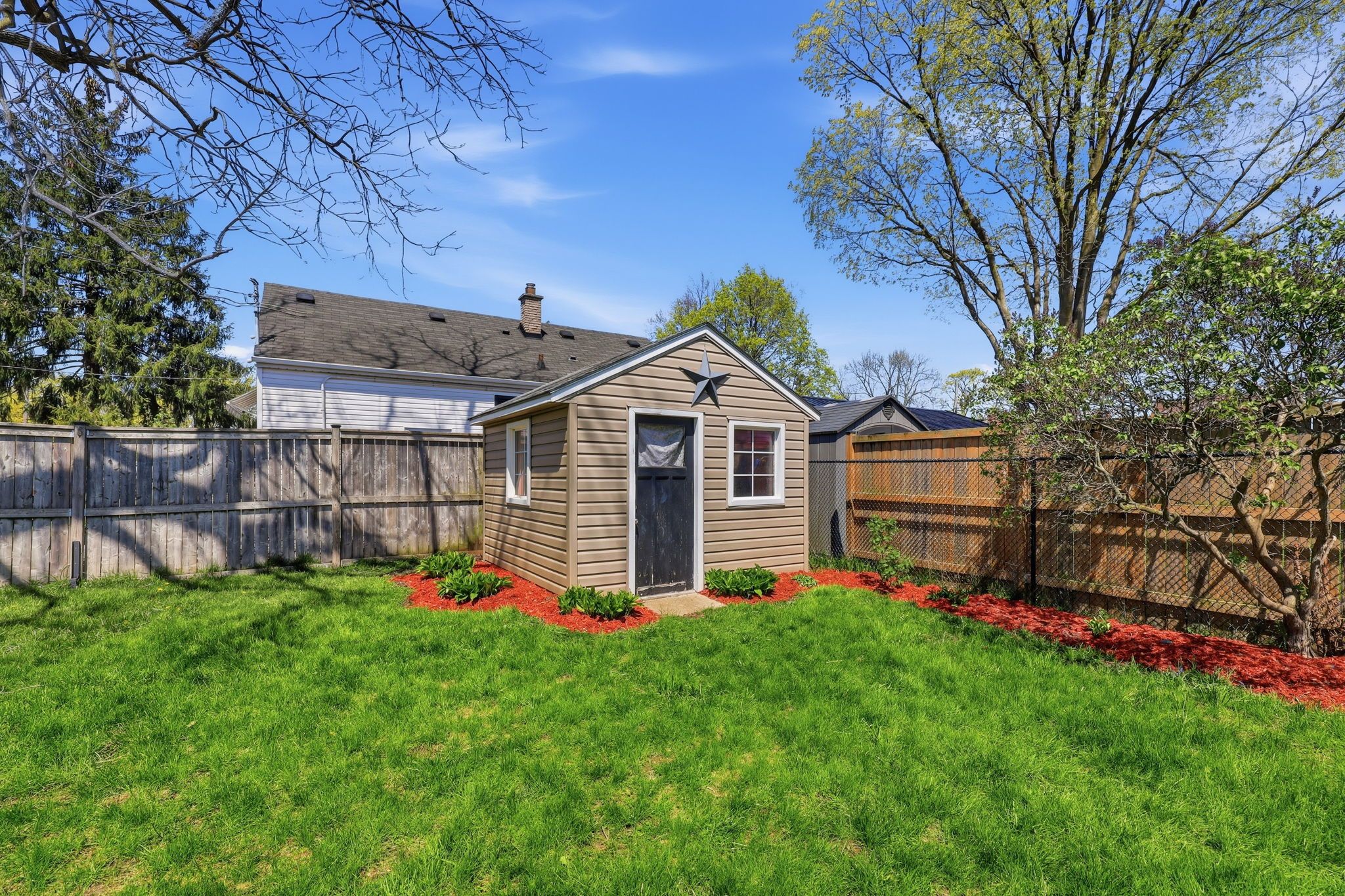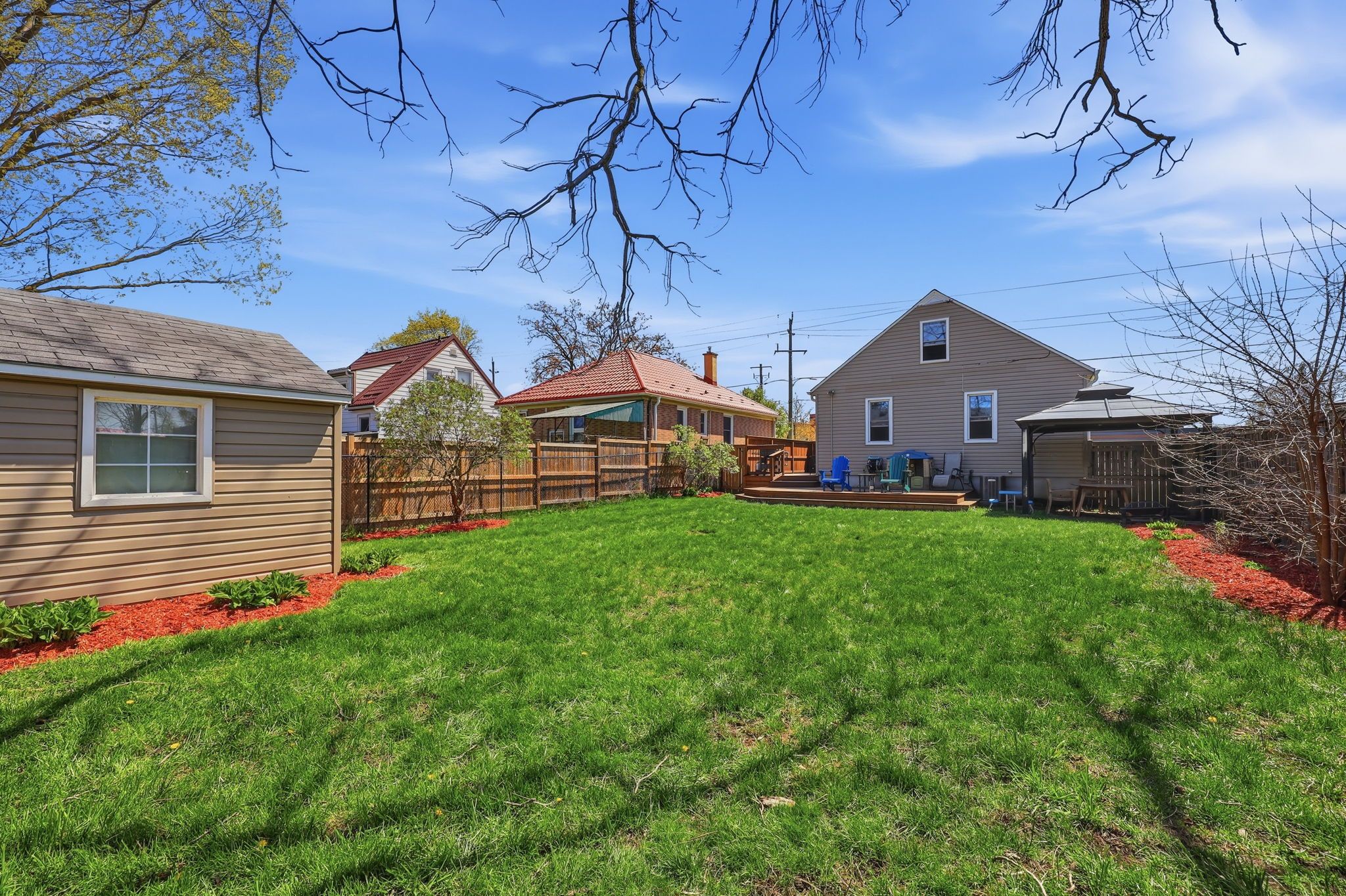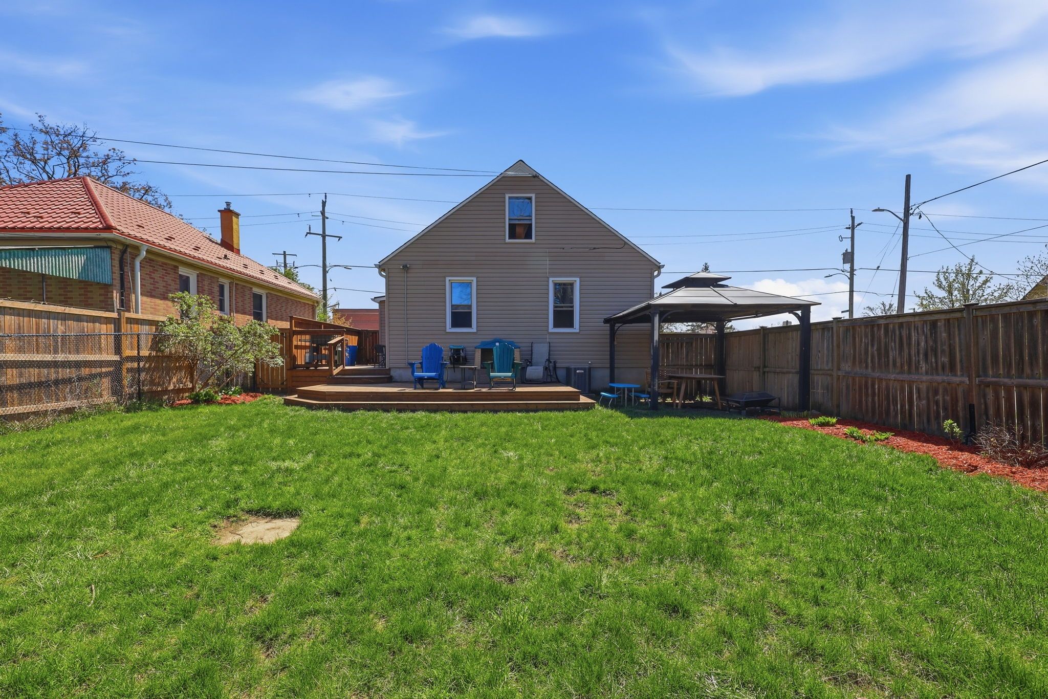 • Fully fenced backyard featuring a patio area for outdoor fun.