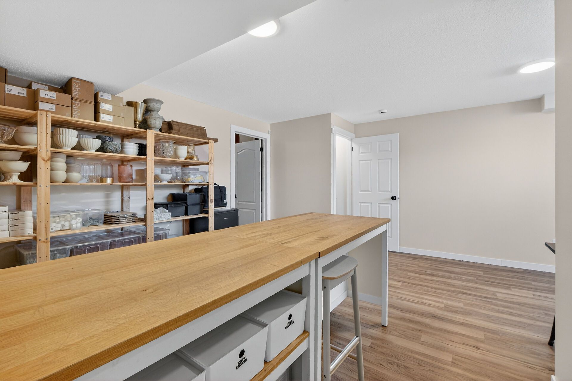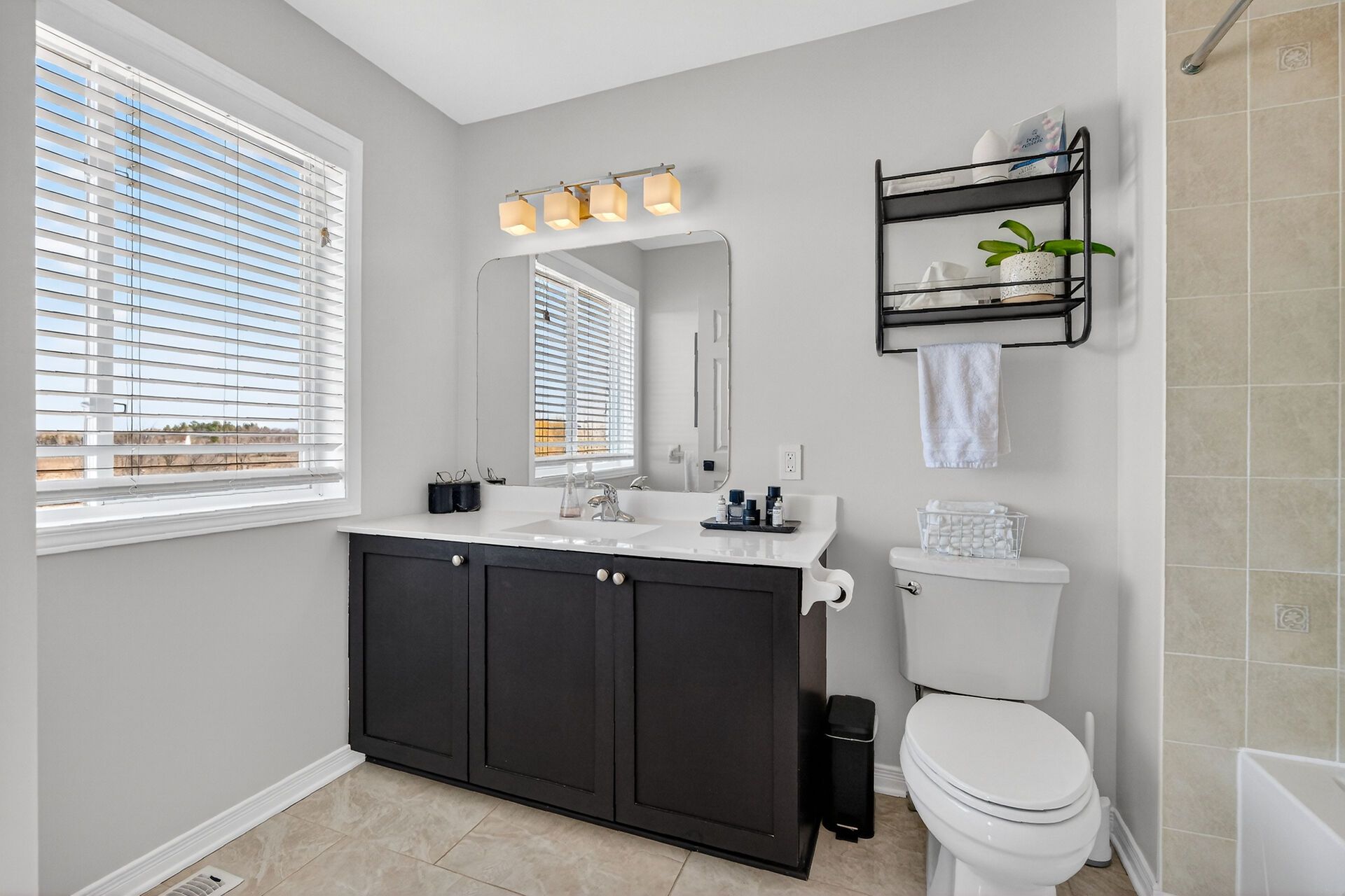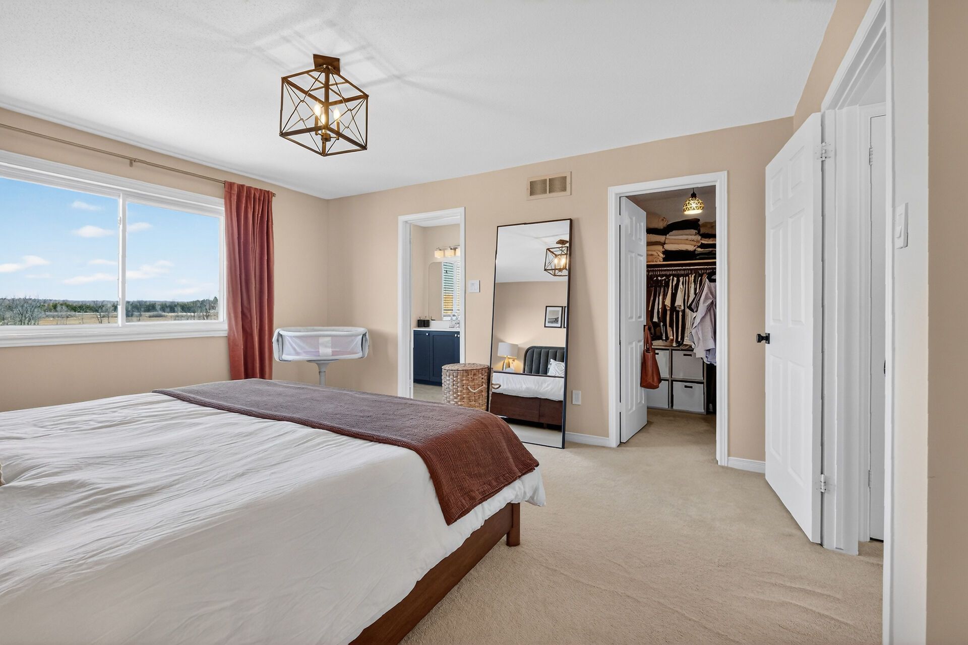 • Natural sunlight floods through large windows, enhancing the bright atmosphere.