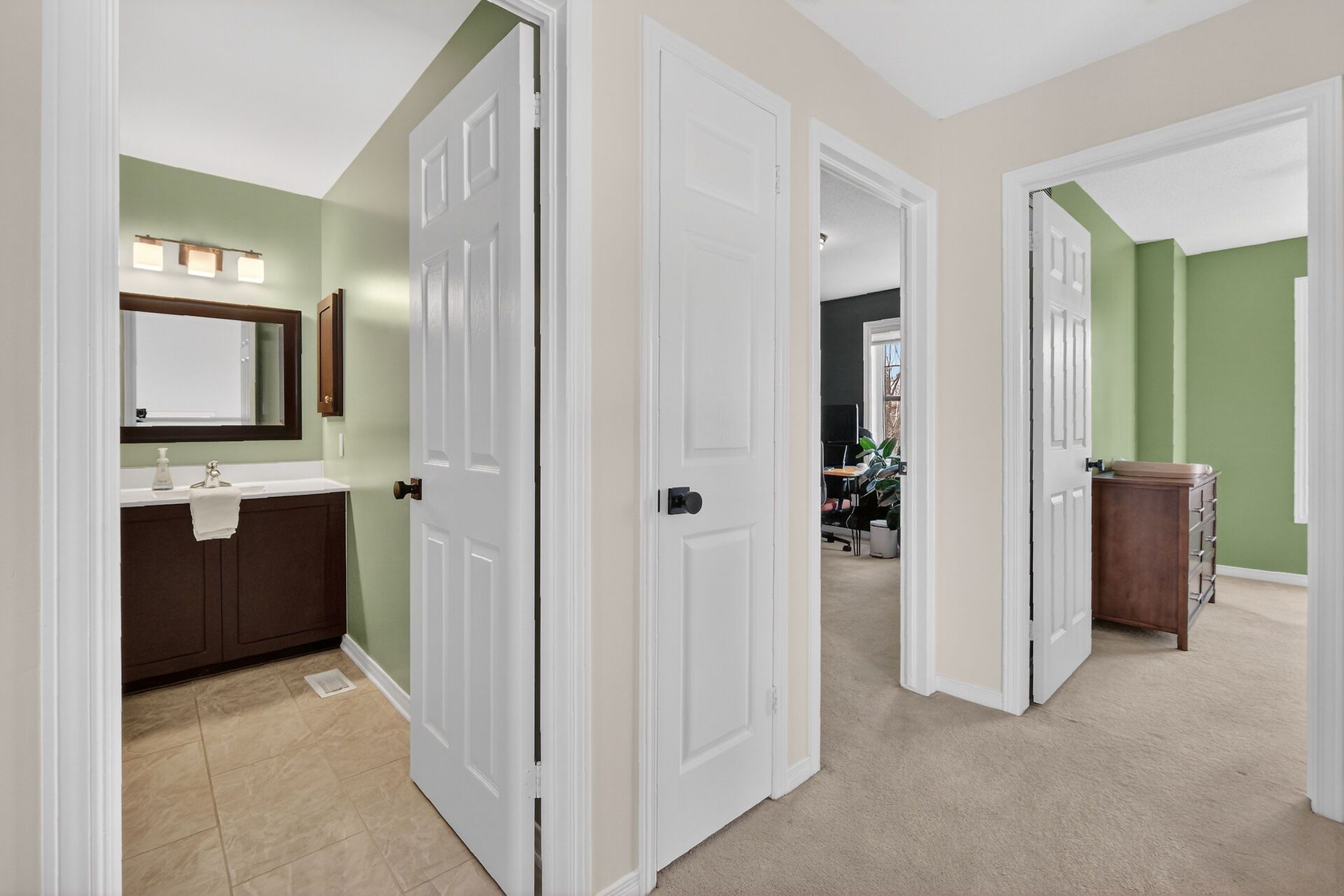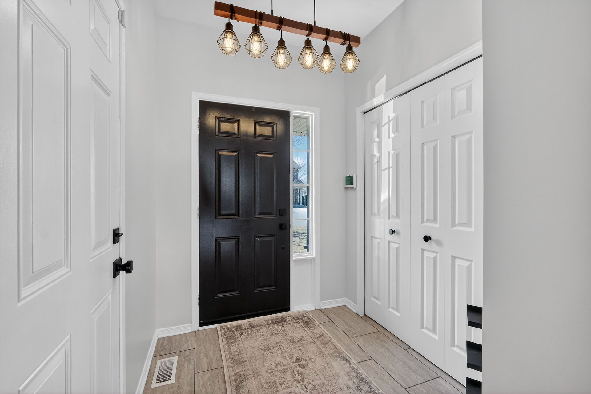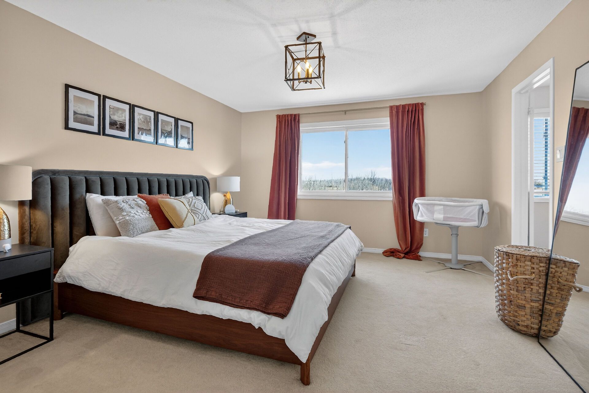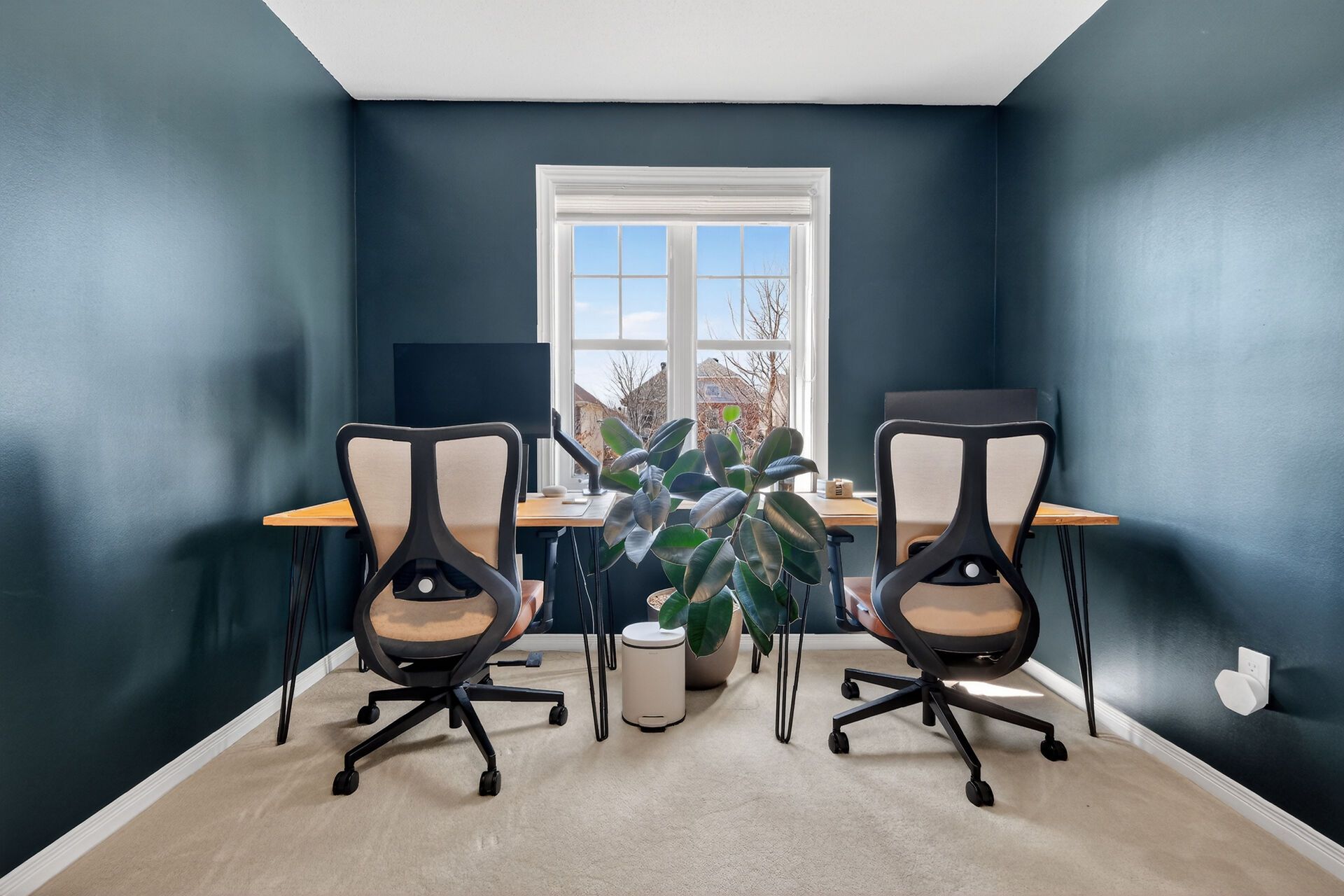 • Natural sunlight floods through large windows, enhancing the bright atmosphere.