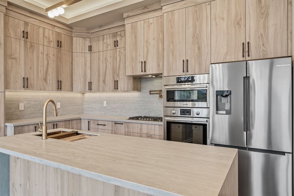 • Modern eat-in kitchen with high-end Bosch appliances and large island.