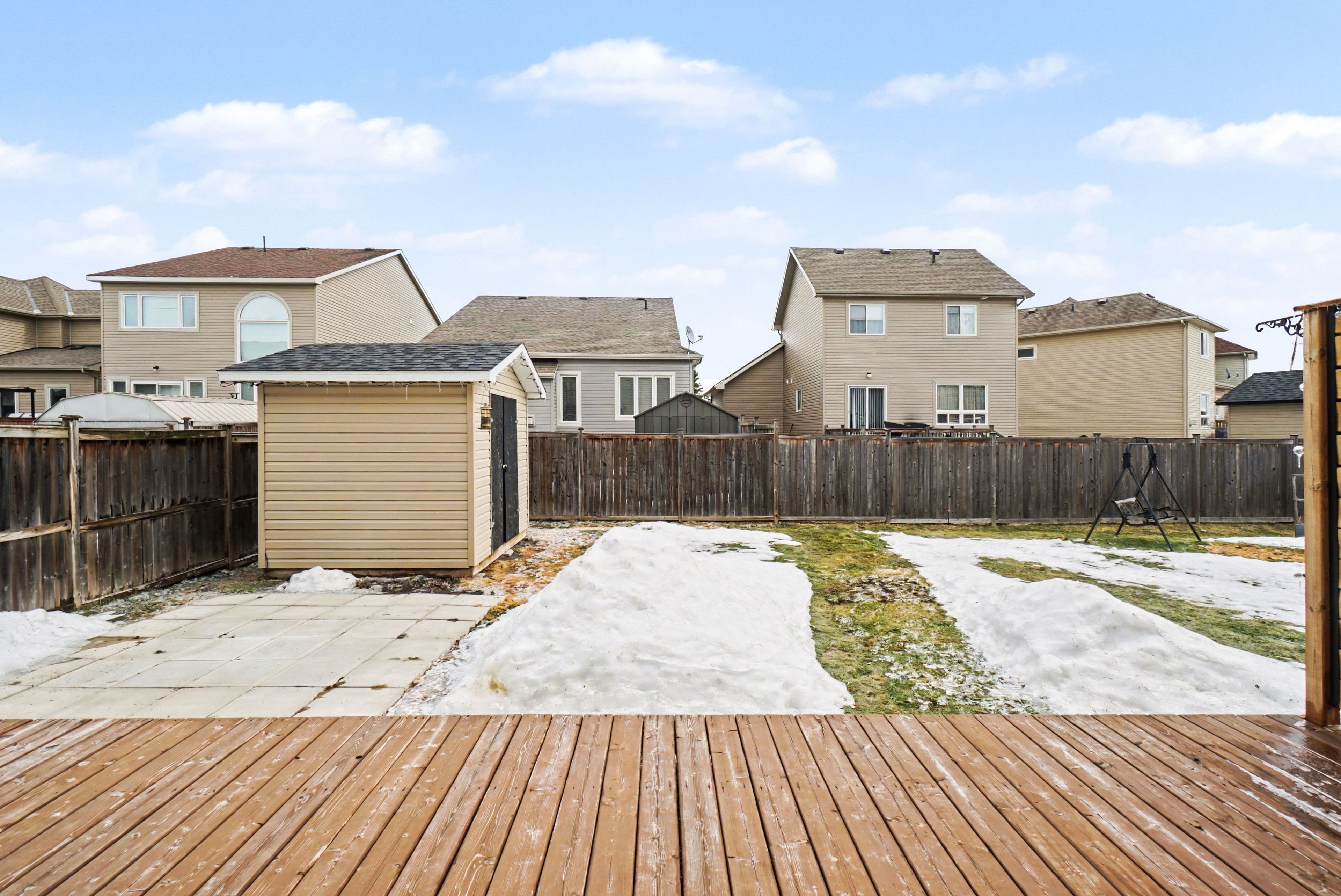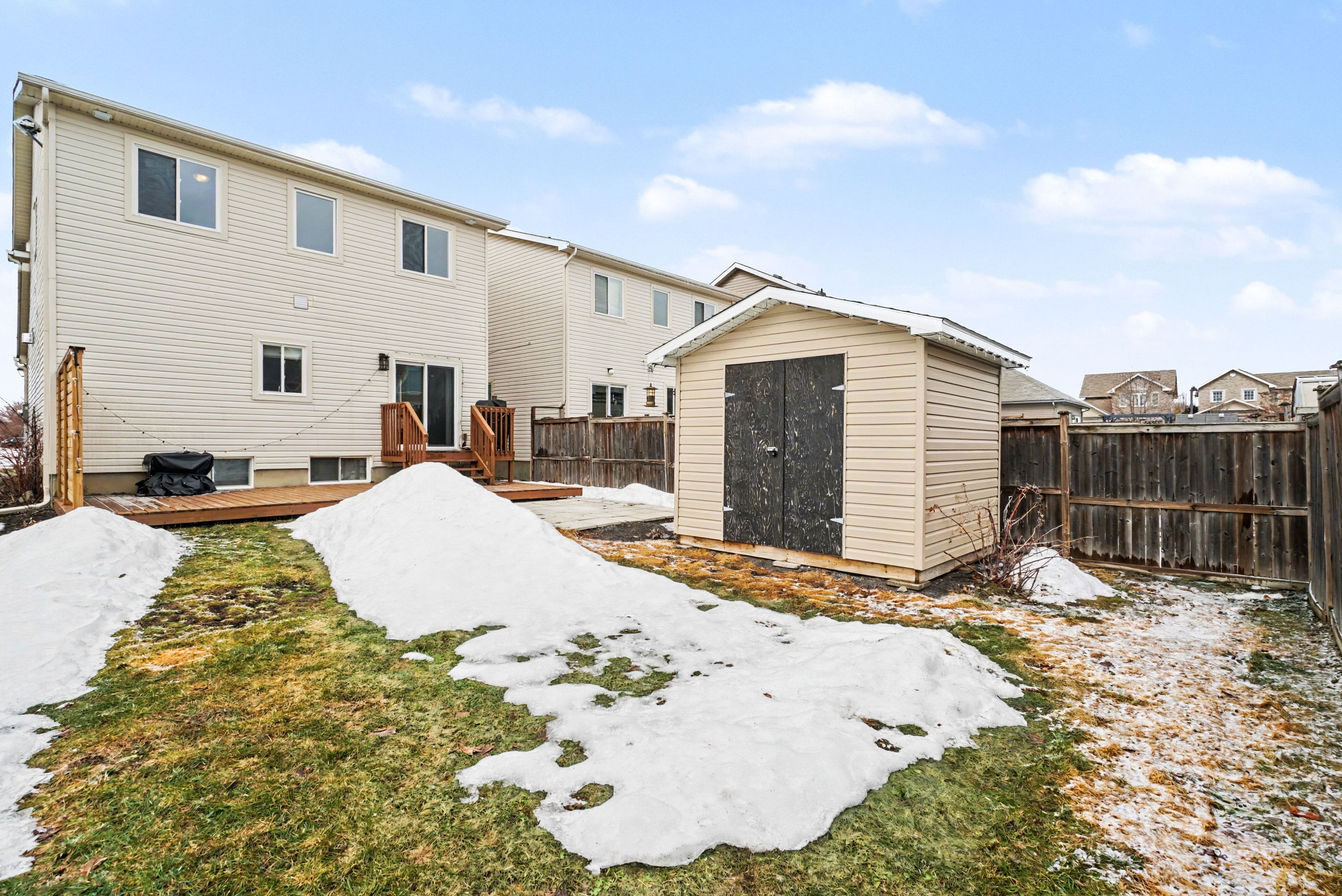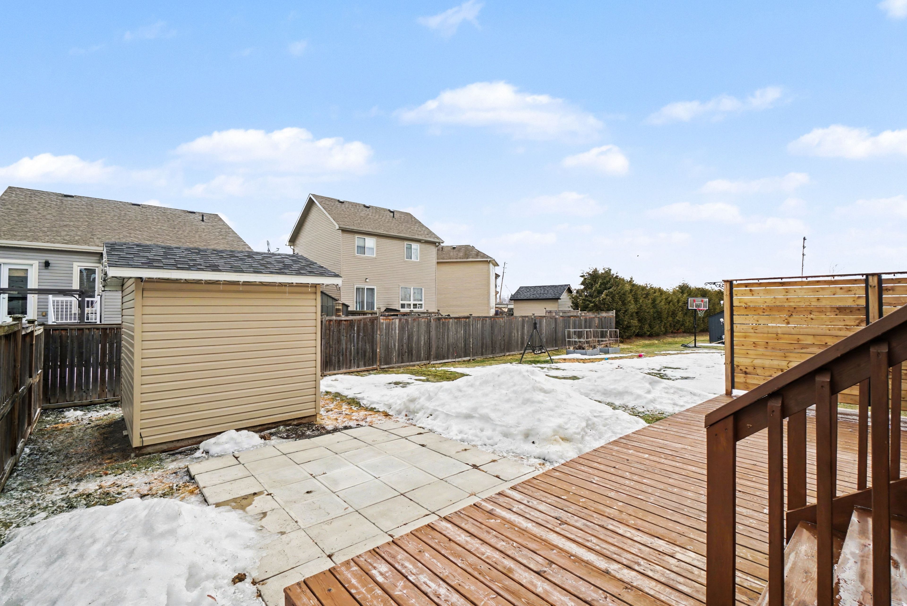 • Large deck overlooks a partially fenced backyard for privacy.