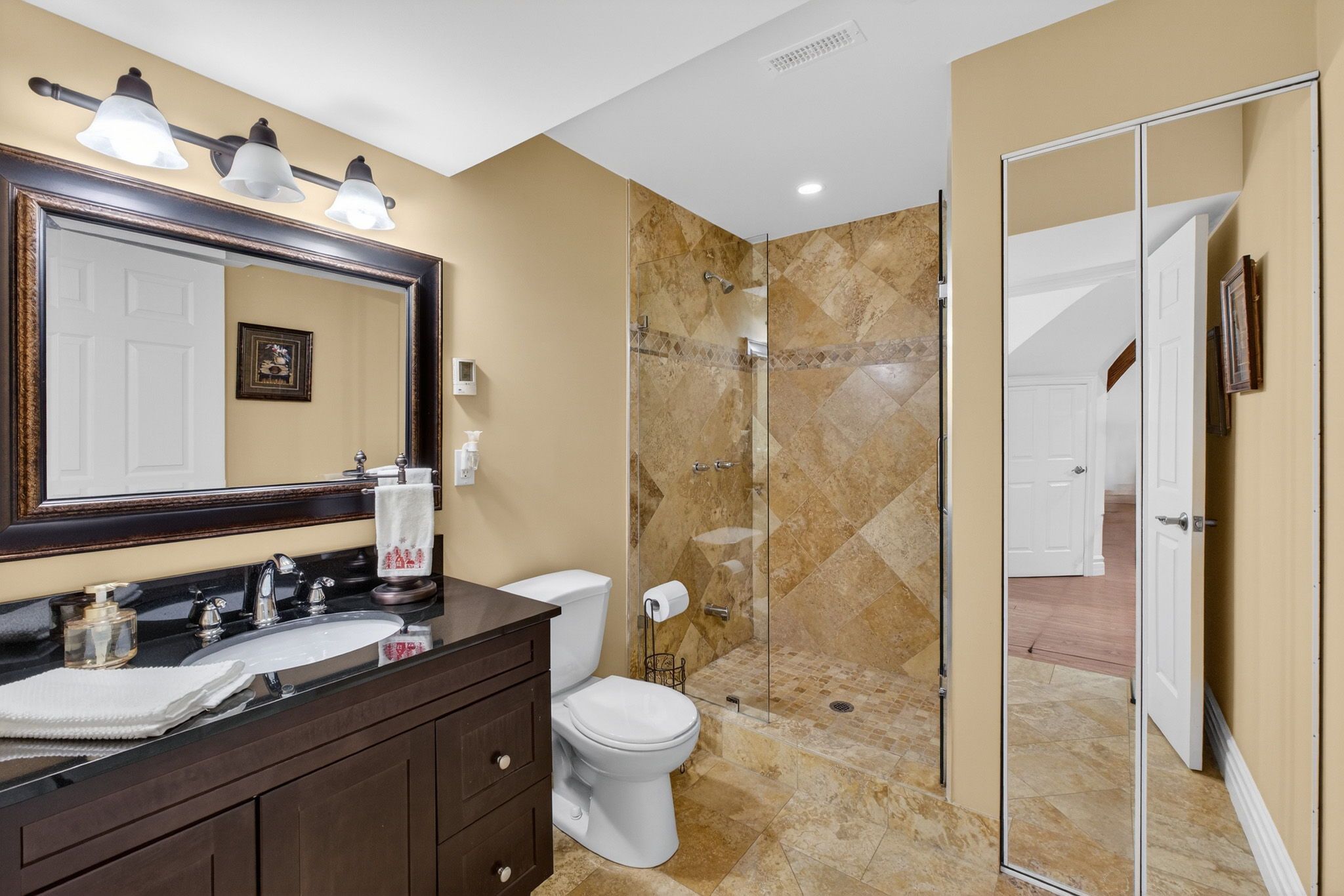 • Rare three-car garage with ample additional parking options.