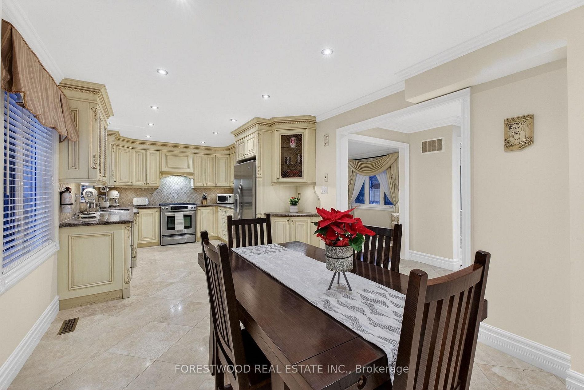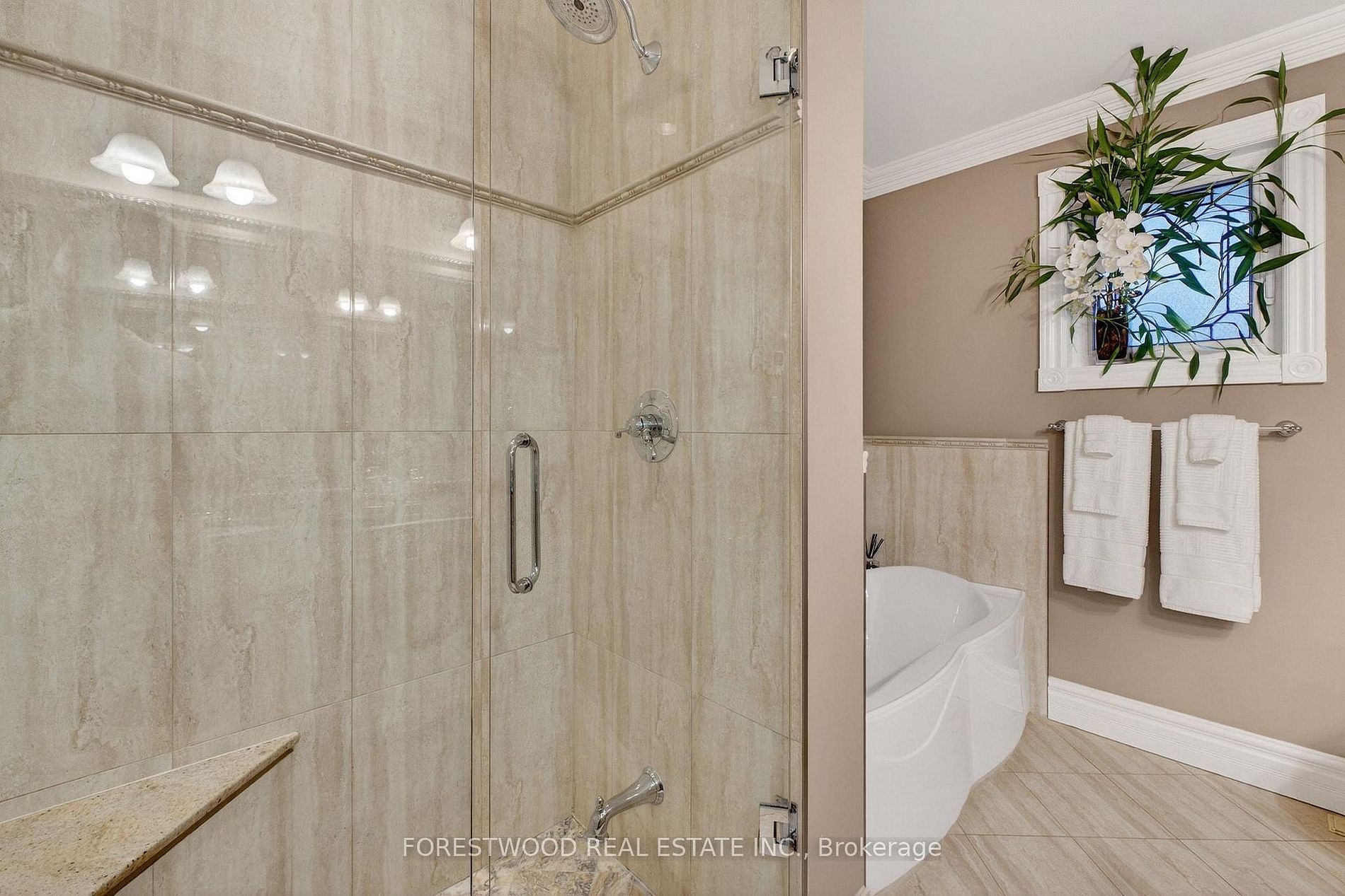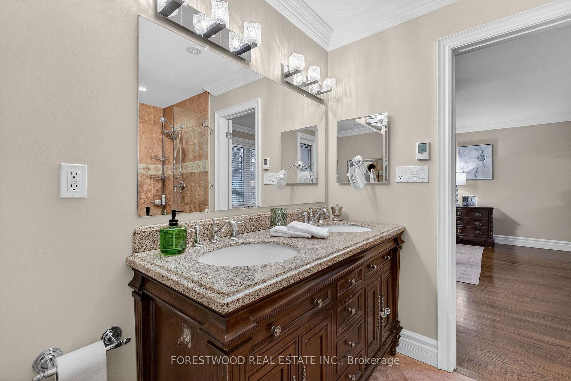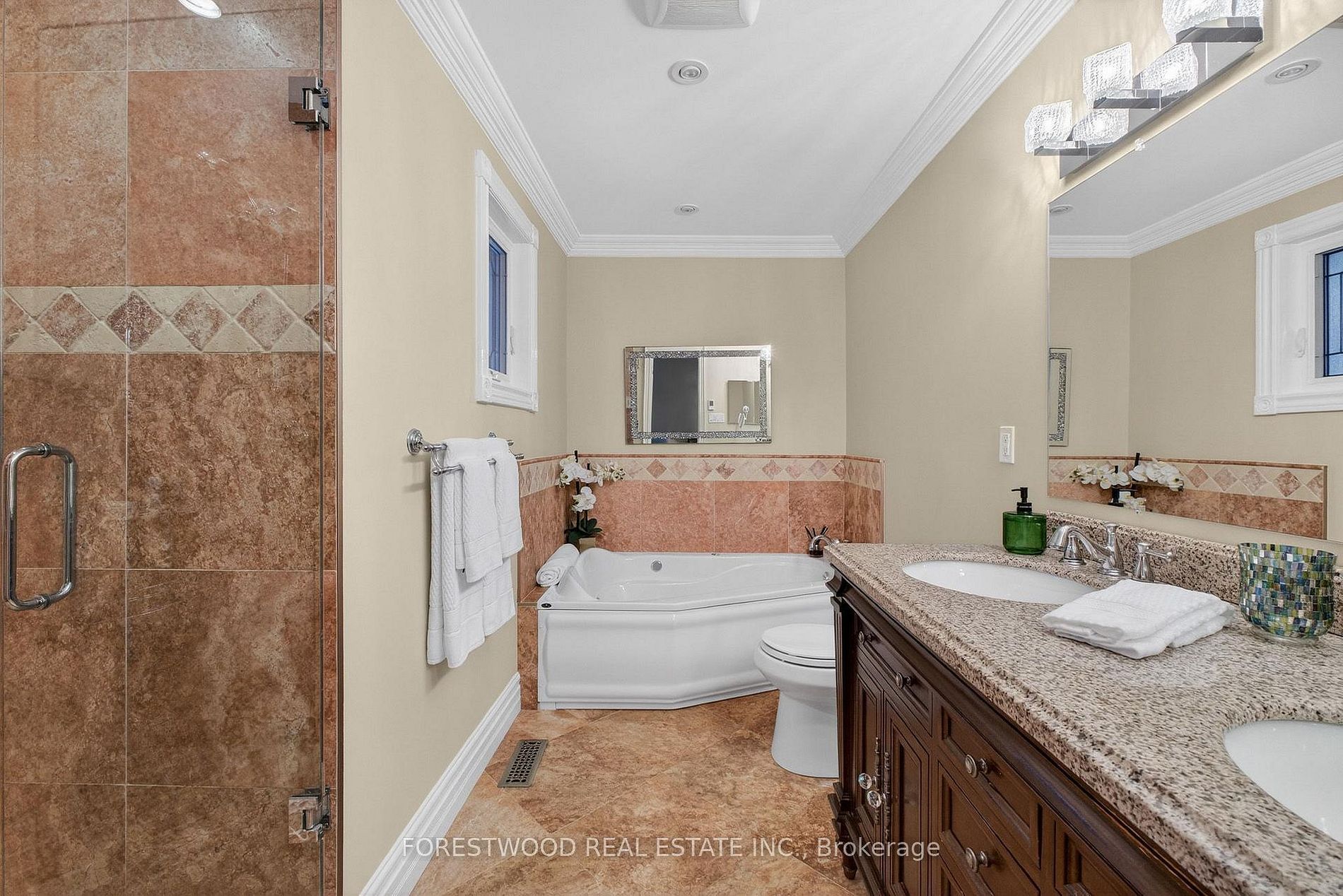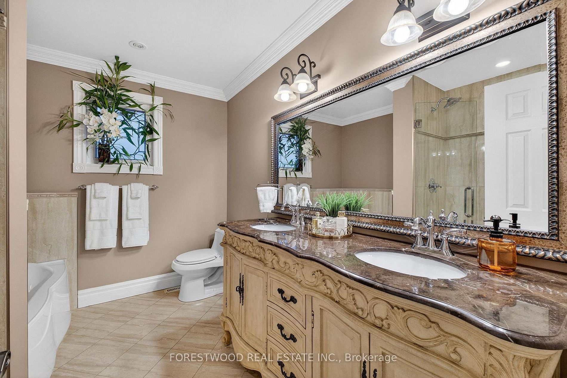 • Heated floors in bathrooms, crown mouldings, and custom kitchen included.