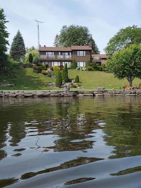 Nestled on one of the most impressive waterfront lots in the l'orignal area, this exceptional property offers over 360 feet of waterfront frontage along the ottawa river. The beautifully landscaped grounds are truly one of a kind, featuring retaining walls, perennial flower gardens, mature trees, and expansive usable waterfront space. Enjoy direct water access with your private boat launch with ramps, as well as hardscaped steps leading into the water where a sandy river floor awaits-perfect for swimming, boating, and making the most of waterfront living. A long driveway leads to a pristine and well-maintained bungalow with walkout basement, complemented by a detached double car garage and a detached workshop, ideal for hobbyists, storage, or additional workspace. The main floor of the home offers a beautifully updated eat-in kitchen with granite countertops, a large island, and ample cabinetry, opening into a generously sized family room designed to take full advantage of the stunning water views. The main level also features a spacious primary bedroom and a full bathroom with ceramic walk-in shower and soaker tub, each boasting large, bright windows that capture breathtaking views of the river and surrounding landscape. The fully finished walkout lower level expands the living space with a large family room, a second bedroom, and a separate private office. French doors lead from the office into a sunroom, creating the perfect space to relax while enjoying the peaceful waterfront setting year-round. In addition to the ground level exterior sitting area, this home offers two composite balcony with glass railings. Energy efficient home heated and cooled by a heat pump and a wood pellet stove for additional comfort. A rare opportunity to own an extraordinary waterfront property combining privacy, natural beauty, and thoughtfully designed outdoor living spaces-all just minutes from the village of l'orignal and a short drive to hawkesbury.