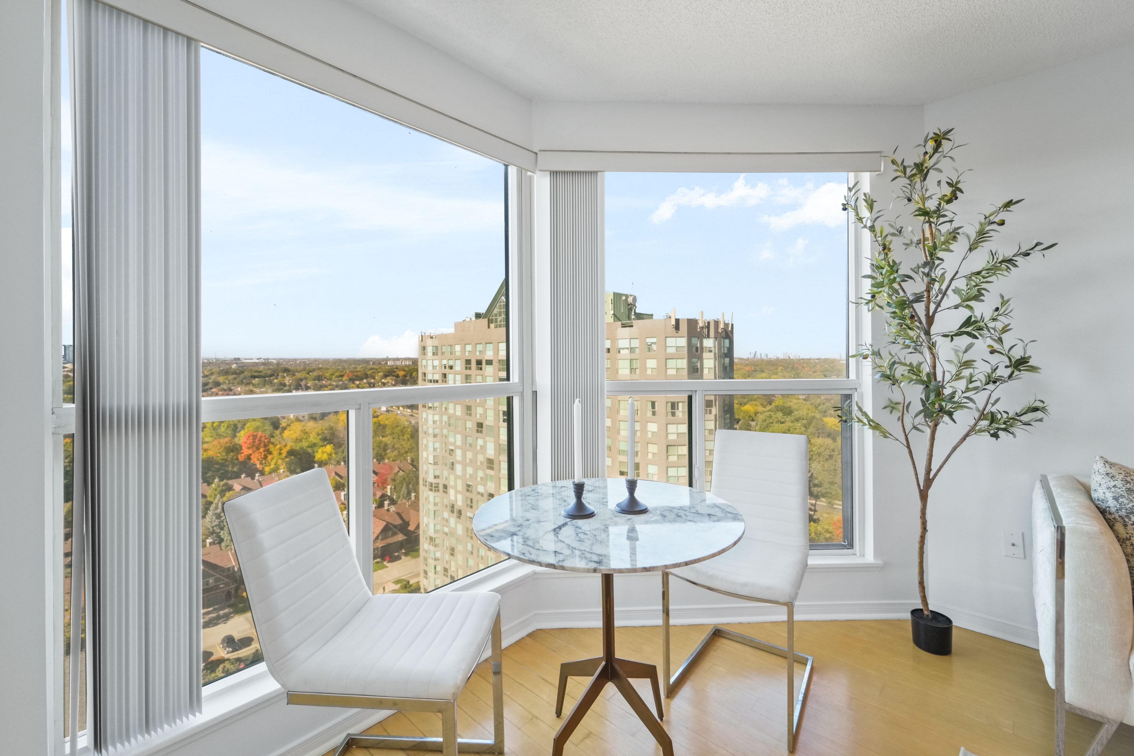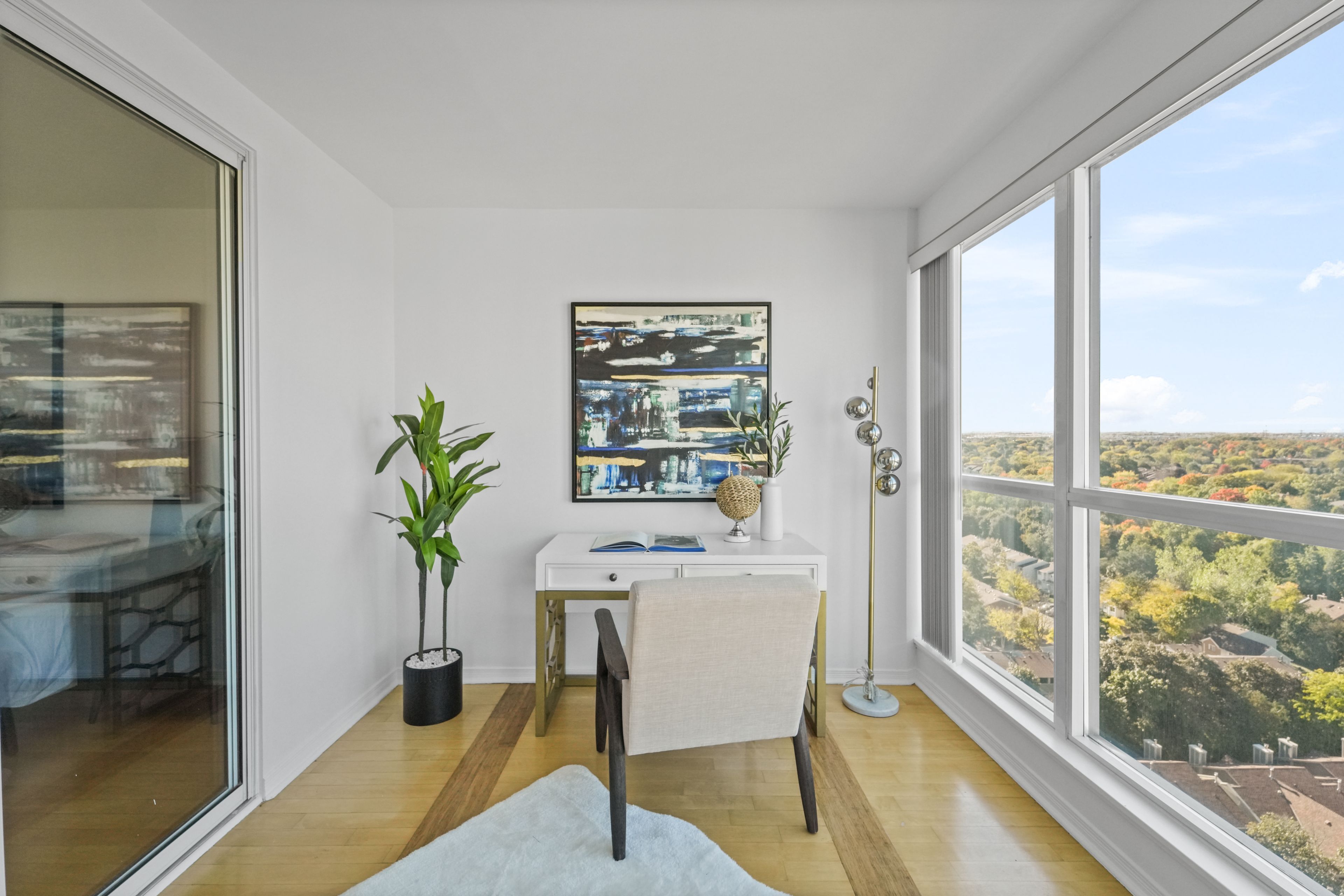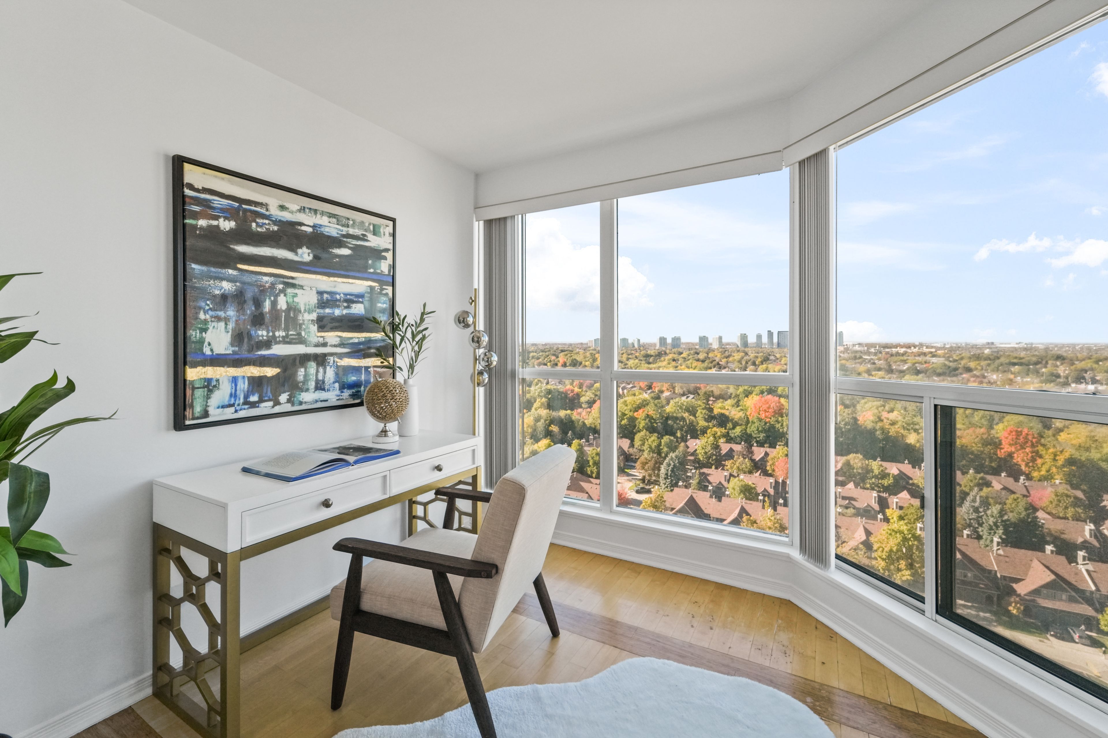 Experience elevated living in this stunning penthouse suite nestled in the desirable erin mills community. With 670 square feet of thoughtfully designed living space, this residence features a large bedroom, a versatile den perfect as an office or nursery, and an open-concept layout framed with expansive windows that showcase breathtaking views. The lovely kitchen overlooking the living area features a stone backsplash, a breakfast bar, and stainless steel appliances, while hardwood floors flow seamlessly throughout. Enjoy the convenience of two underground parking spots and a spacious walk-in locker right by the elevator! The all-inclusive maintenance fee covers all utilities, rogers cable tv, and internet, providing comfort and peace of mind. The privately gated building features 24/7 live security and offers resort-style amenities. These include a clubhouse with an indoor pool, a fully equipped gym with sought-after equipment, a sauna, a party room, a squash court, billiards, ample visitor parking, and beautifully landscaped grounds that create the feel of your own community. Located in one of mississauga's most sought-after neighbourhoods, you'll be steps from erin mills town centre, top-rated schools, restaurants, grocery stores, parks, and community trails. With quick access to highways 403, 407, and the qew, you can be in downtown toronto in no time-perfect for an evening out with loved ones. This penthouse combines style, comfort, and convenience in an unbeatable location.