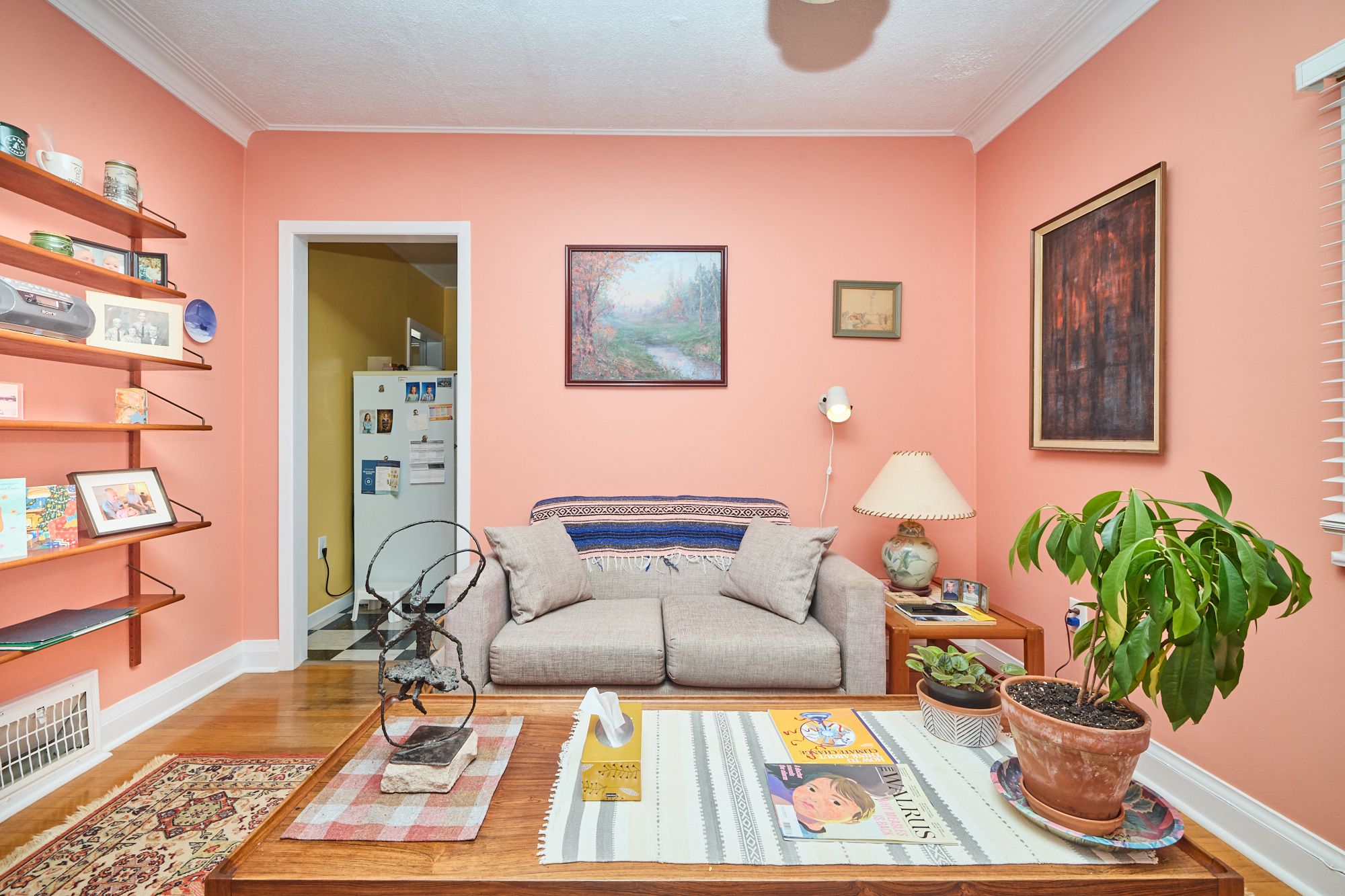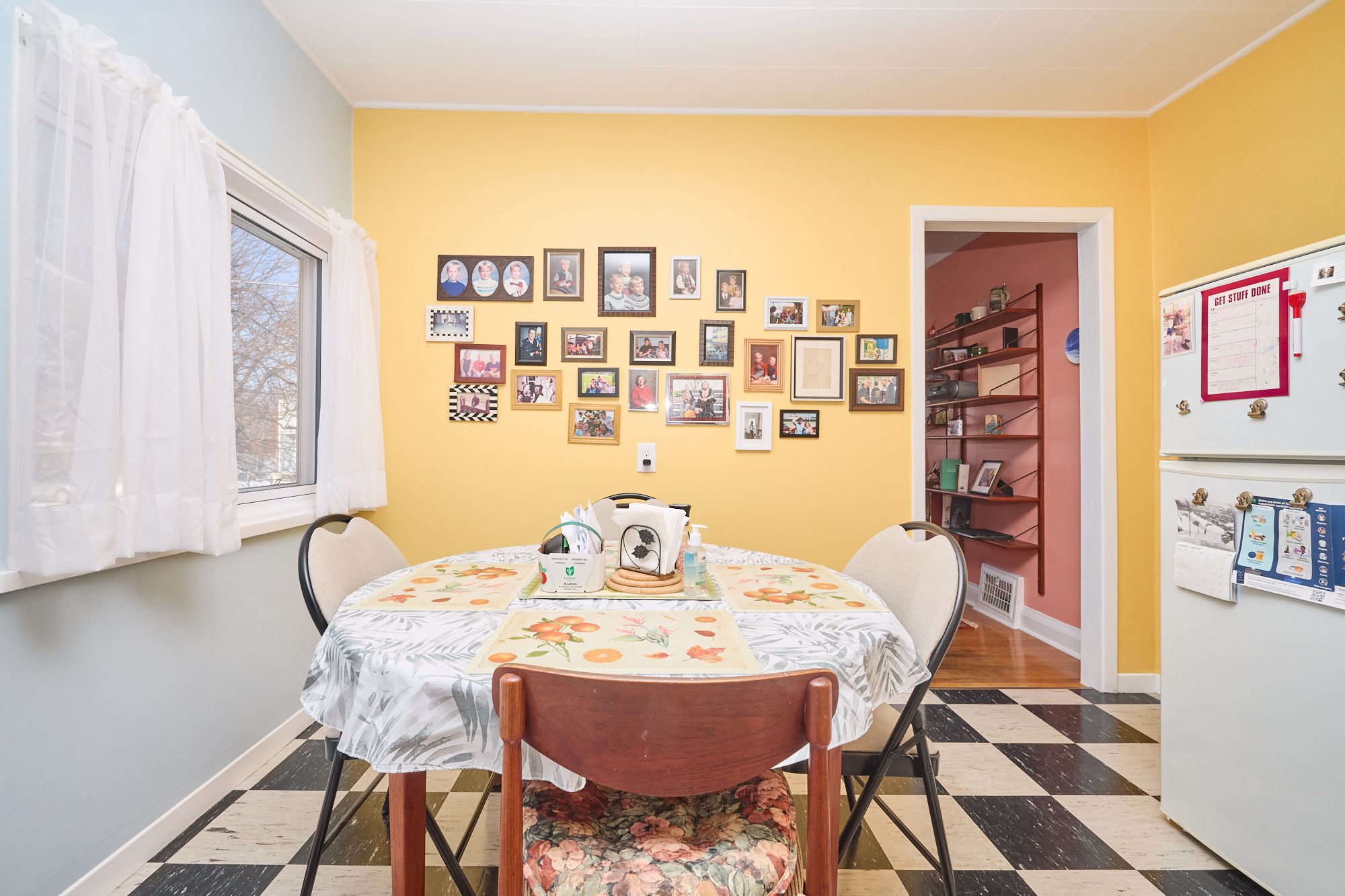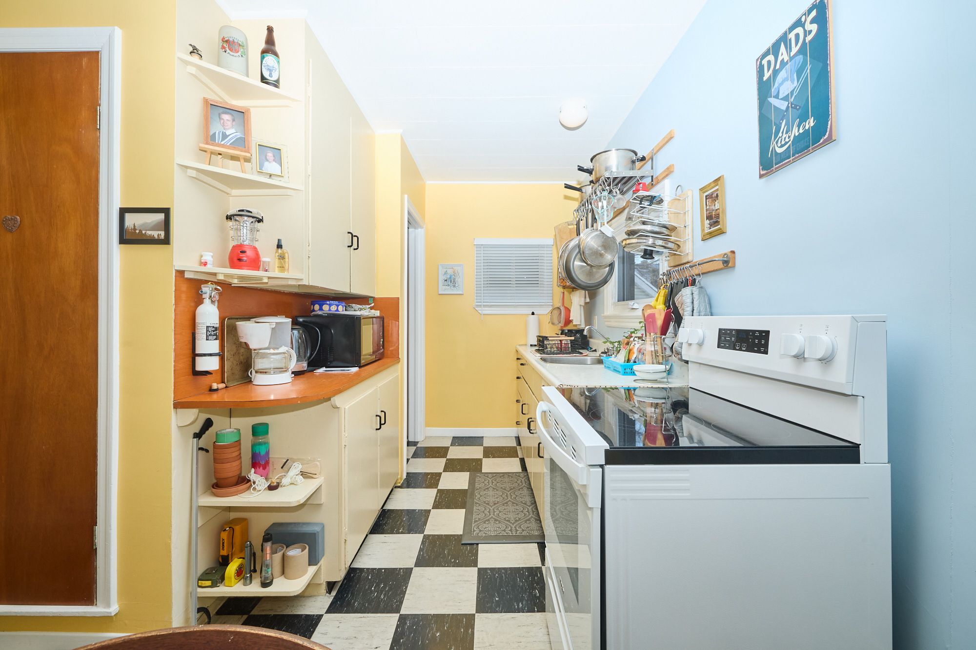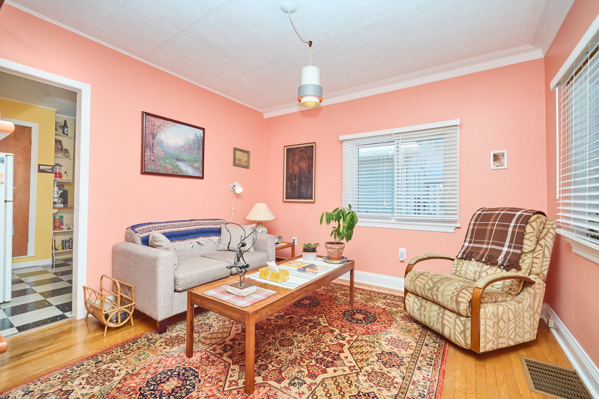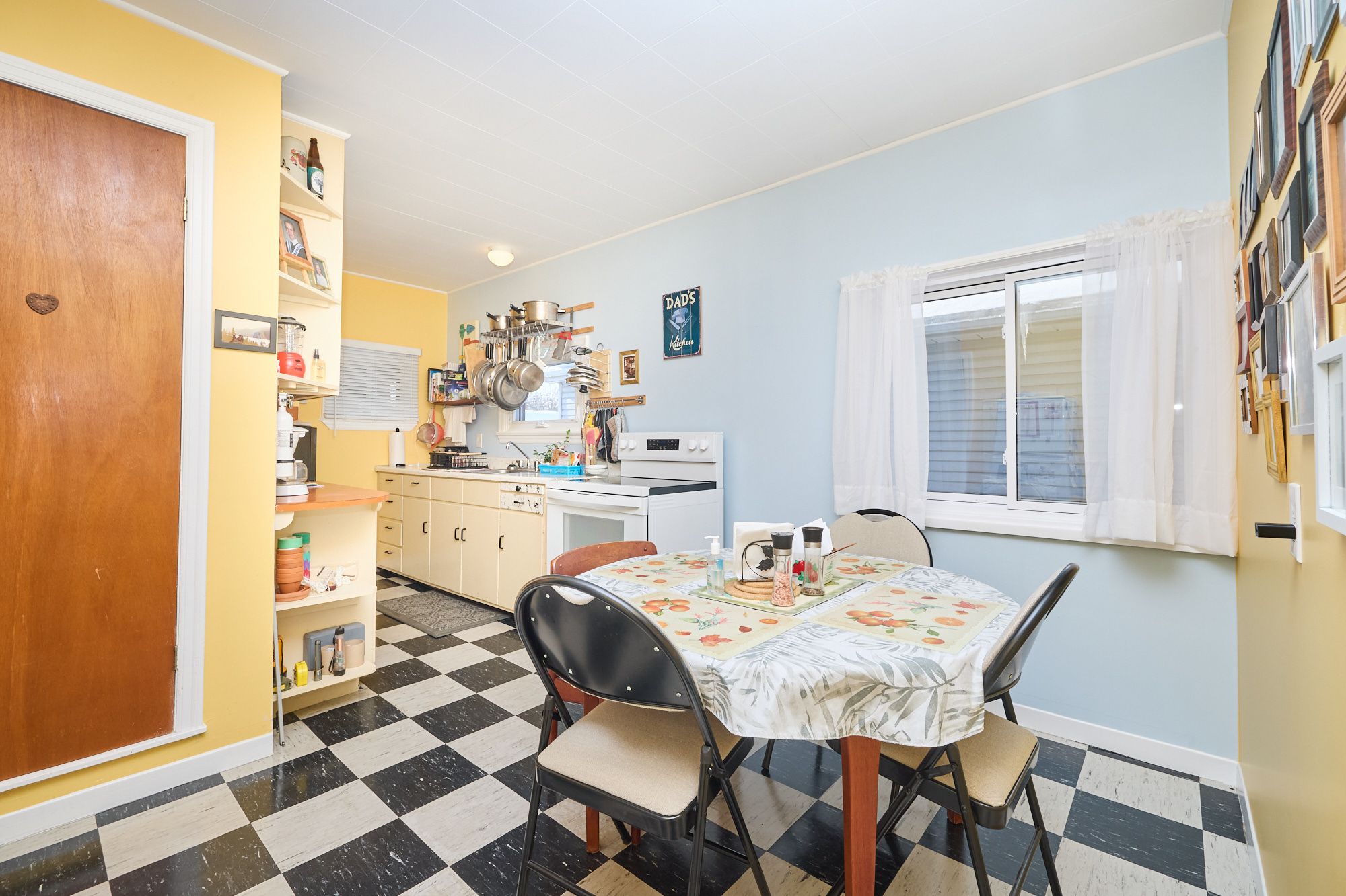 • Bright living room and galley kitchen with attached dinette.