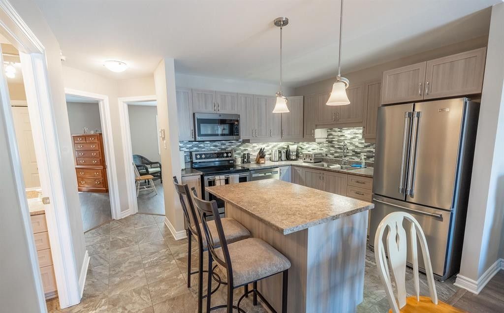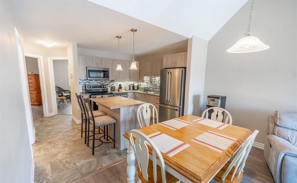 Beautiful turn key condo on second level with balcony. Open concept with cathedral ceilings, kitchen with island, 2 bedrooms, in unit laundry and balcony to sit out and relax. Primarily seniors in adjoining condos for a quiet place to call home. Perfect for senior or professional. Option to have utilities included for an additional fee. One parking spot with this unit. Must comply with condo rules.