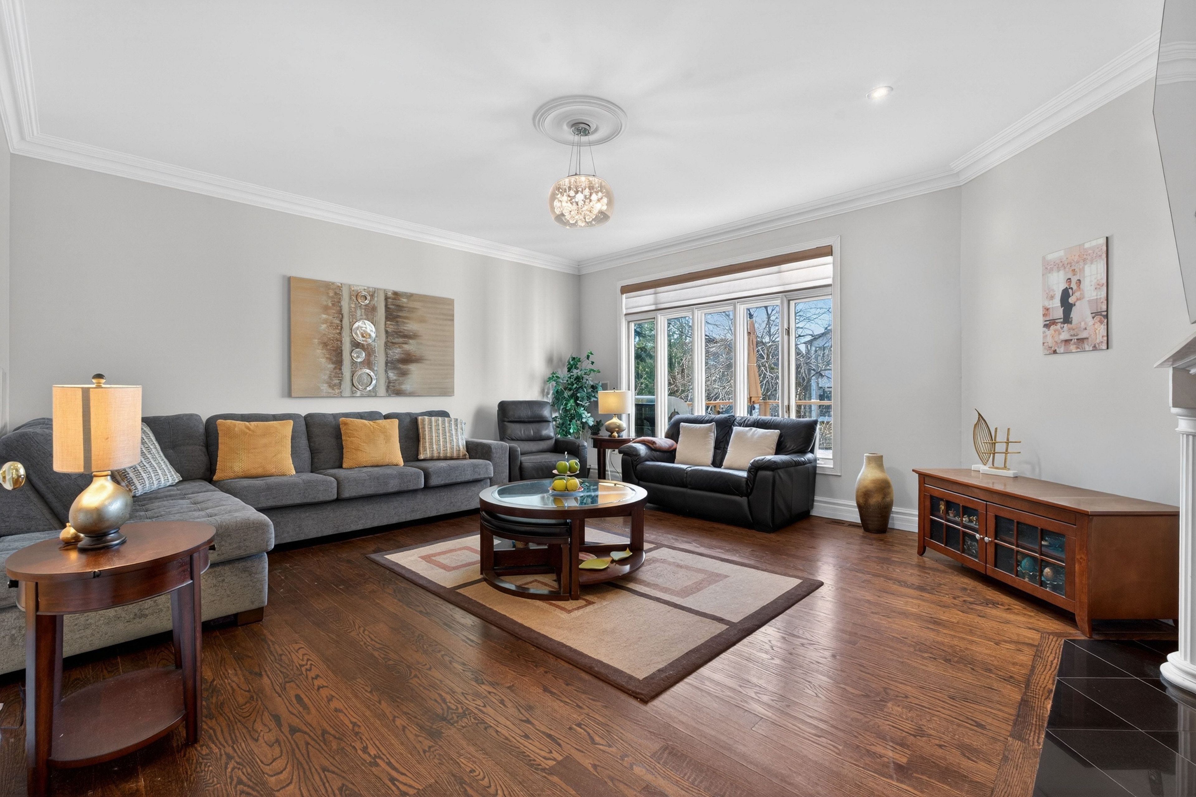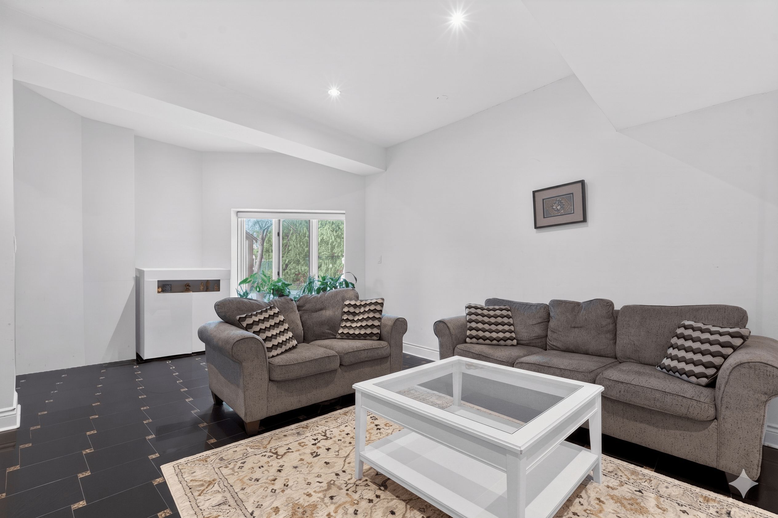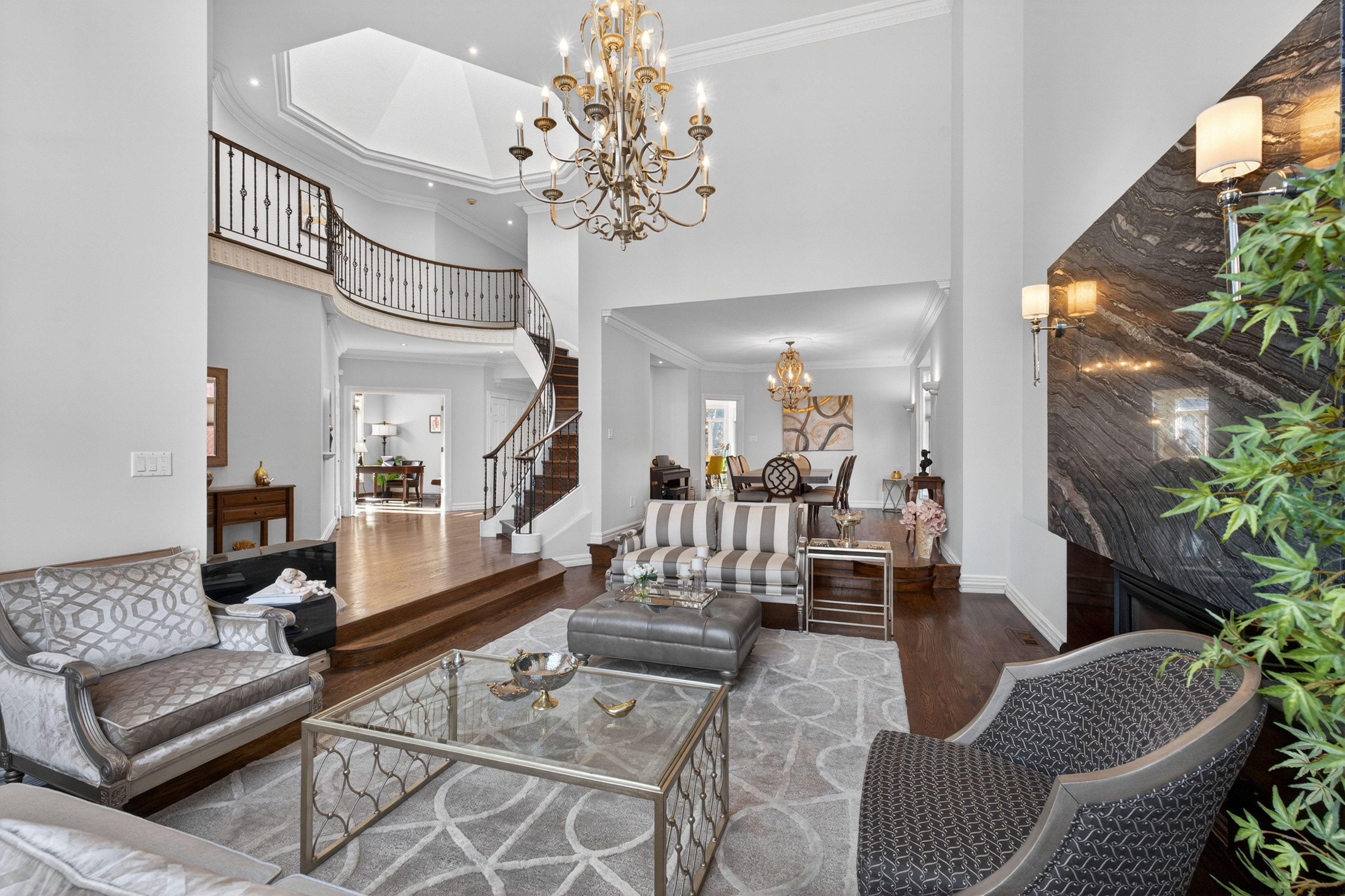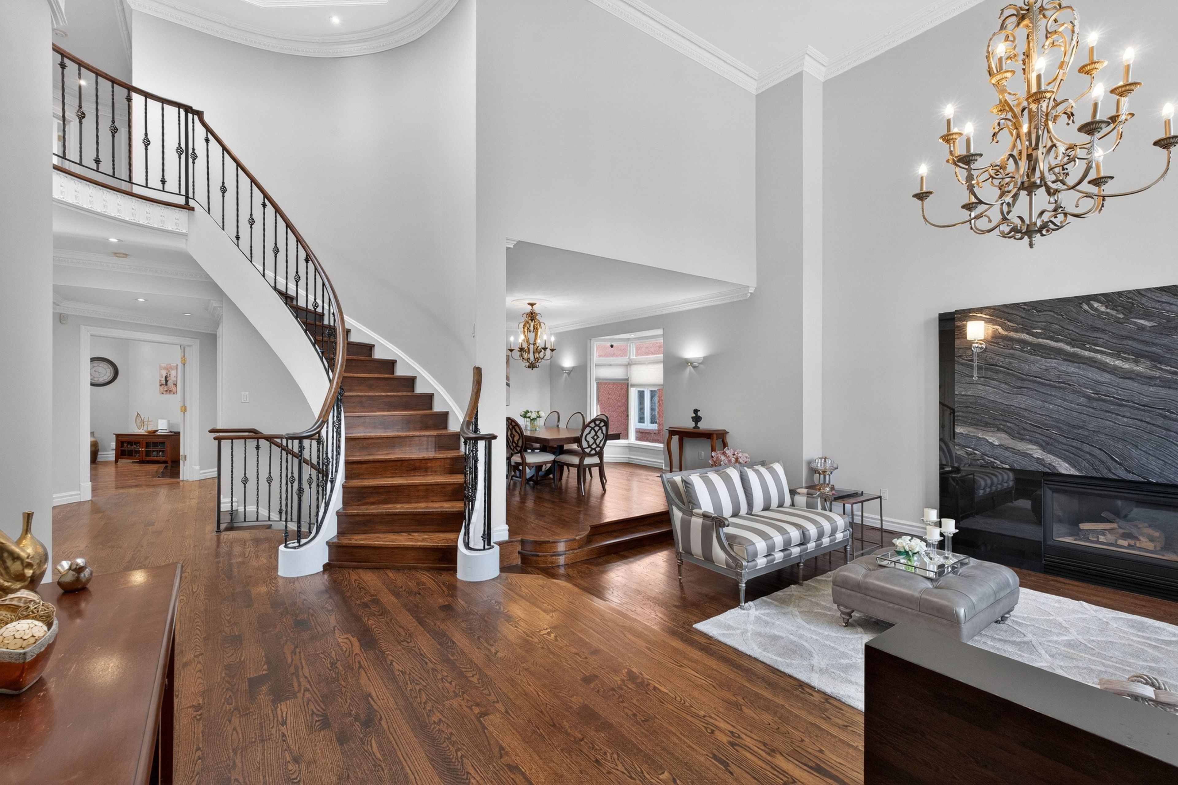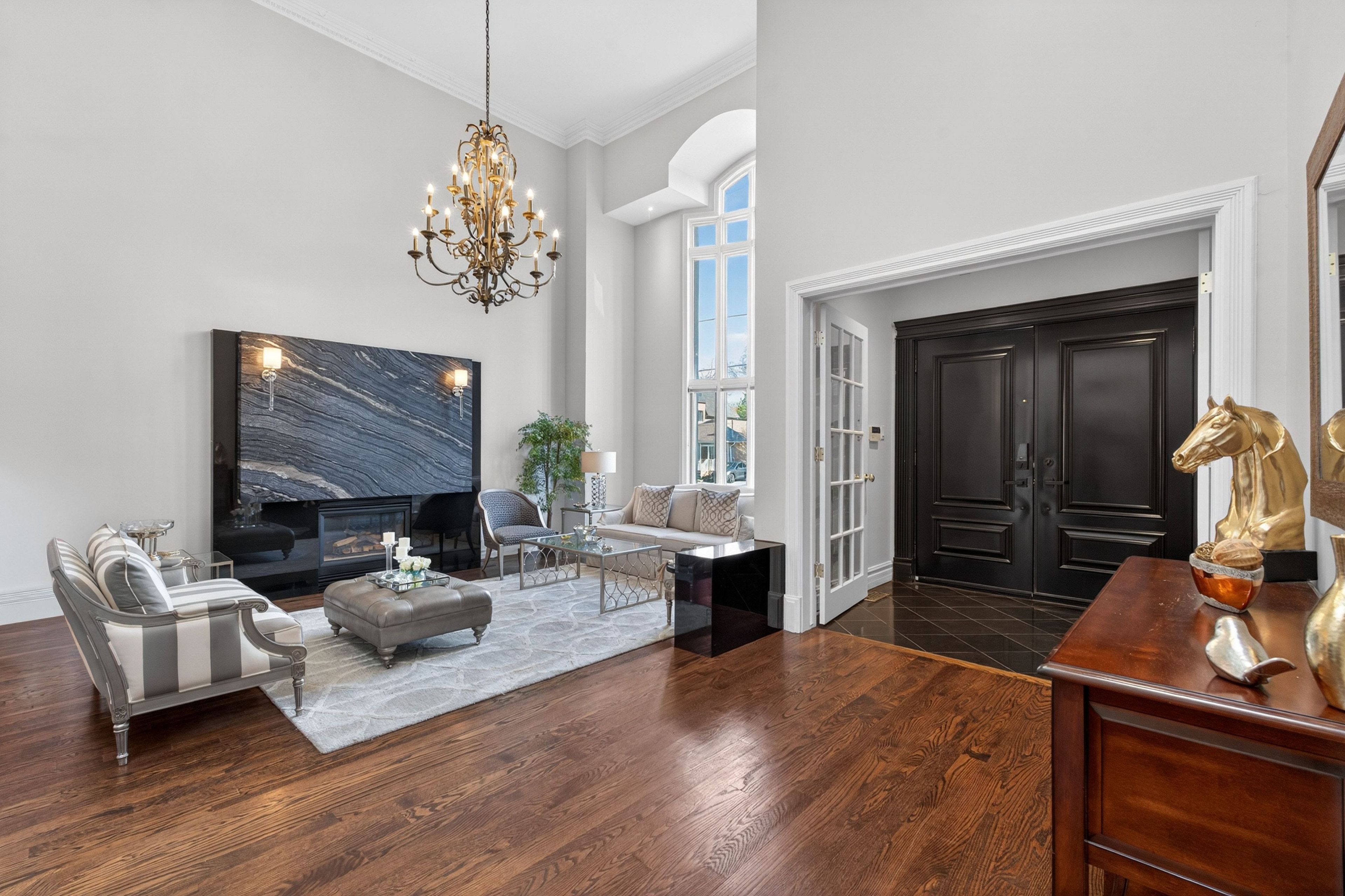 • Elegant living room with designer gas fireplace and high ceilings.