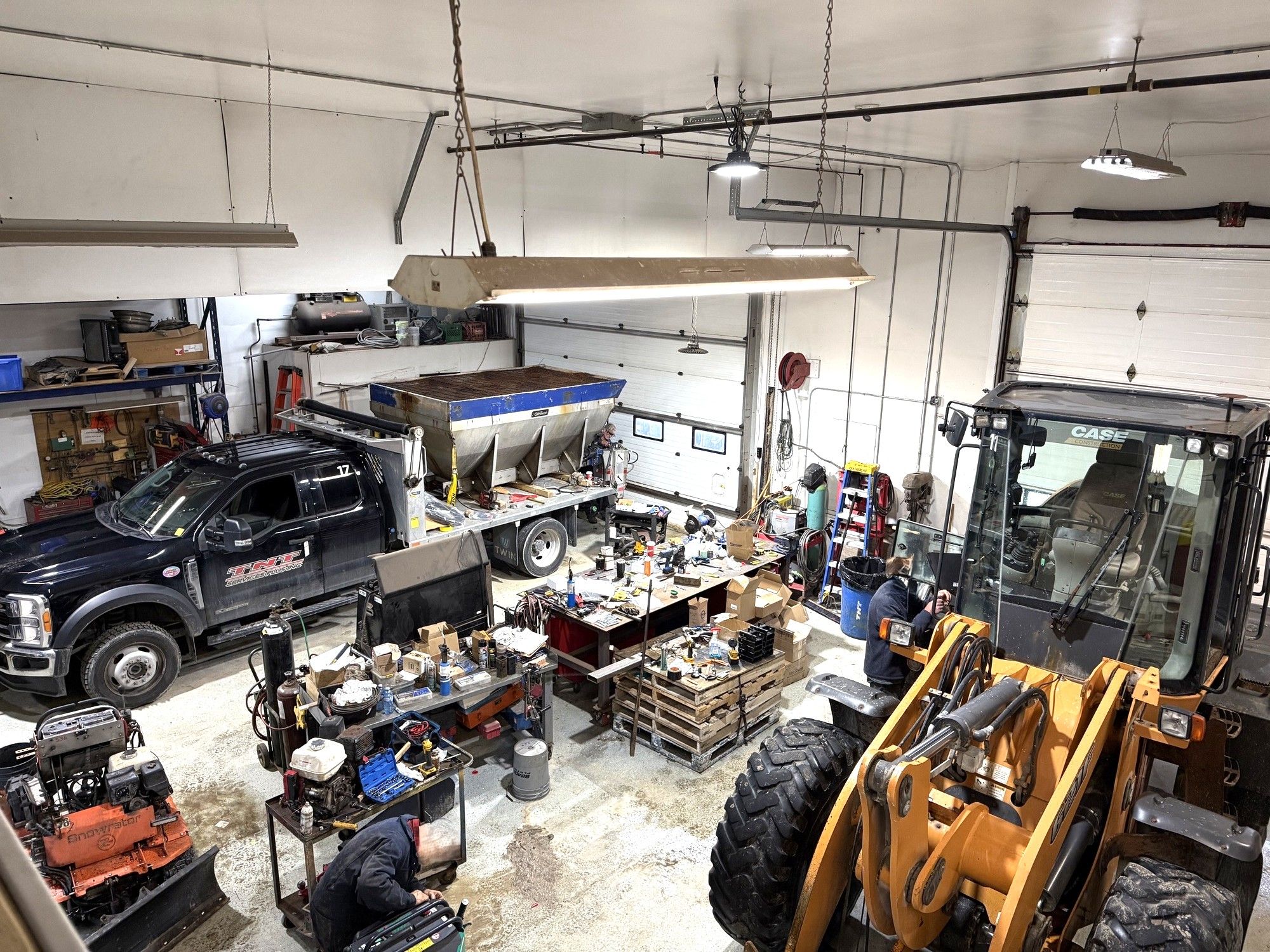 • Shop includes two bays with multiple roll-up doors and high ceilings.