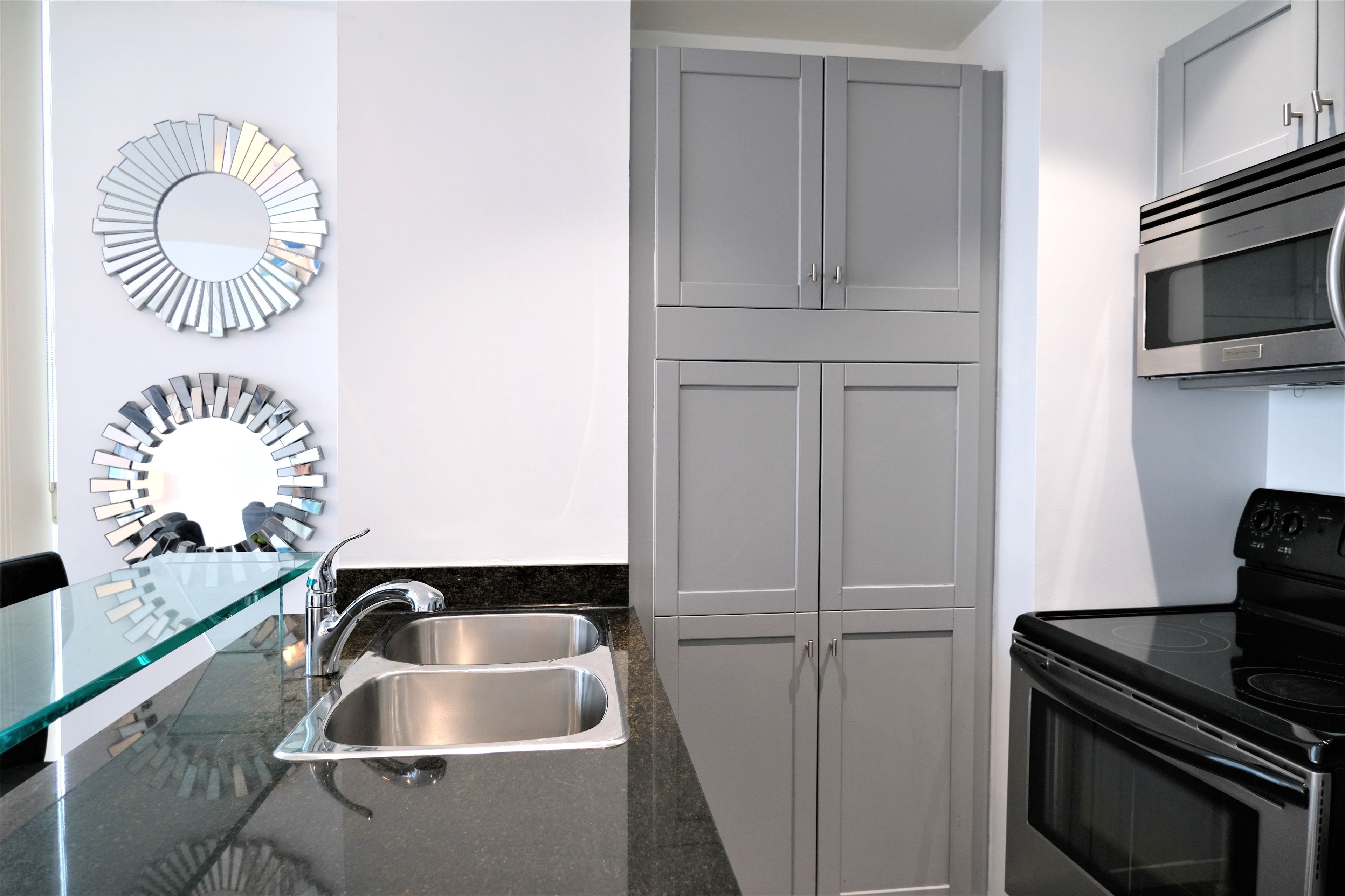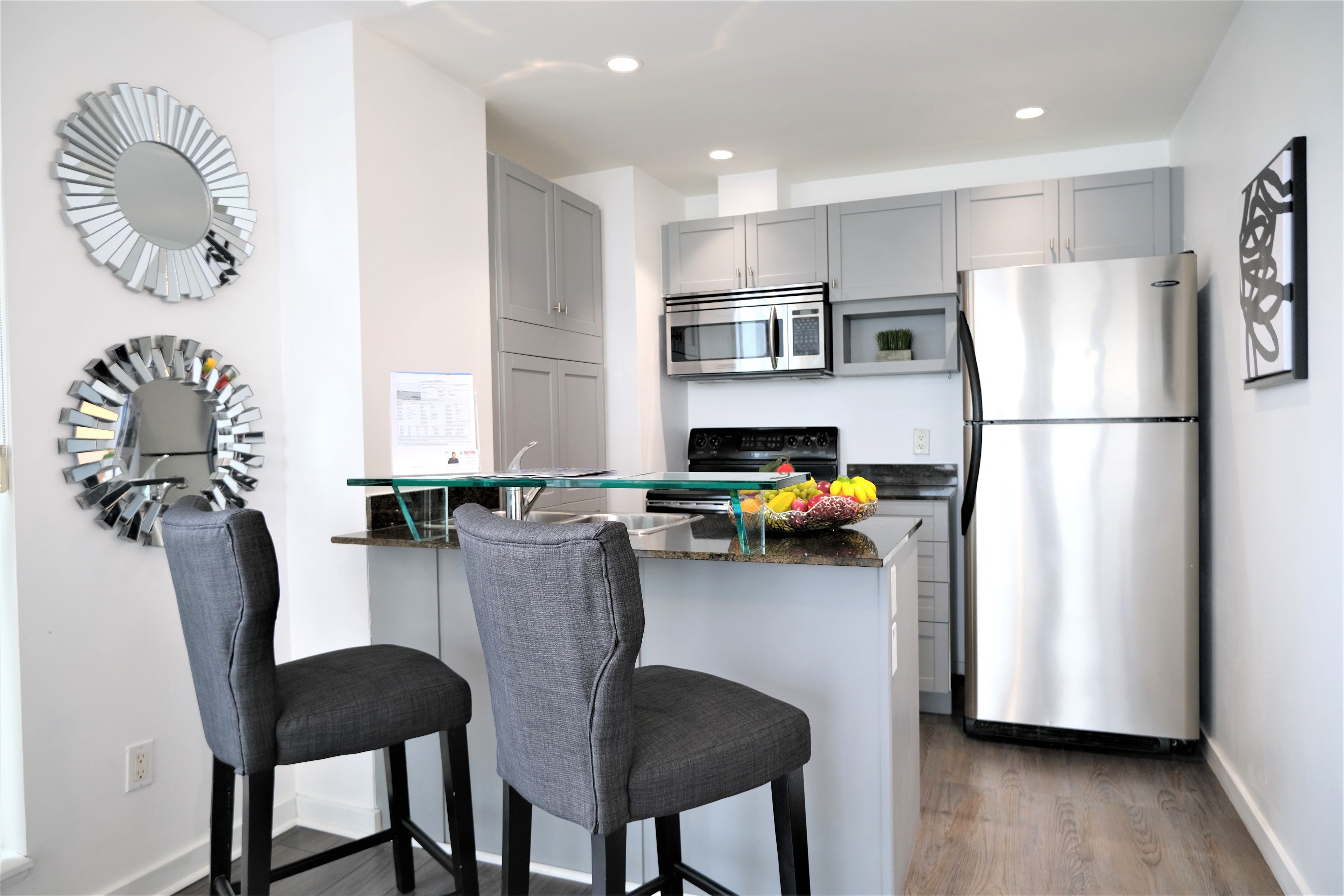• Modern kitchen featuring granite counters and stainless steel appliances.